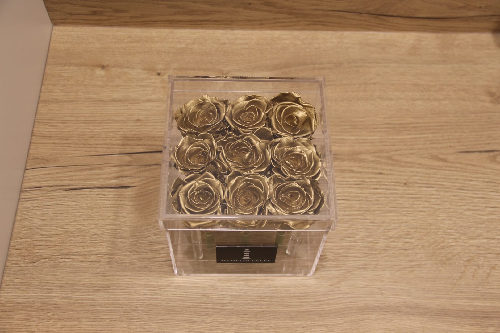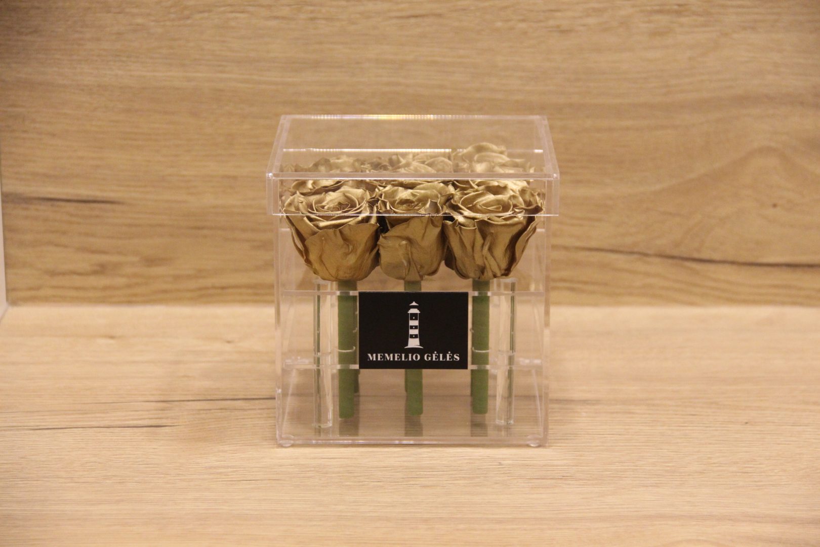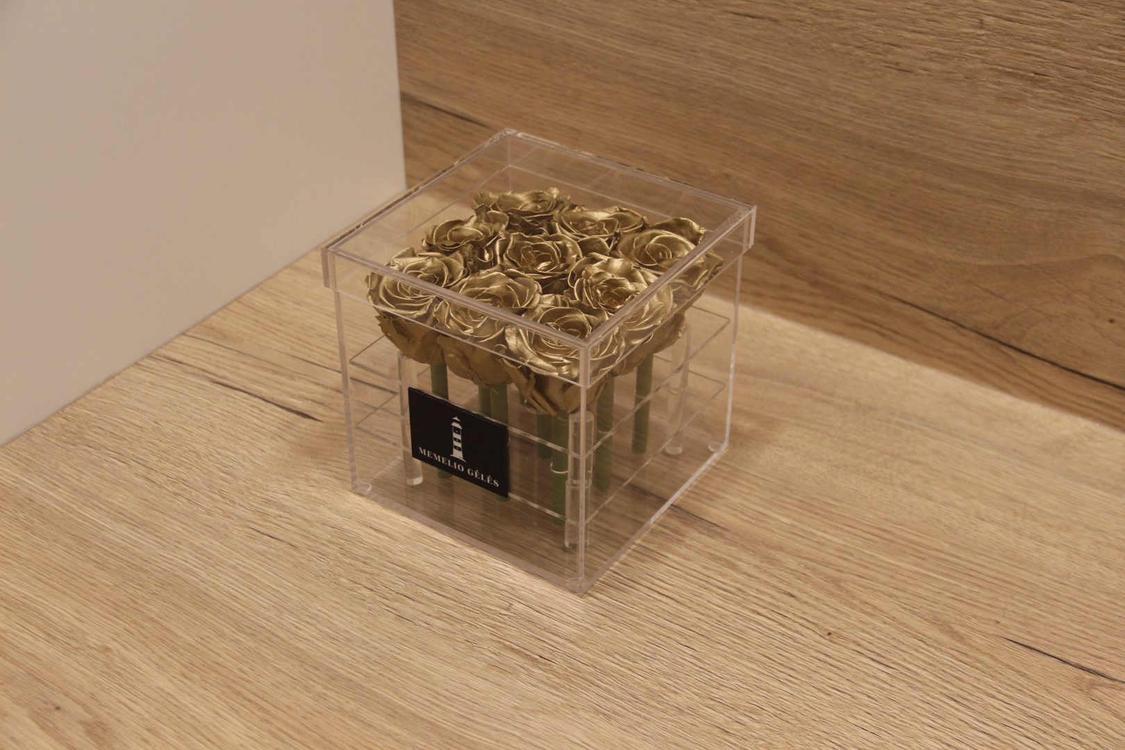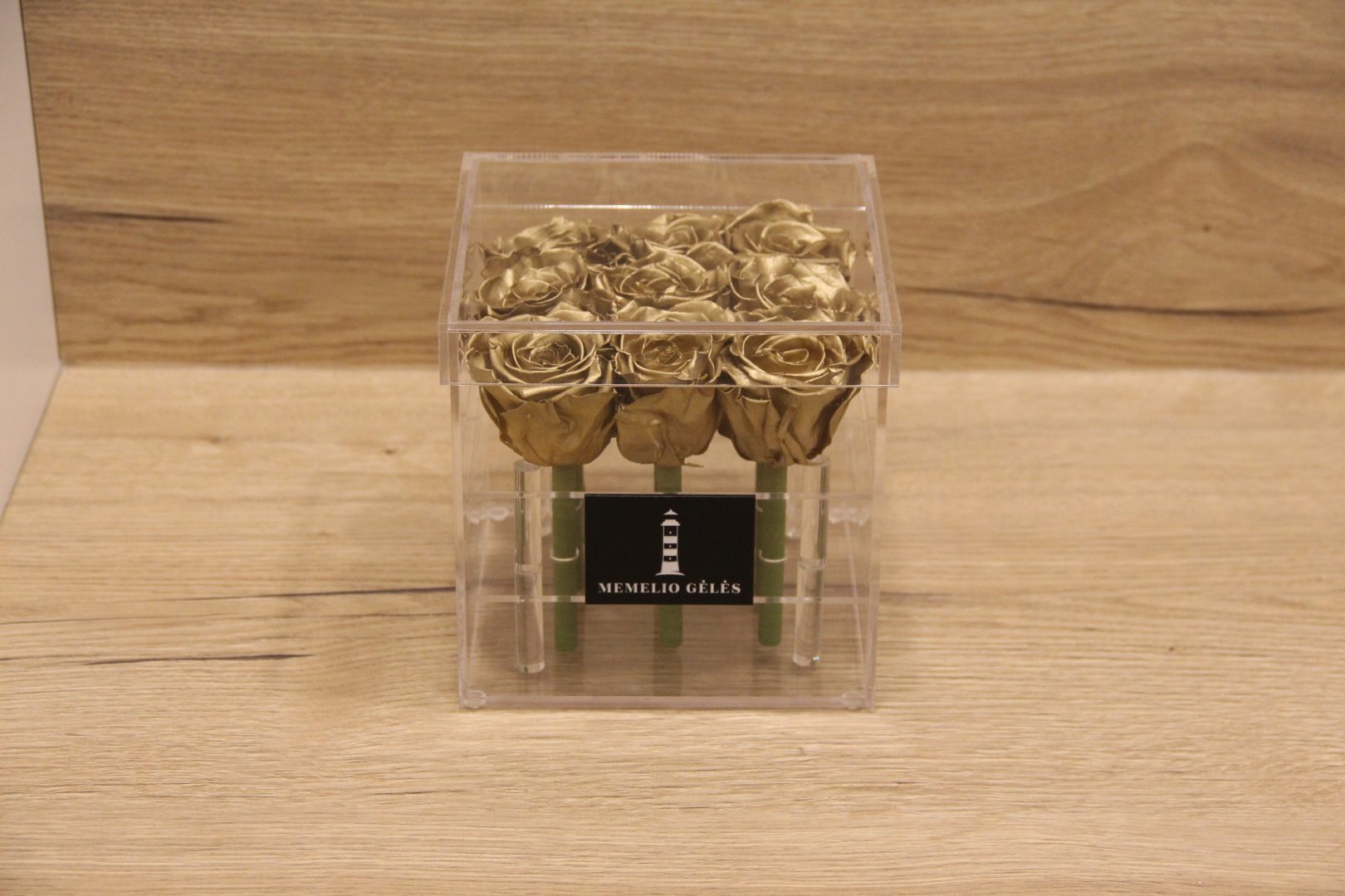 Išskirtinės prabangos 9 auksinės miegančios rožės akrilinėje dėžutėje, kurios Jus džiugins iki kelerių metų.