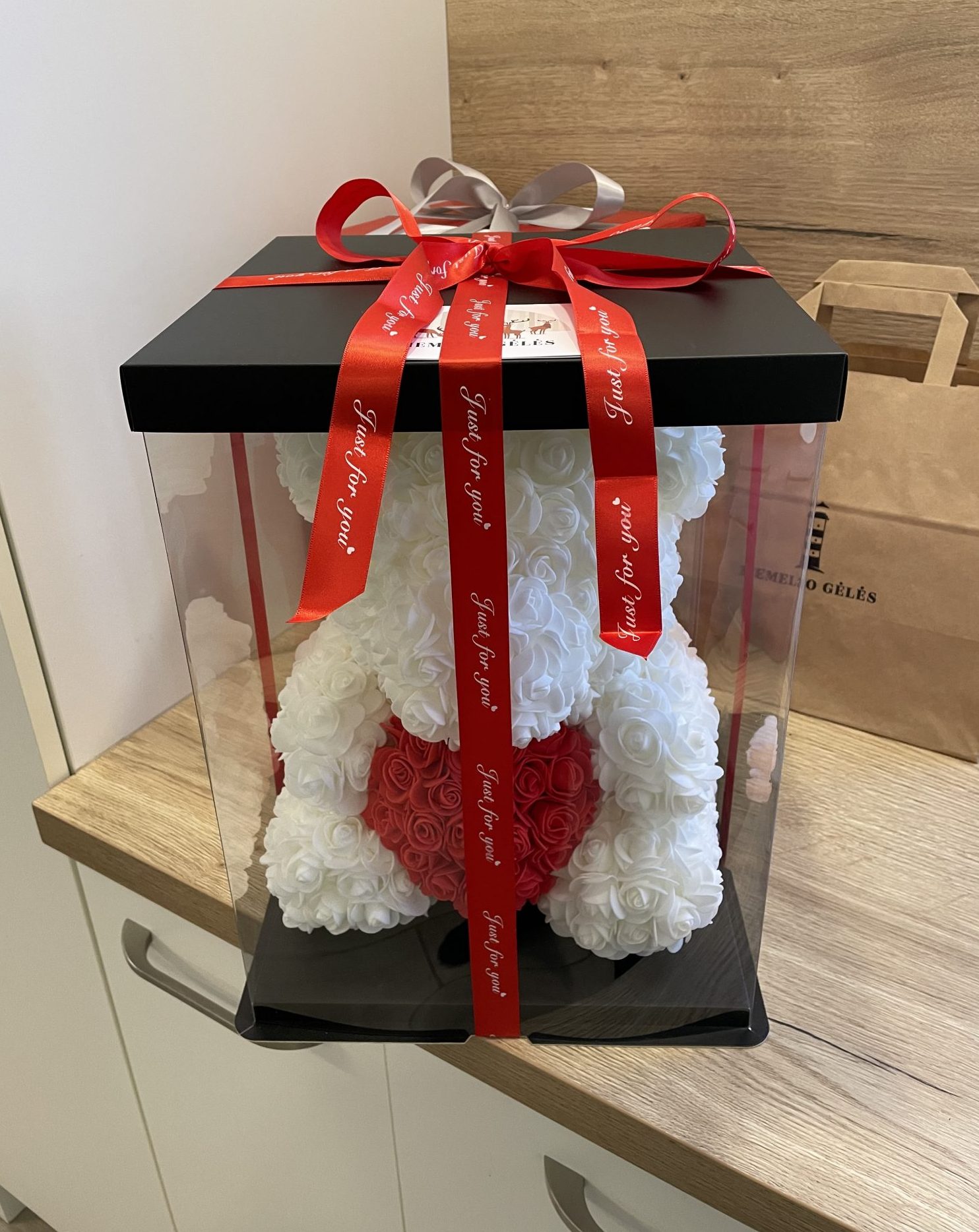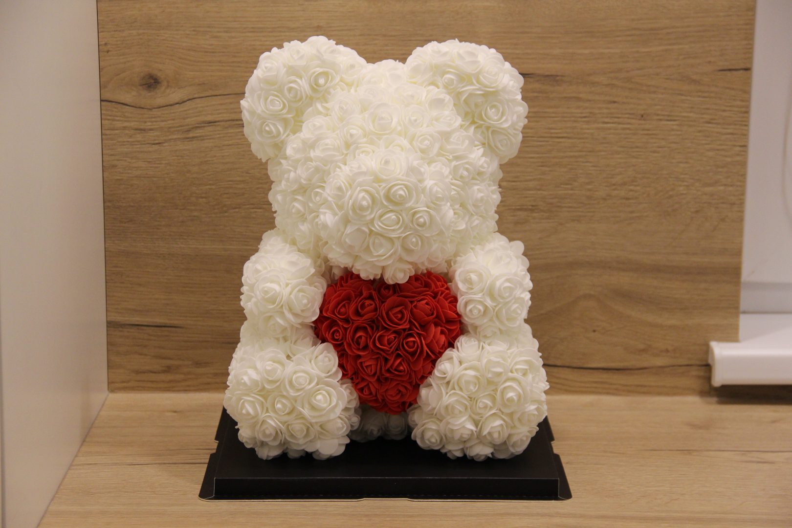 Rose teddy baltas dirbtinių rožių meškiukas su raudona širdele.