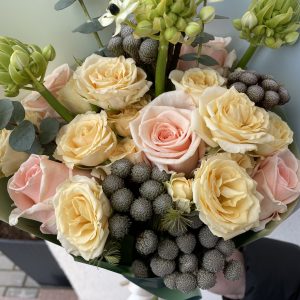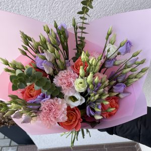 Puokštę sudaro 20 vienetų eustomų ir 9 vienetų rausvų rožių.