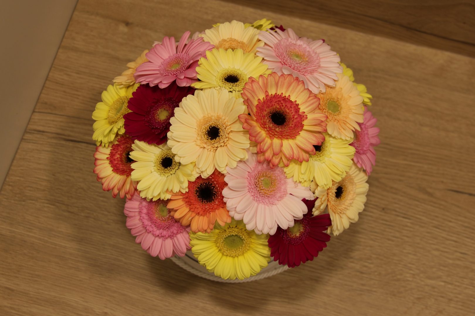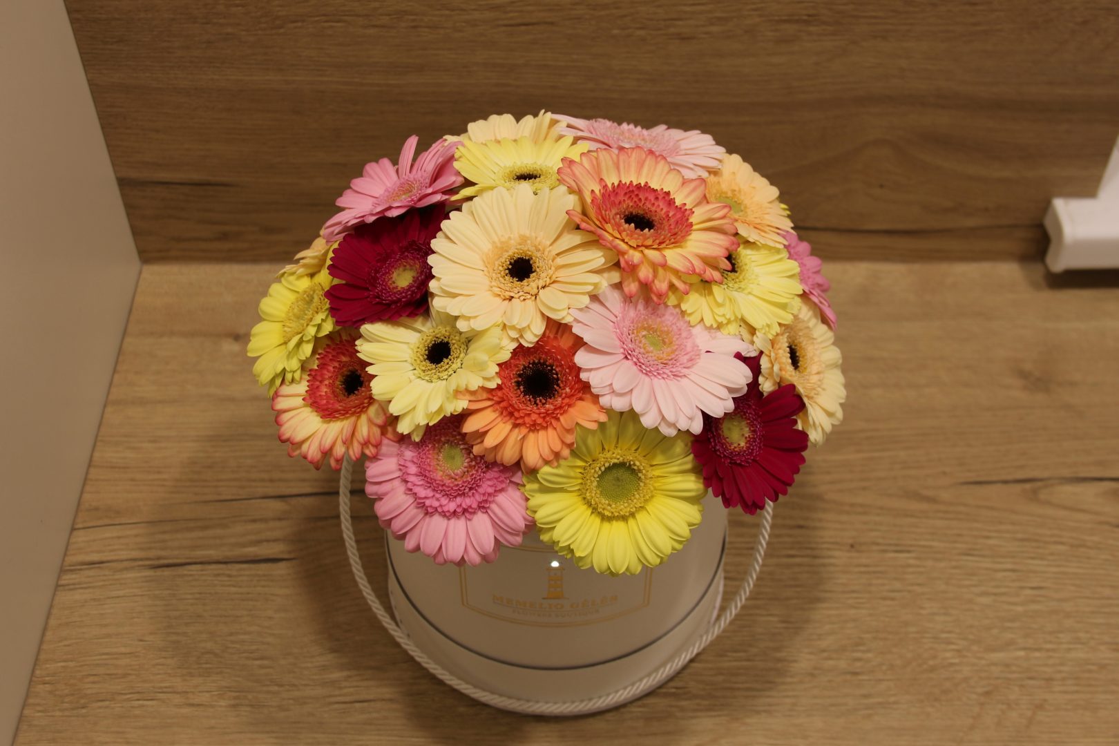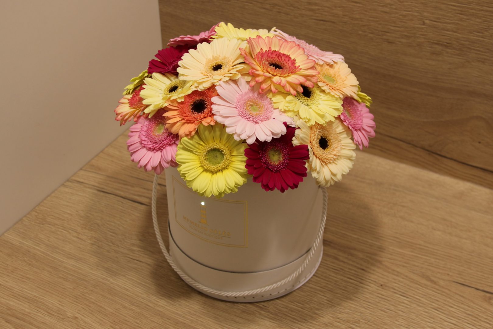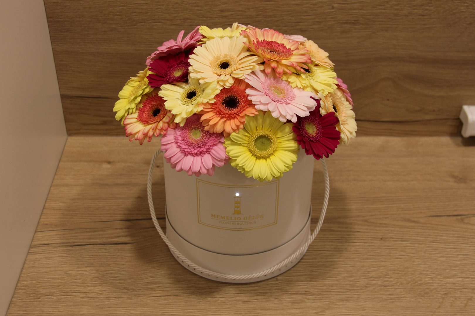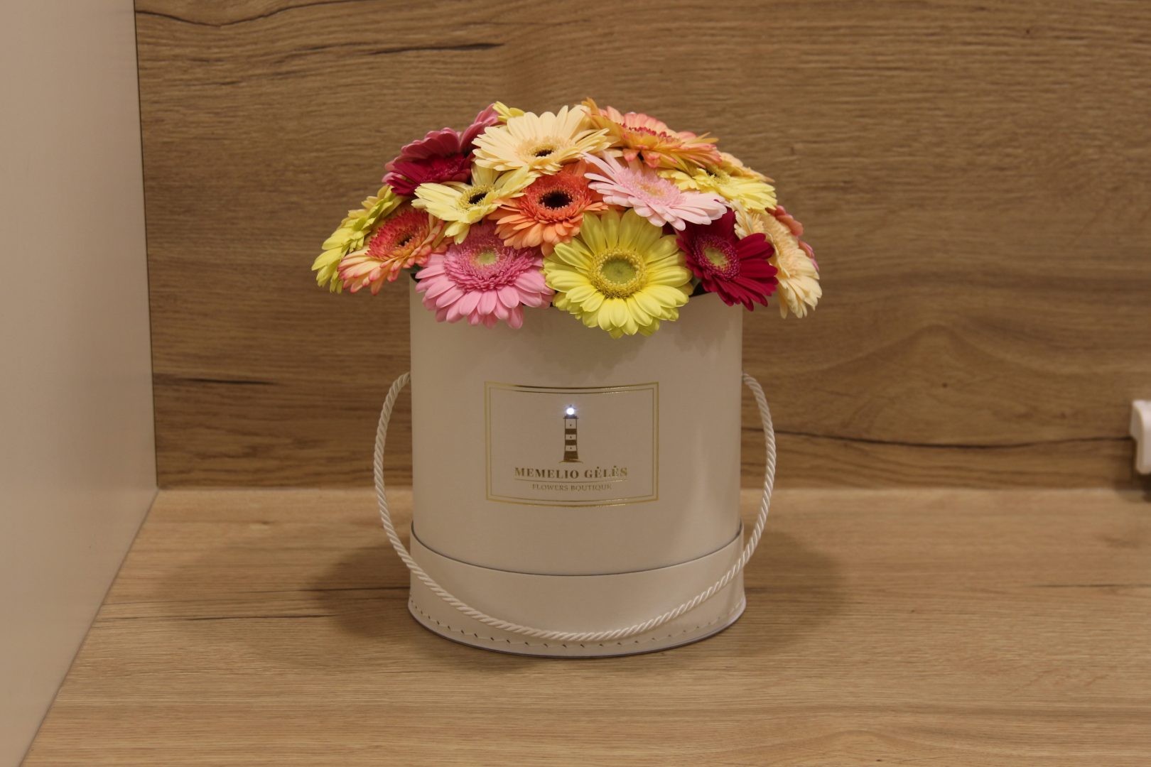 Pastelinių spalvų gerberos žybsinčio švyturio dėžutėje.