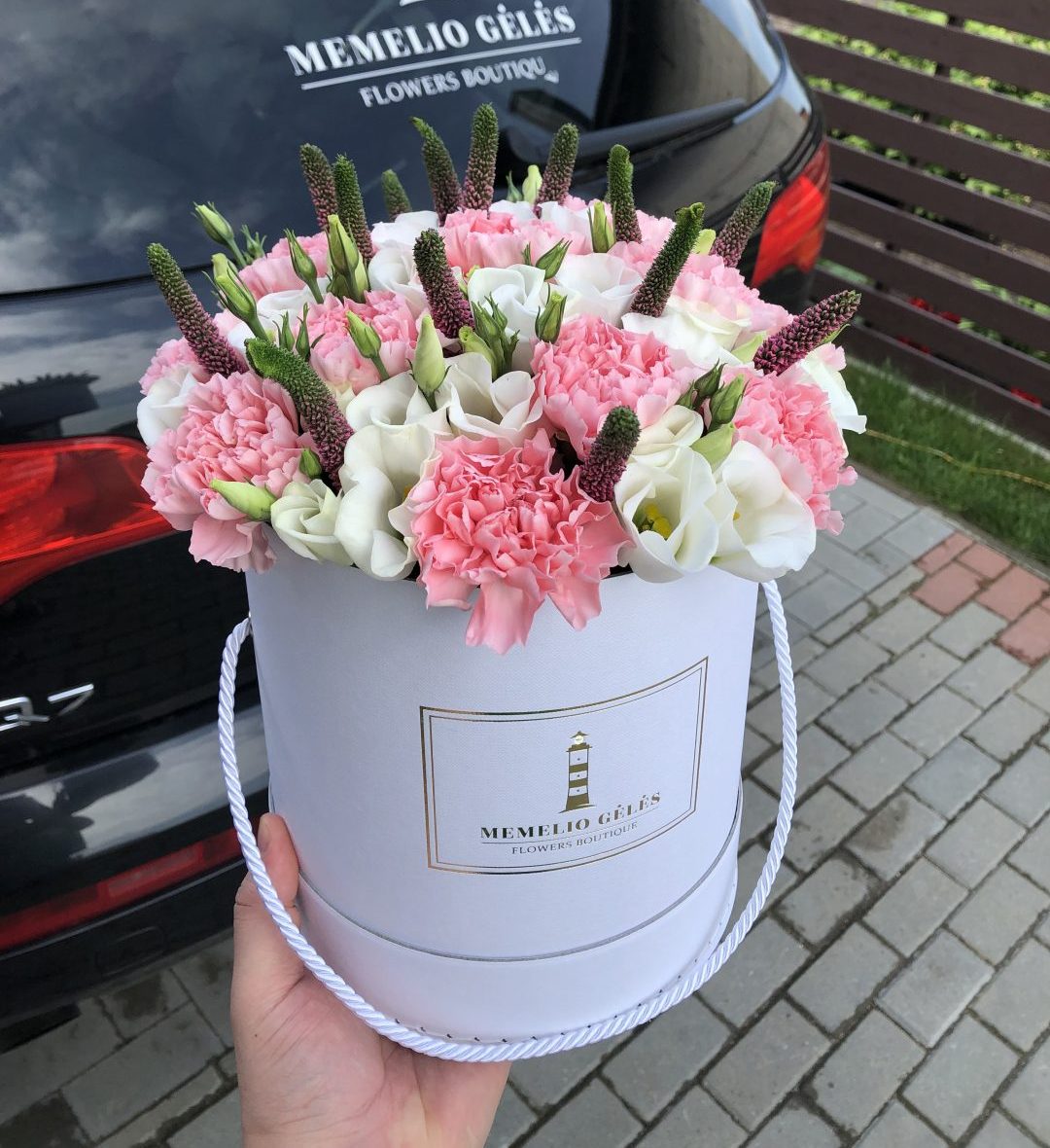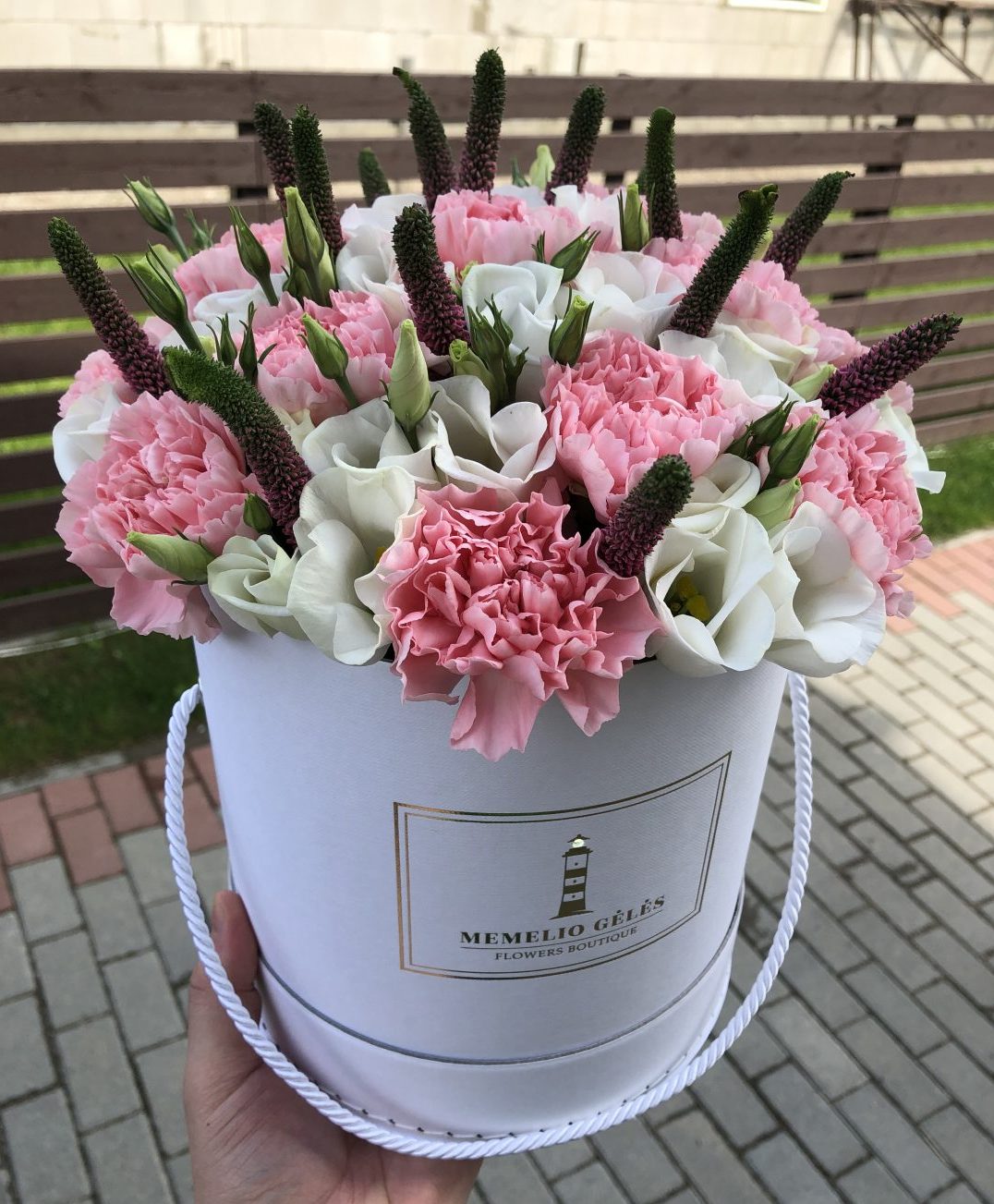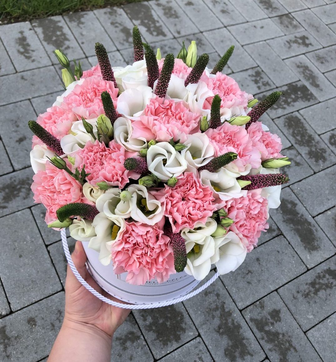 Rausvi gvazdikai, baltos eustomis ir žaluma žybsinčio švyturio dėžutėje