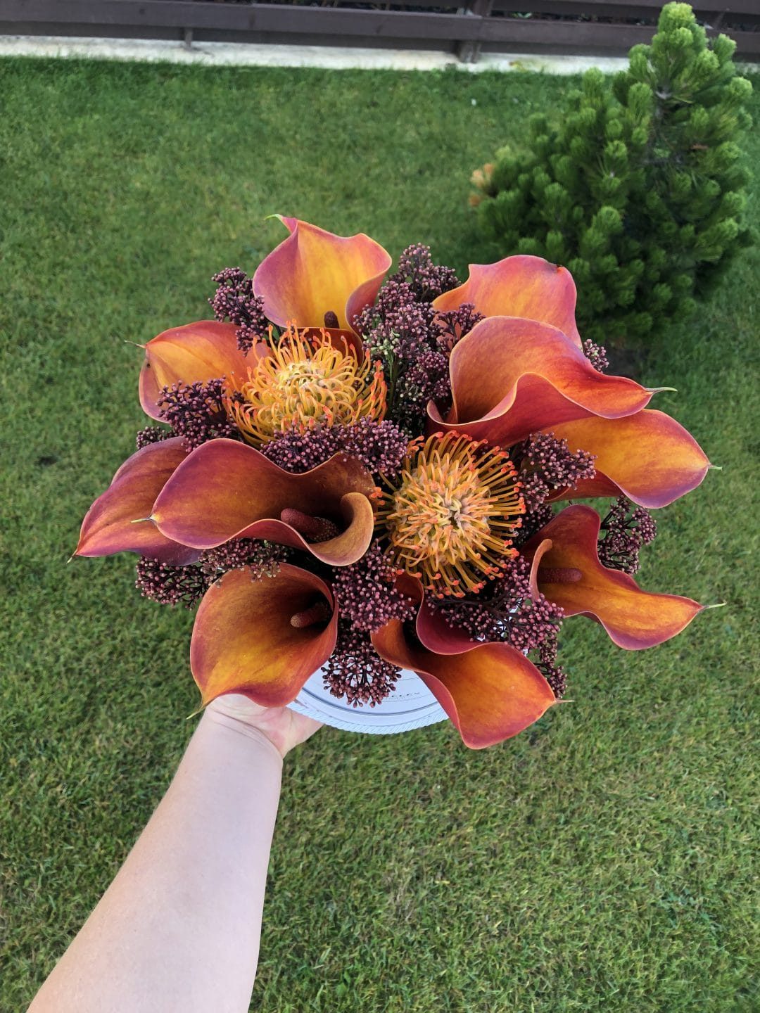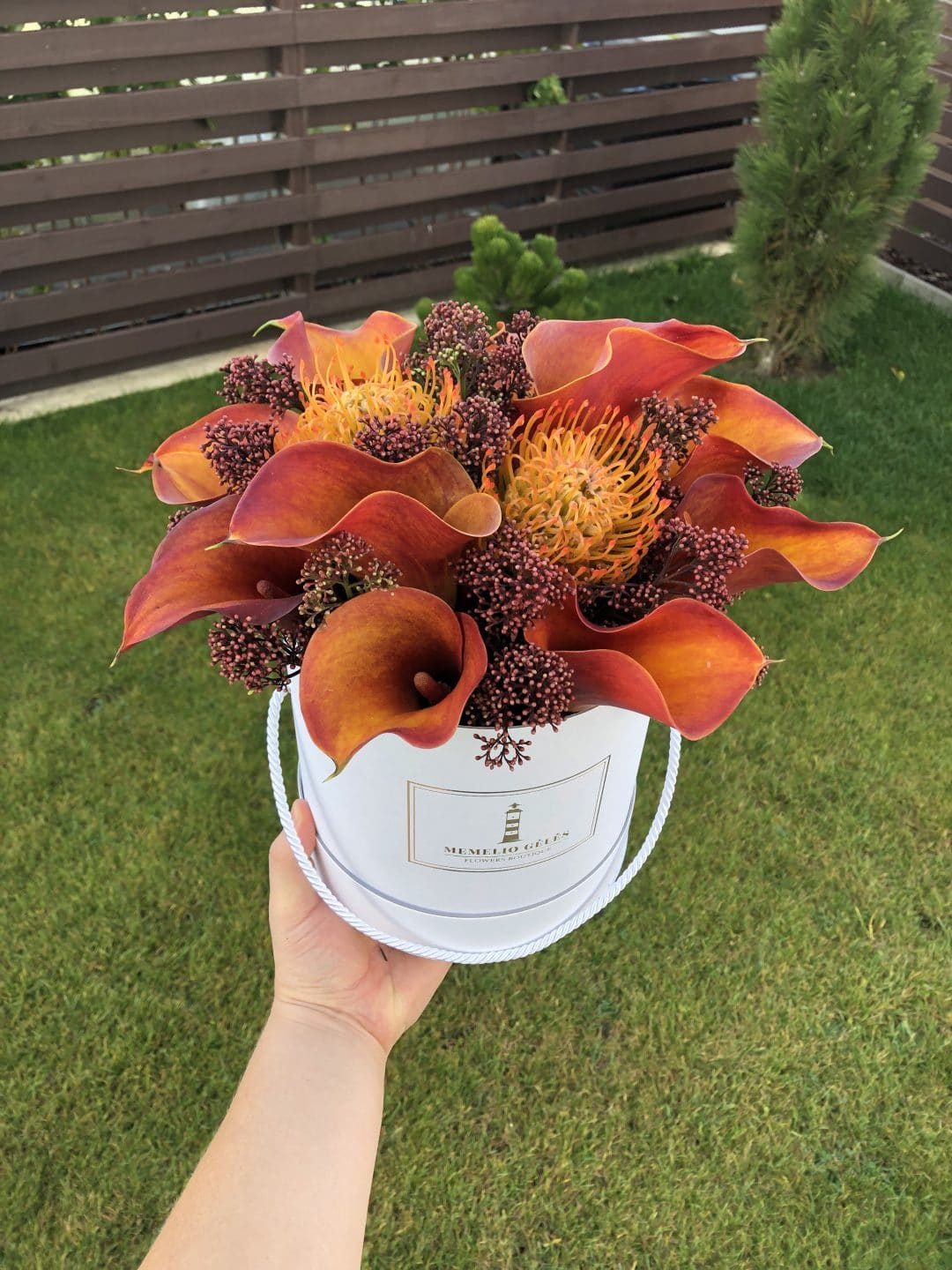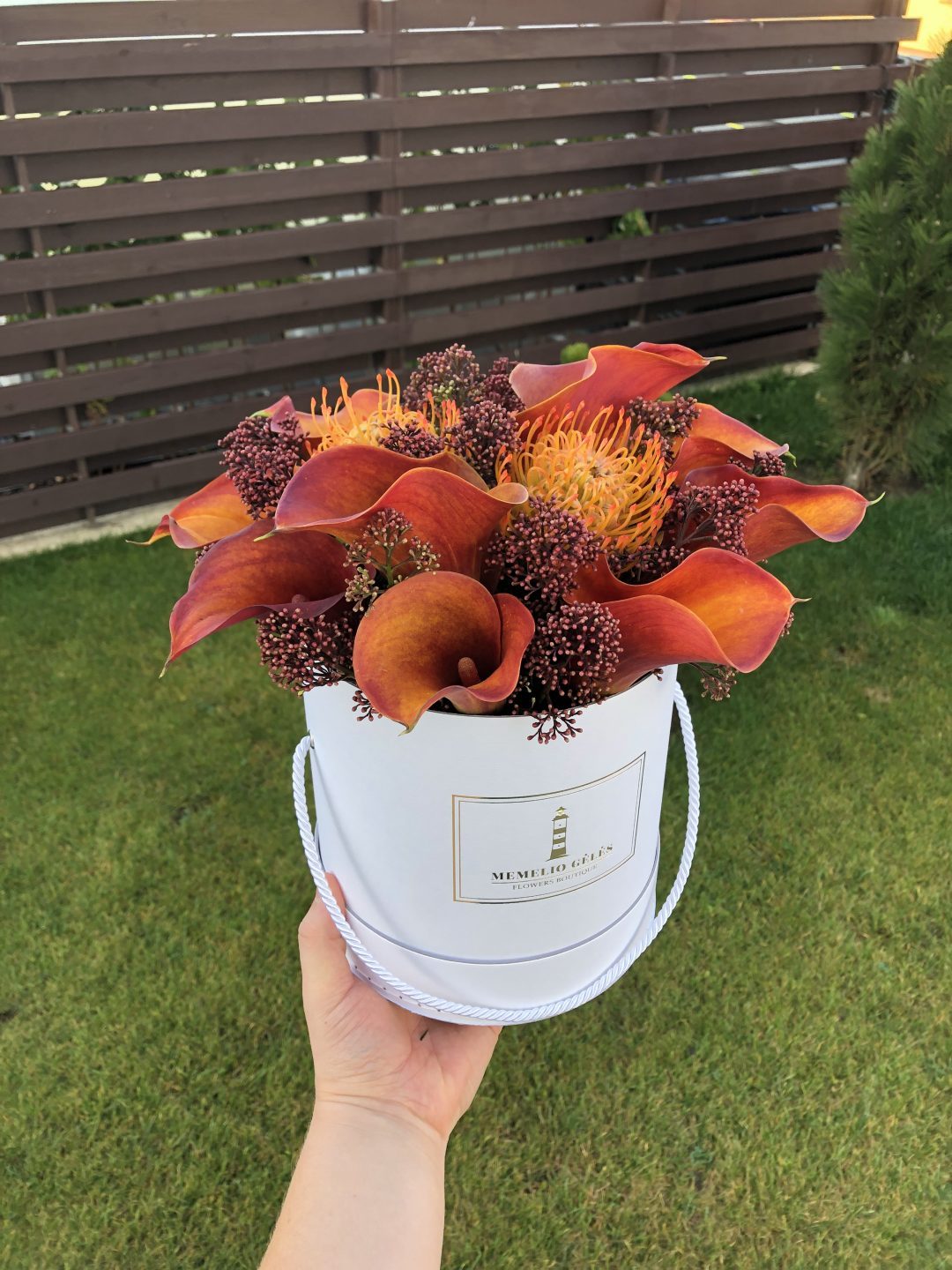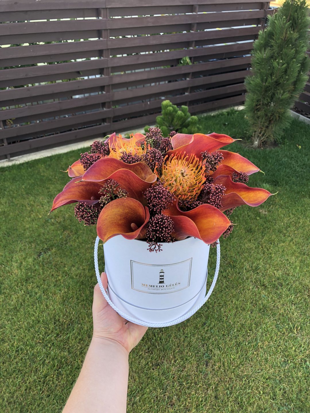 Oranžinės kalijos ir gaismiai (leukospermiai) bei bordo žaluma žybsinčio švyturio dėžutėje.
