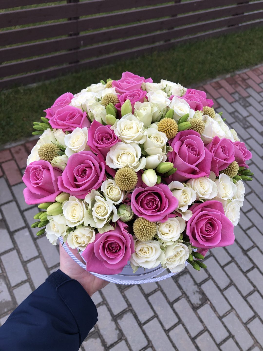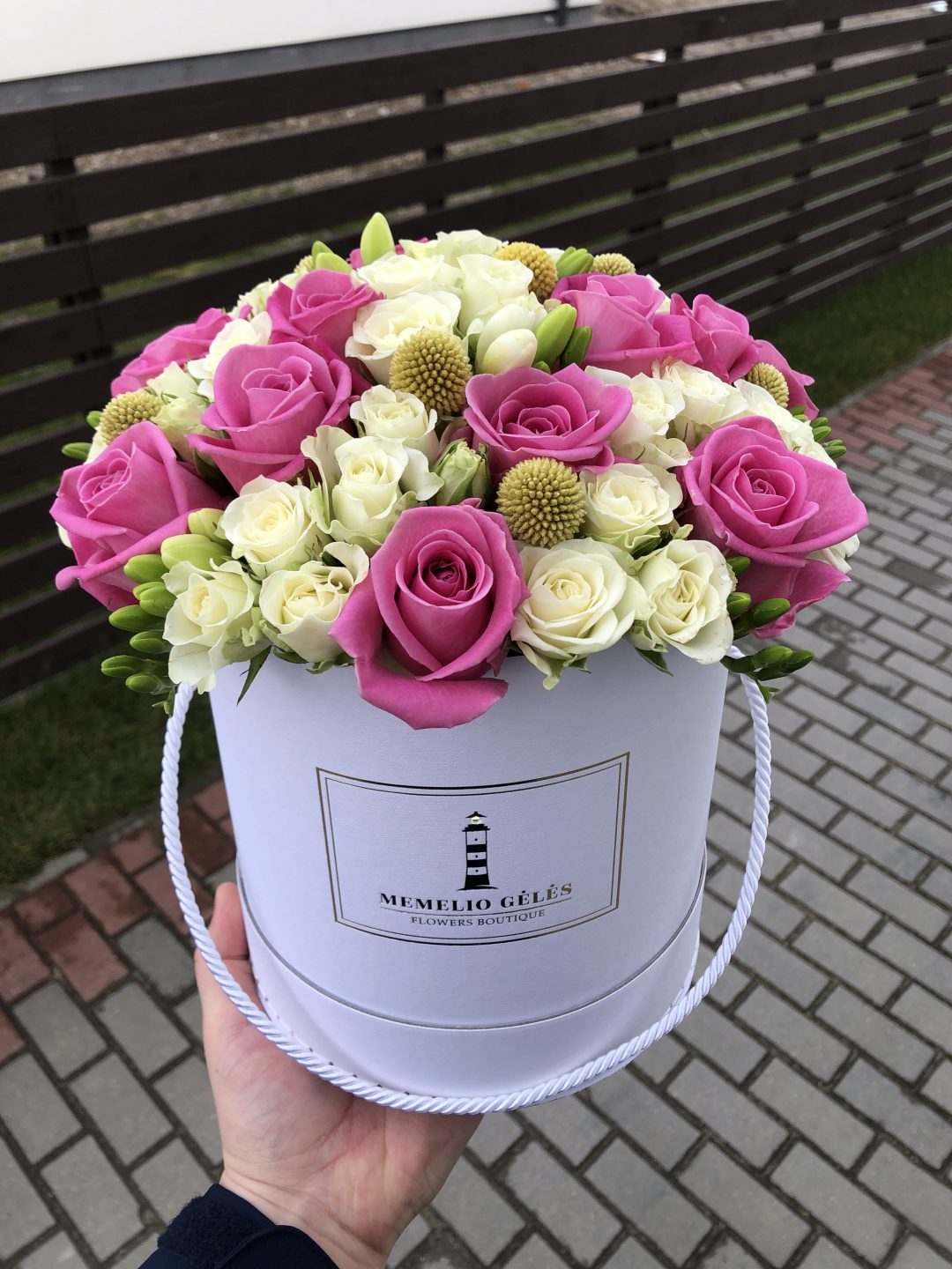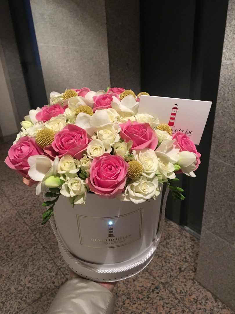 Rausvos rožės, baltos rožytės ir frezijos bei geltonos kraspedijos.