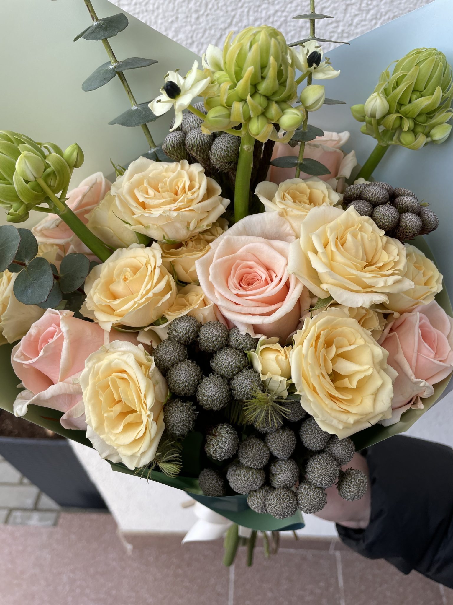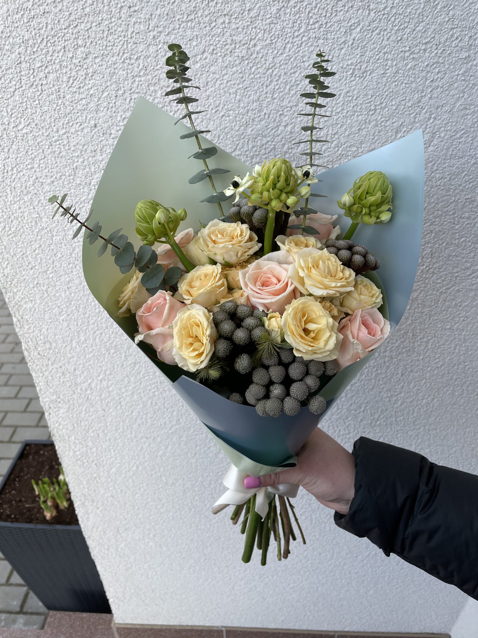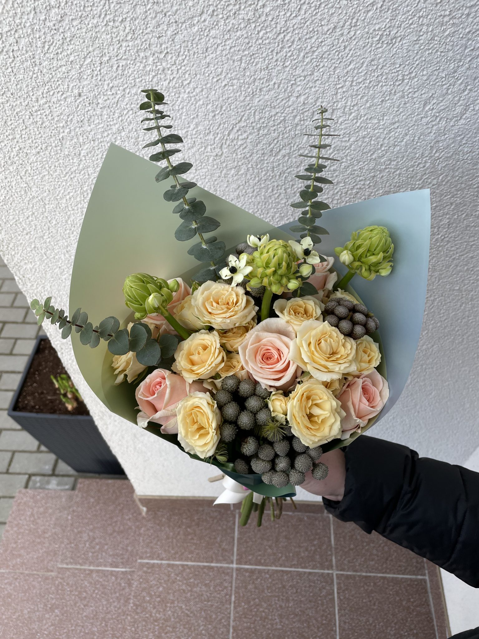 Įvairių gėlių puokštė iš apytiksliai 20 žiedų: 5 lašišinės rožės, 5 šviesiai persikinės smulkiažiedės rožytės, 3 ornitai, 4 brunijos ir 3 eukaliptų žaluma.