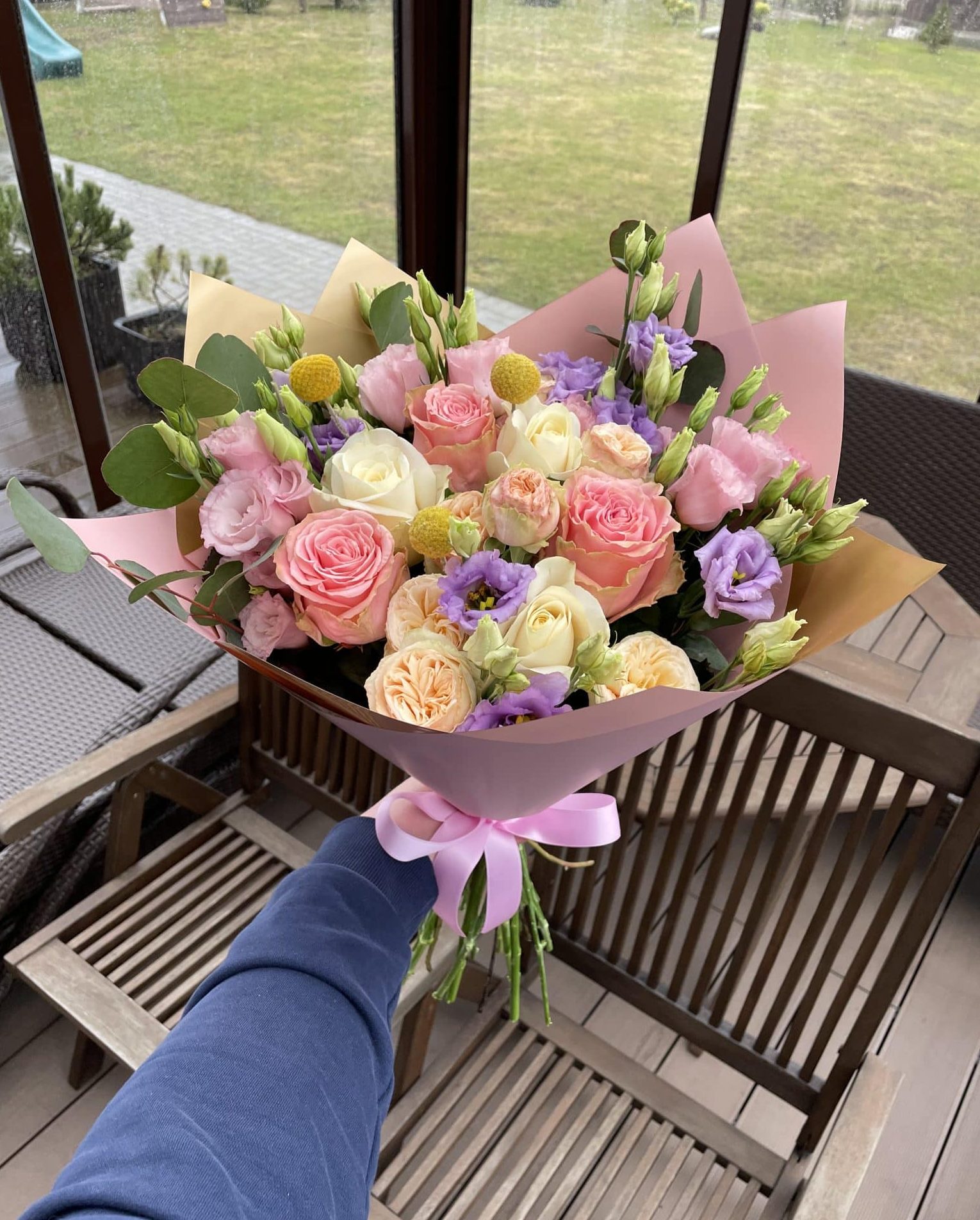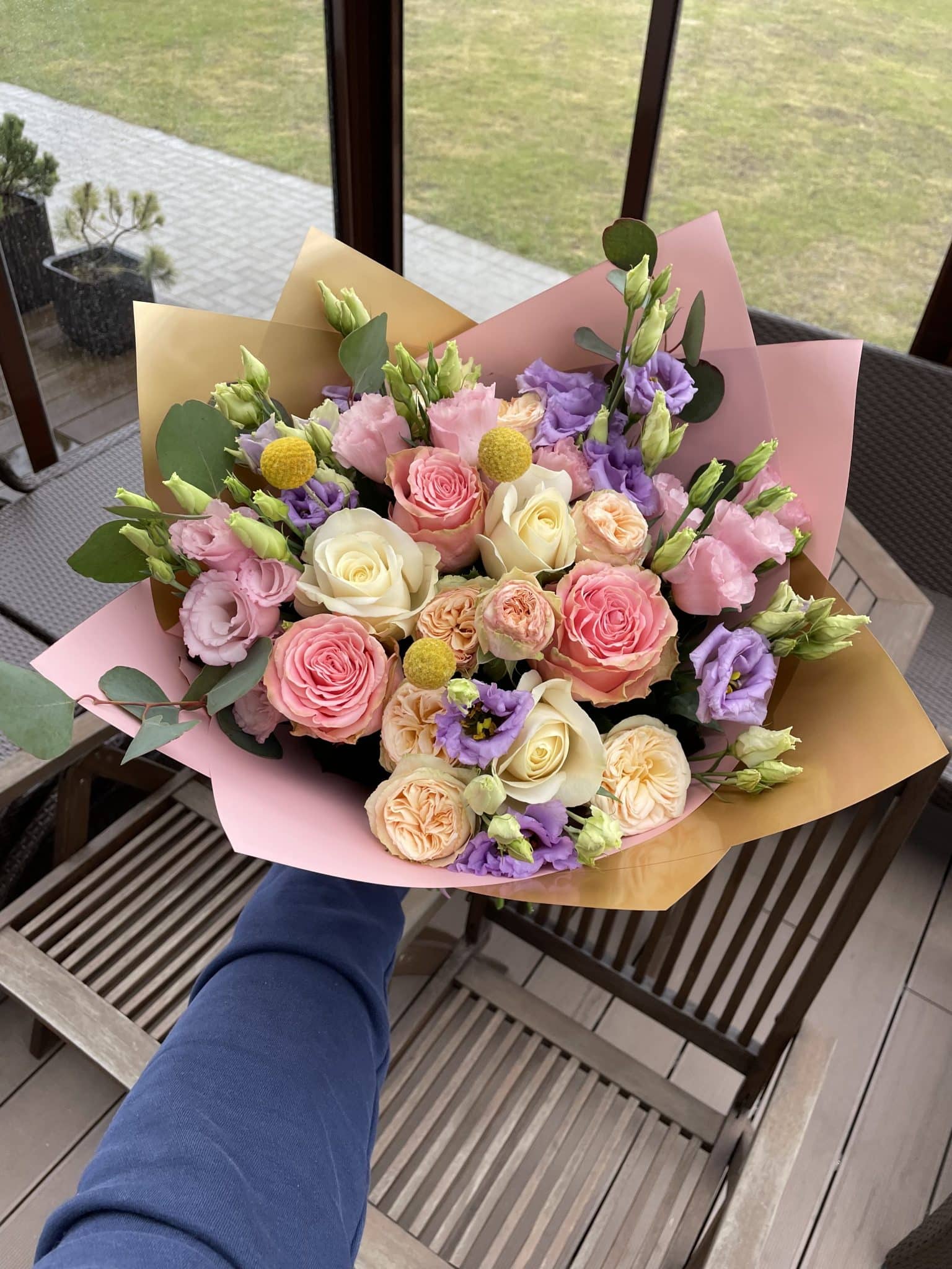 Įvairių gėlių puokštė iš 19 žiedų: ryškiai rausvos rožės, šviesiai persikinės bijūninės smulkiažiedės rožytės, kreminės rožės, rausvos ir levandinės eustomos, geltonos kraspedijos ir eukalipto žaluma.