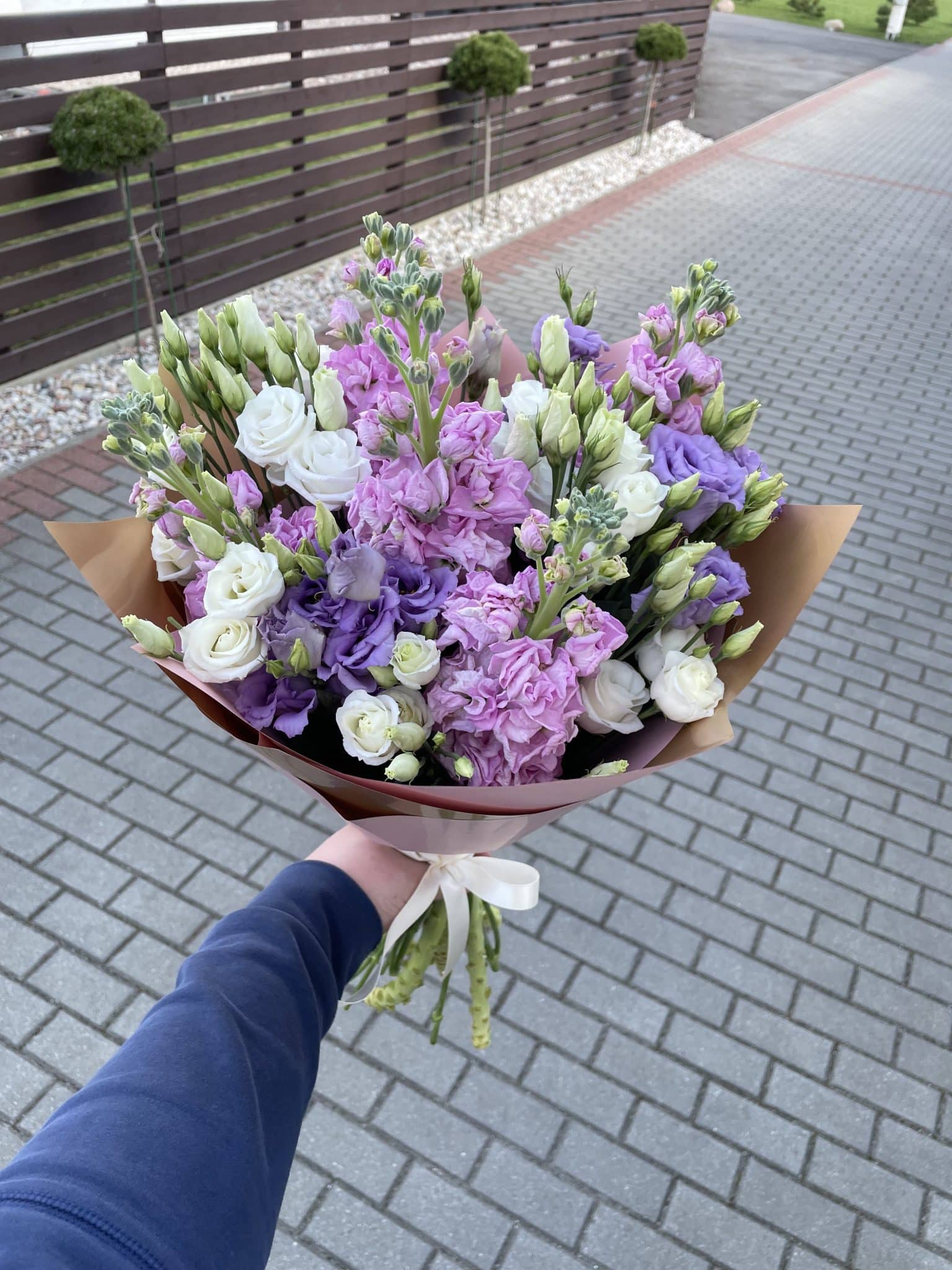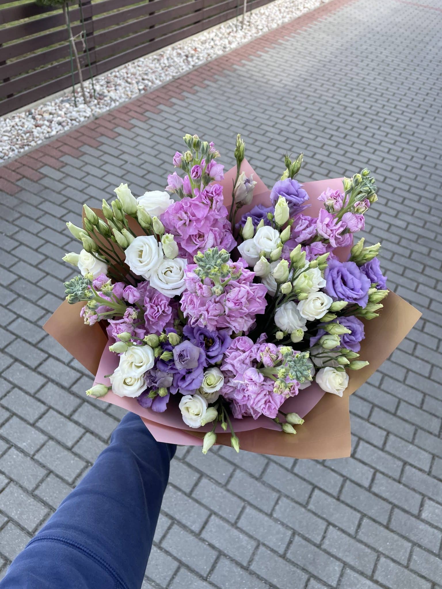 Įvairių gėlių puokštė iš 11 žiedų: rausvos kvapų bombos matiolos, levandinės ir baltos eustomos.