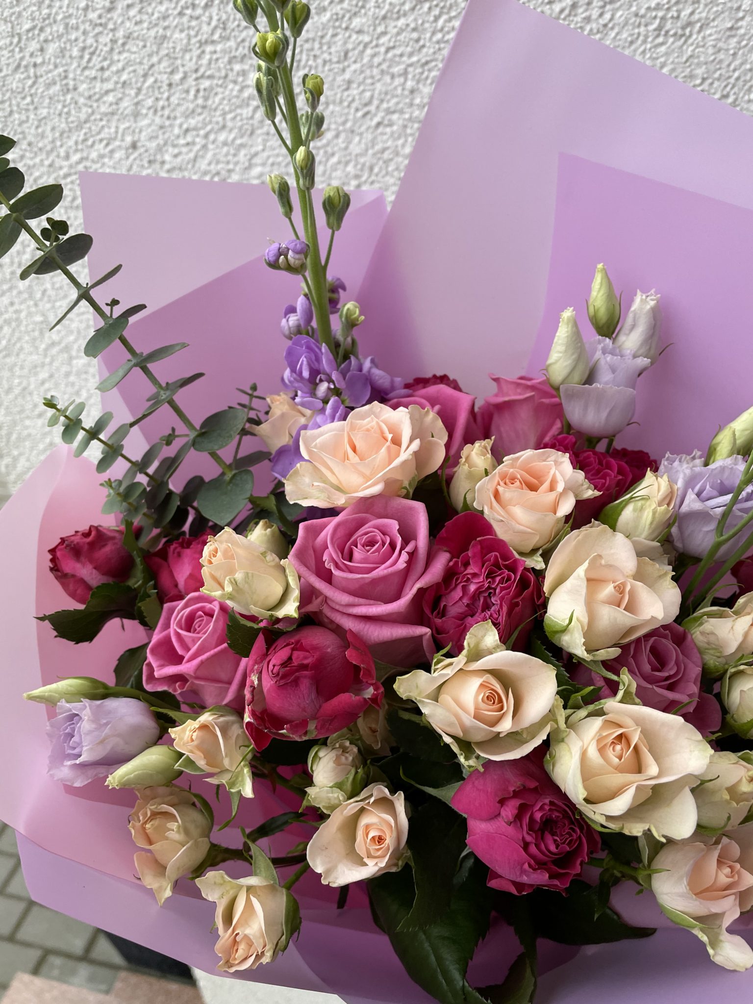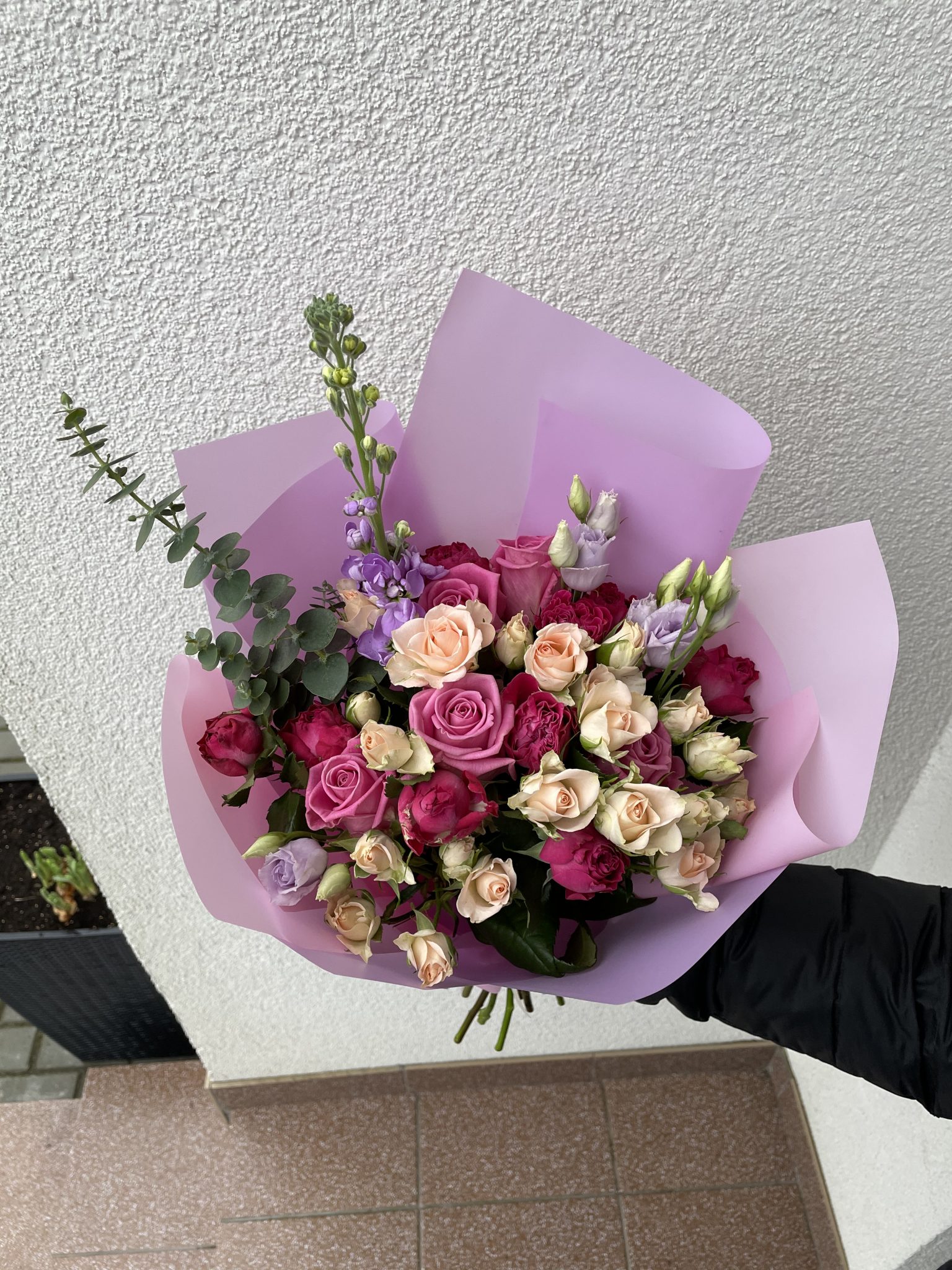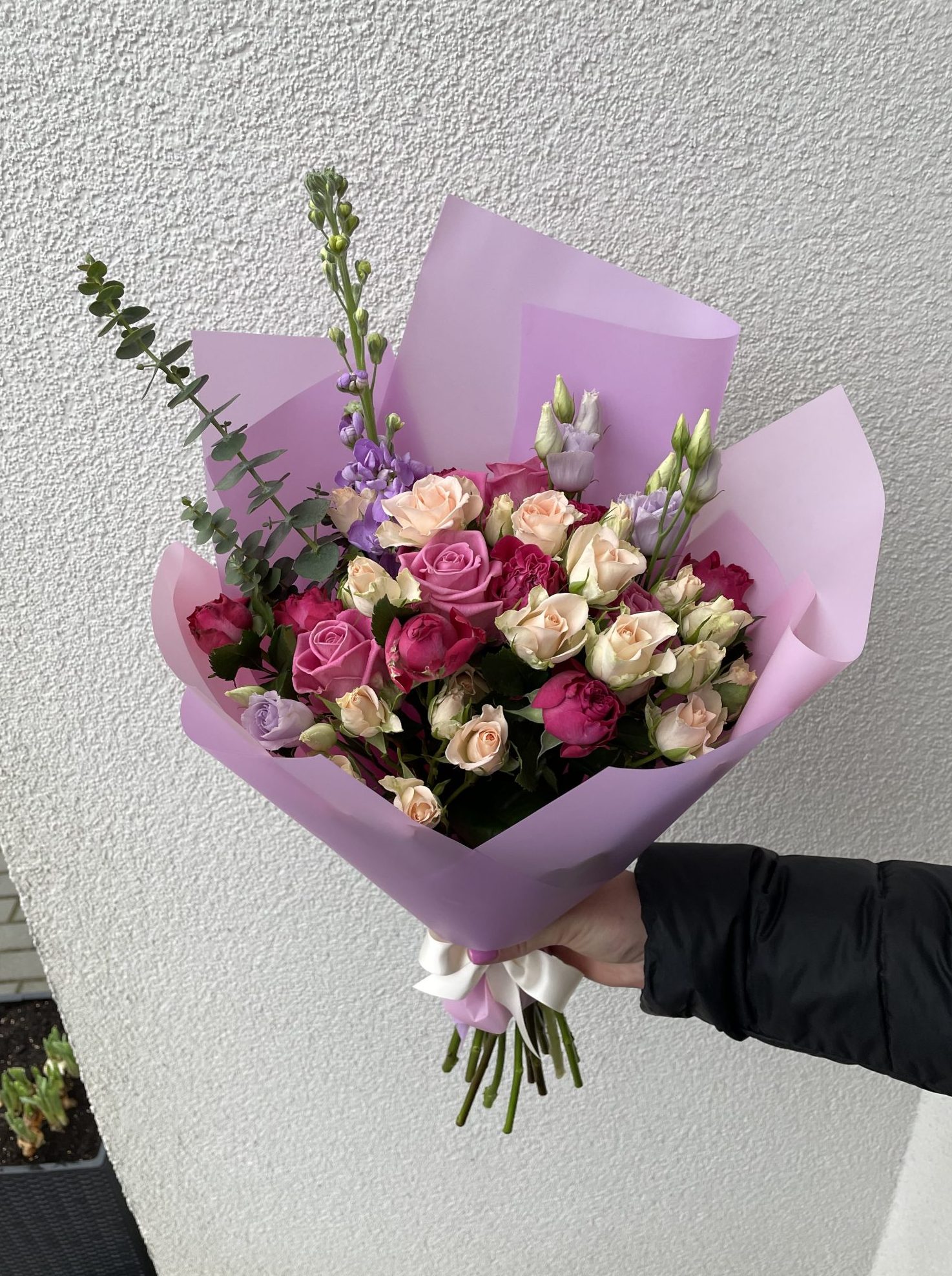 Įvairių gėlių puokštė: rausvos rožės, levandinės matiolos ir eustomos, šviesiai perskinės smulkiažiedės rožytės, tamsiai rausvos bijūninės smulkiažiedės rožytės, žaluma – eukaliptas.