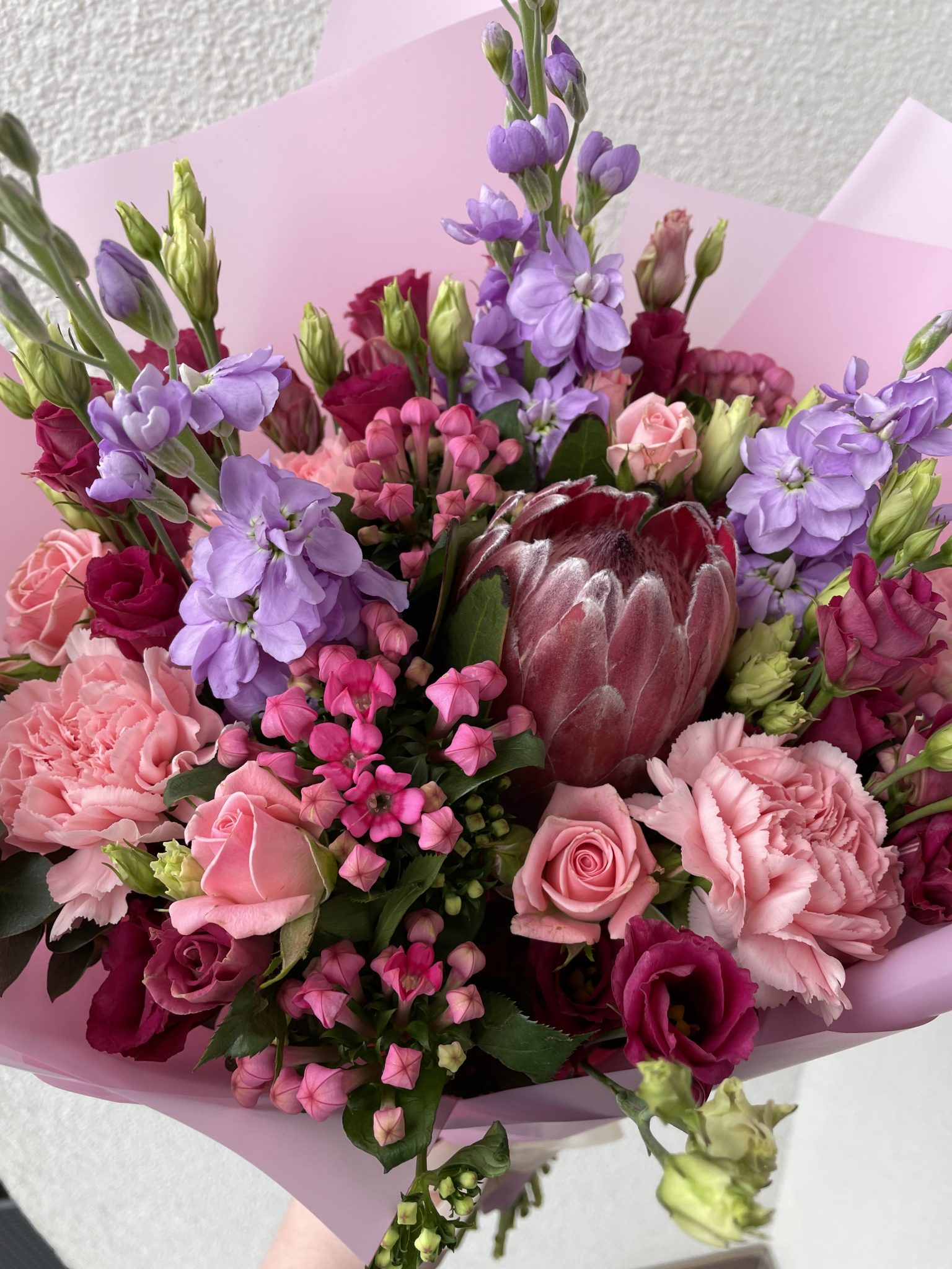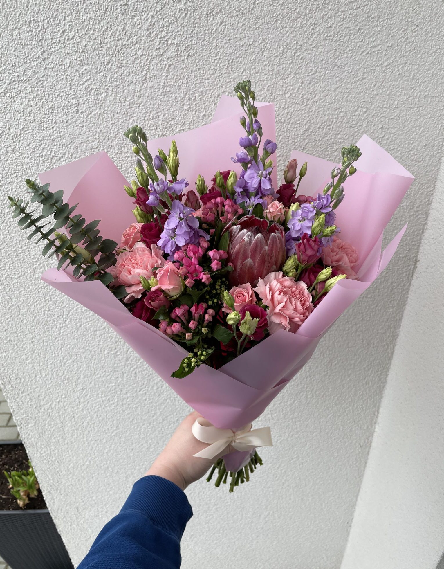 Įvairių gėlių puokštė: protėja, rausvi gvazdikai, vyšninės eustomos, šviesiai rausvos smulkiažiedės rožytės, levandinės matiolos, rausvos buvardijos bei eukaliptų žaluma.