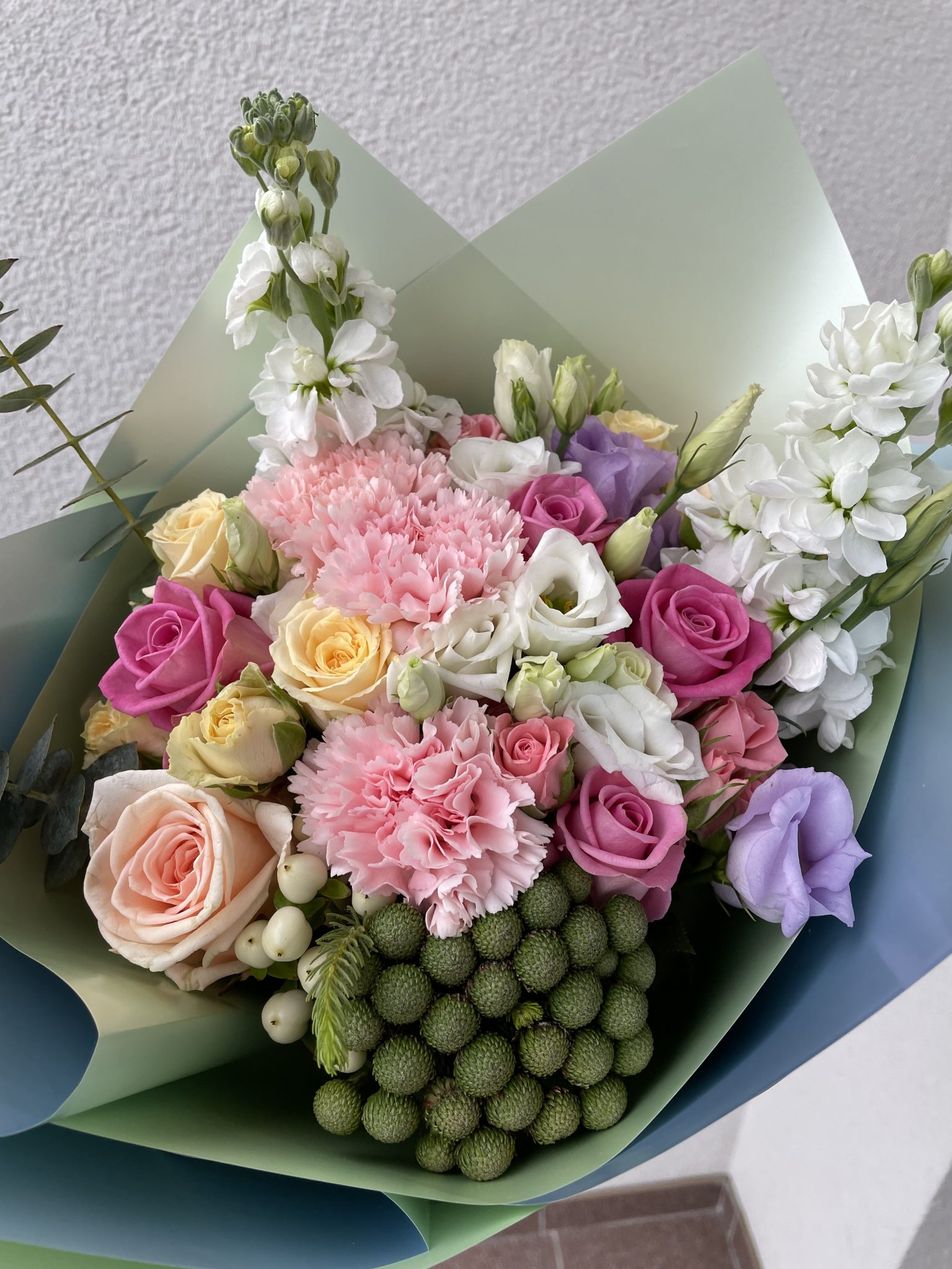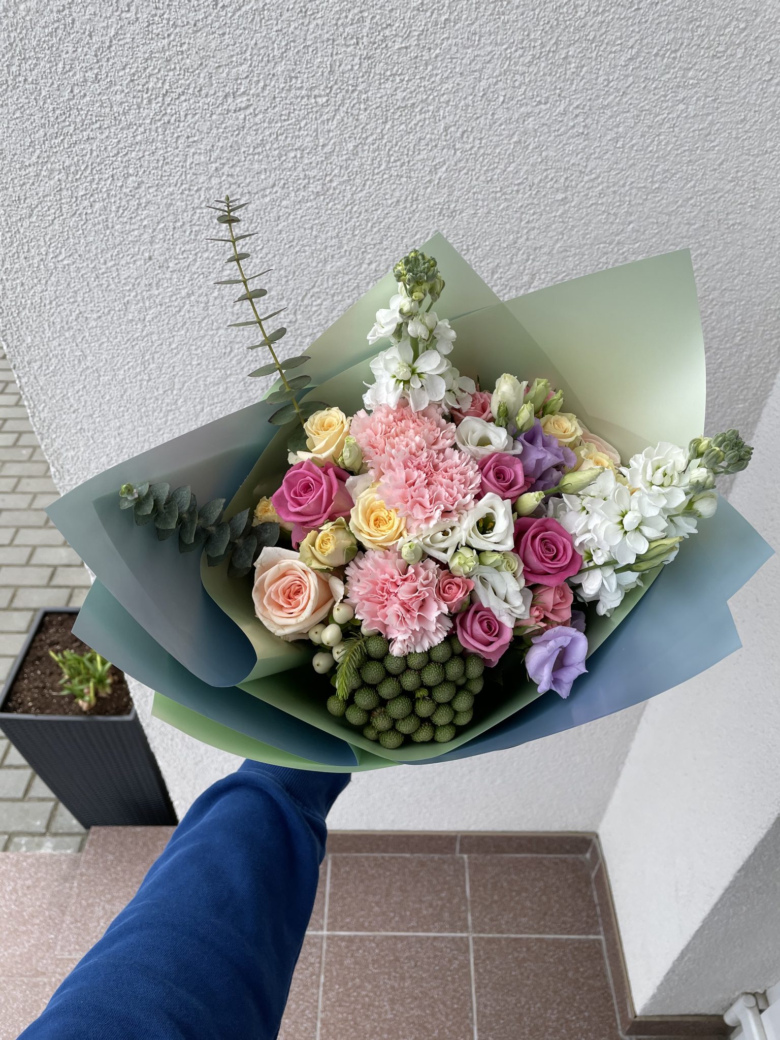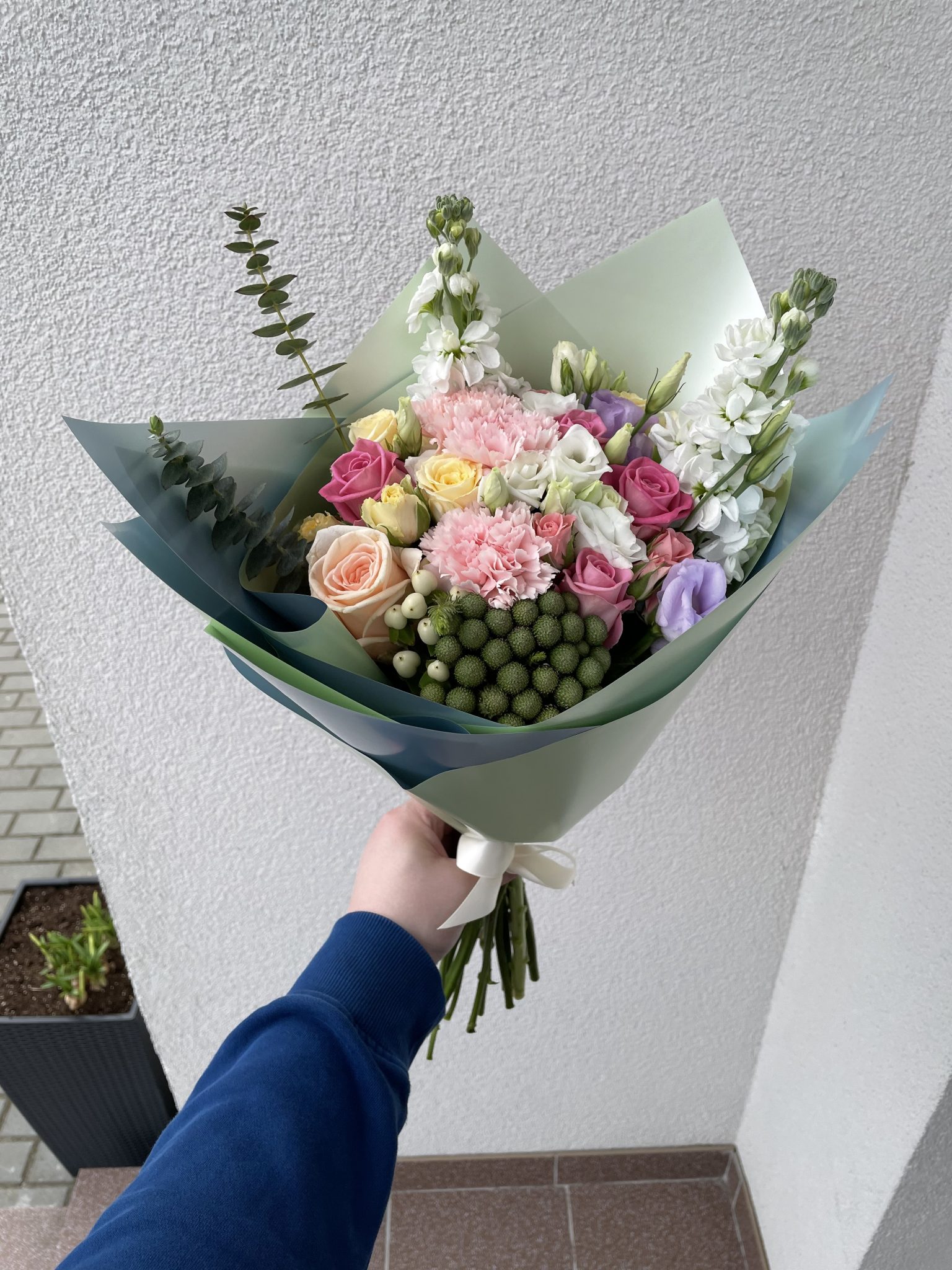 Įvairių gėlių puokštė: rausvos ir lašišinės rožės, baltos ir levandinės eustomos, rausvi gvazdikai, baltos matiolos, balti hiperikumai, žaluma – brunija ir eukaliptai.