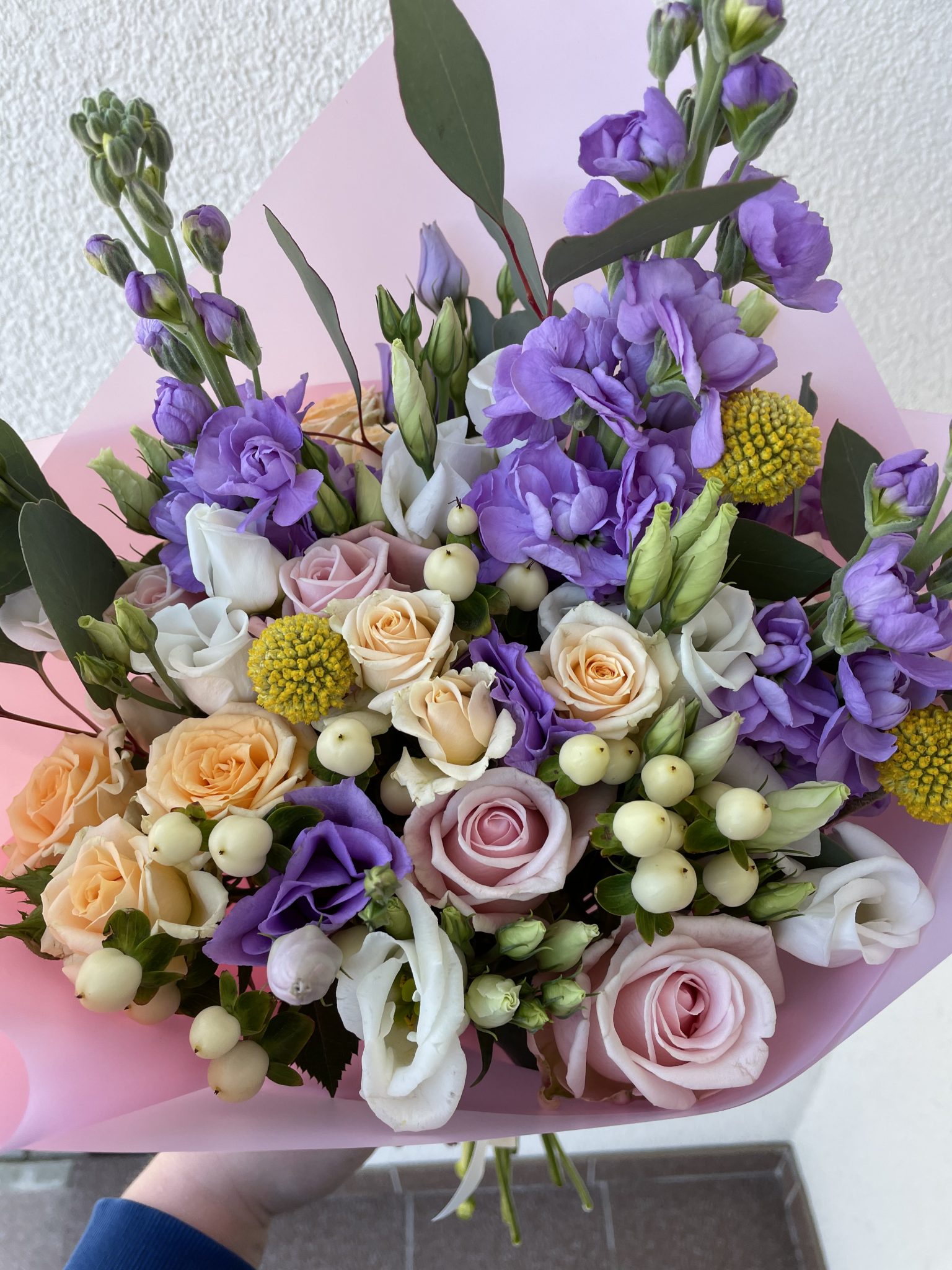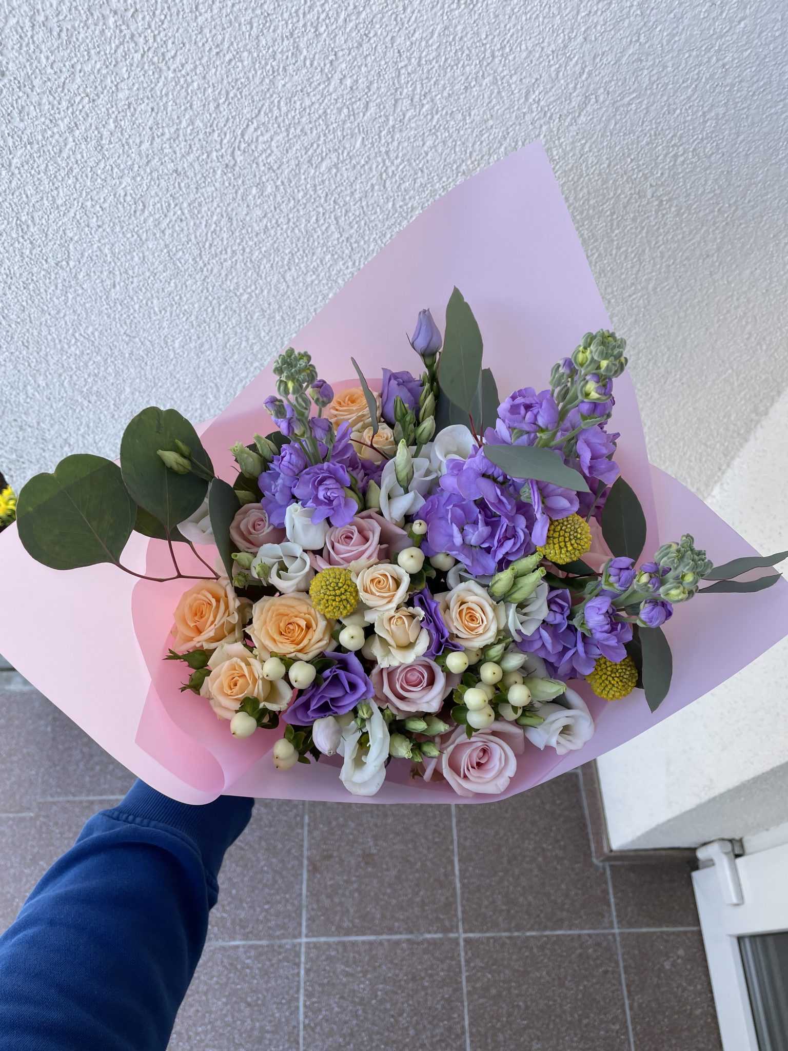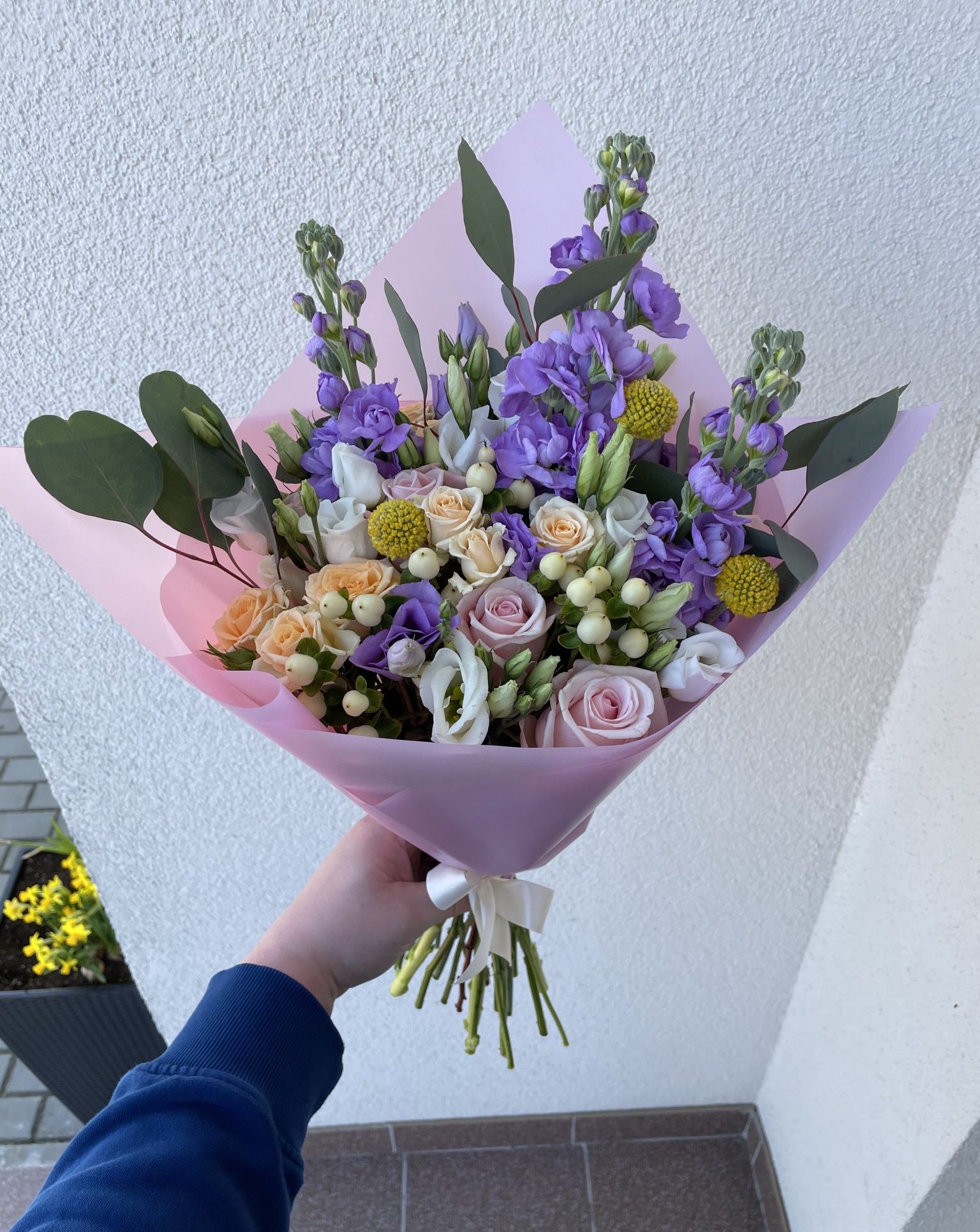 Įvairių gėlių puokštė iš apytiksliai 25 žiedų: pastelinės rožės, baltos ir levandinės eustomos, persikinės smulkiažiedės rožytės, levandinės matiolos, balti hiperikumai, geltonos kraspedijos ir eukaliptai.