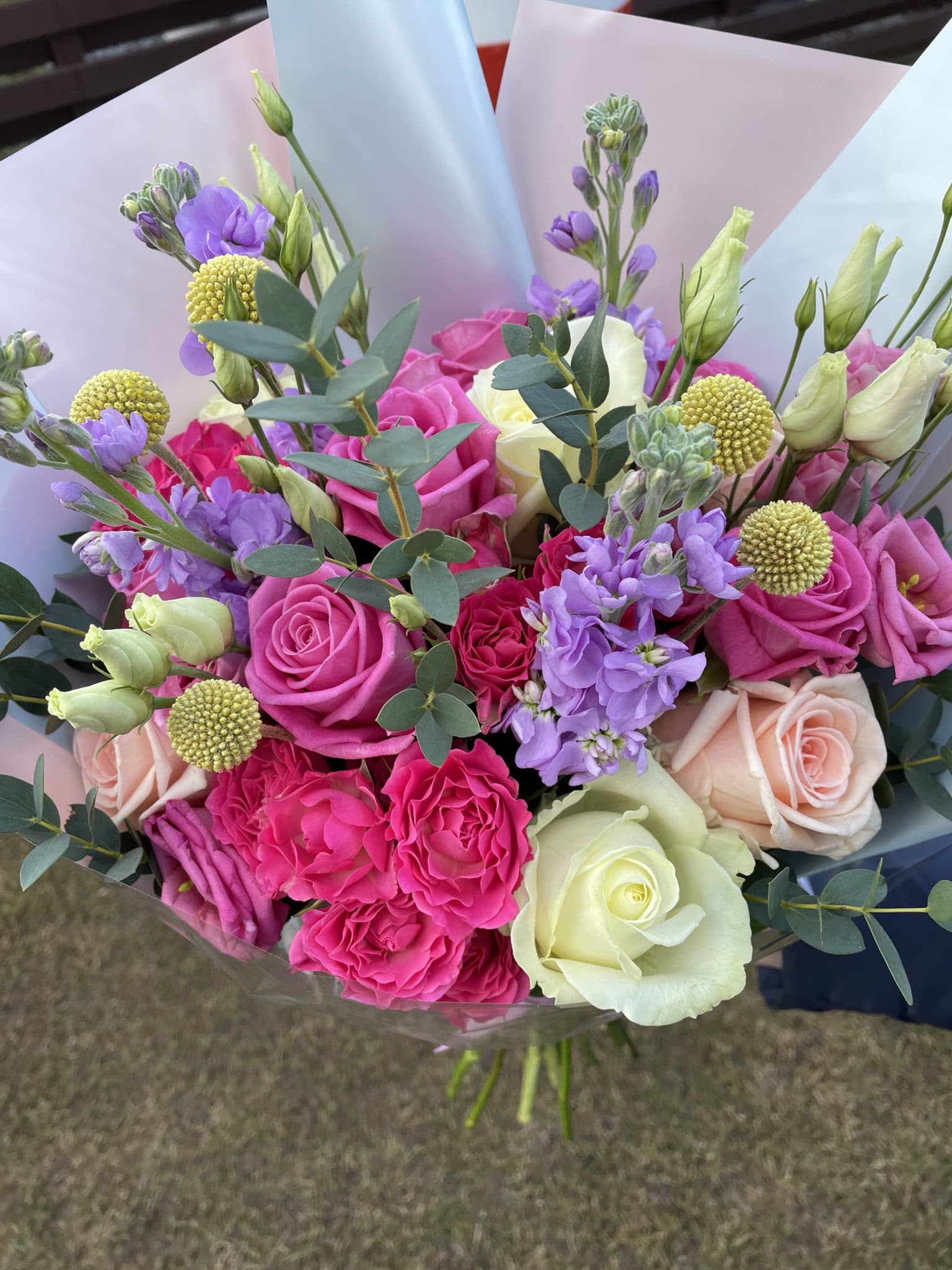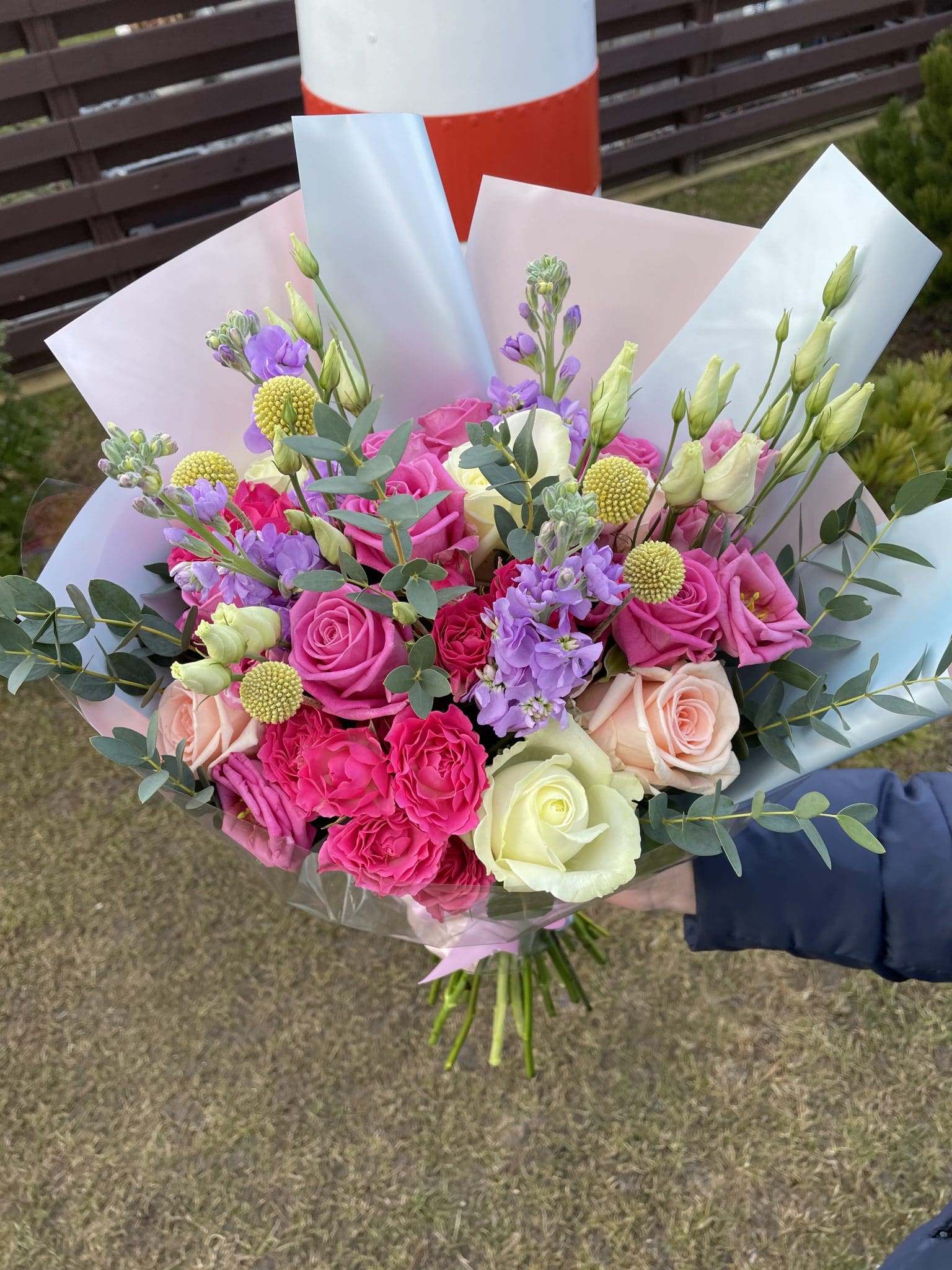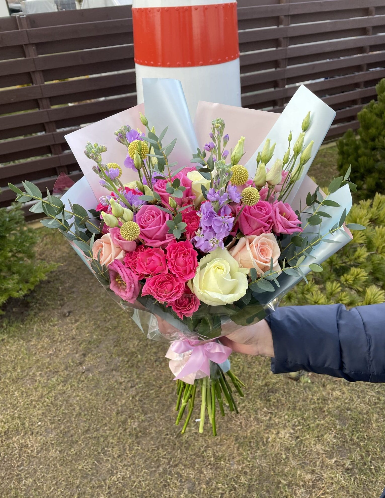 Įvairių gėlių puokštė iš ~40 žiedų: levandinės matiolos, rausvos eustomos, rausvos, persikinės ir baltos rožės, geltonos kraspedijos, eukaliptų žaluma.