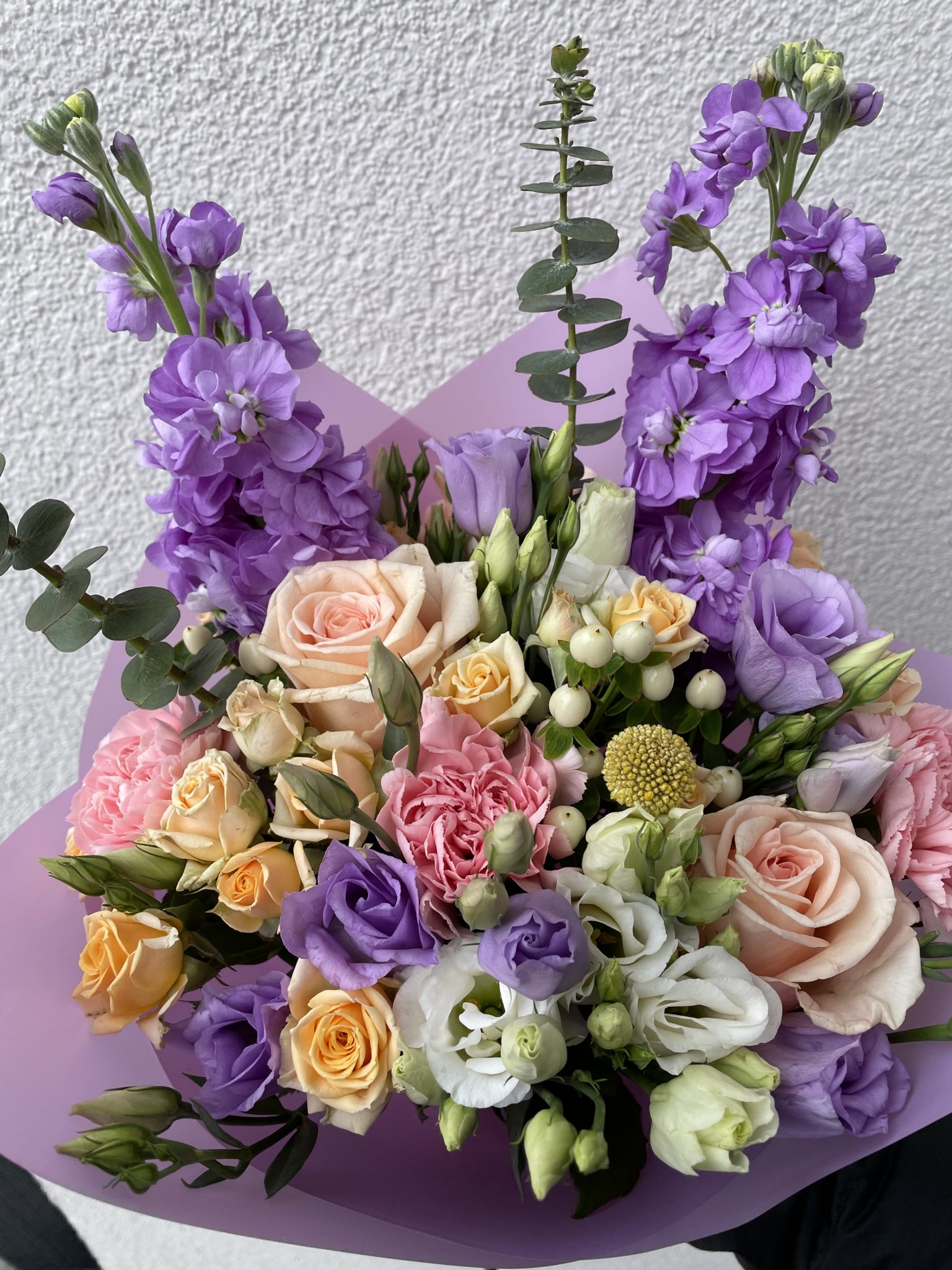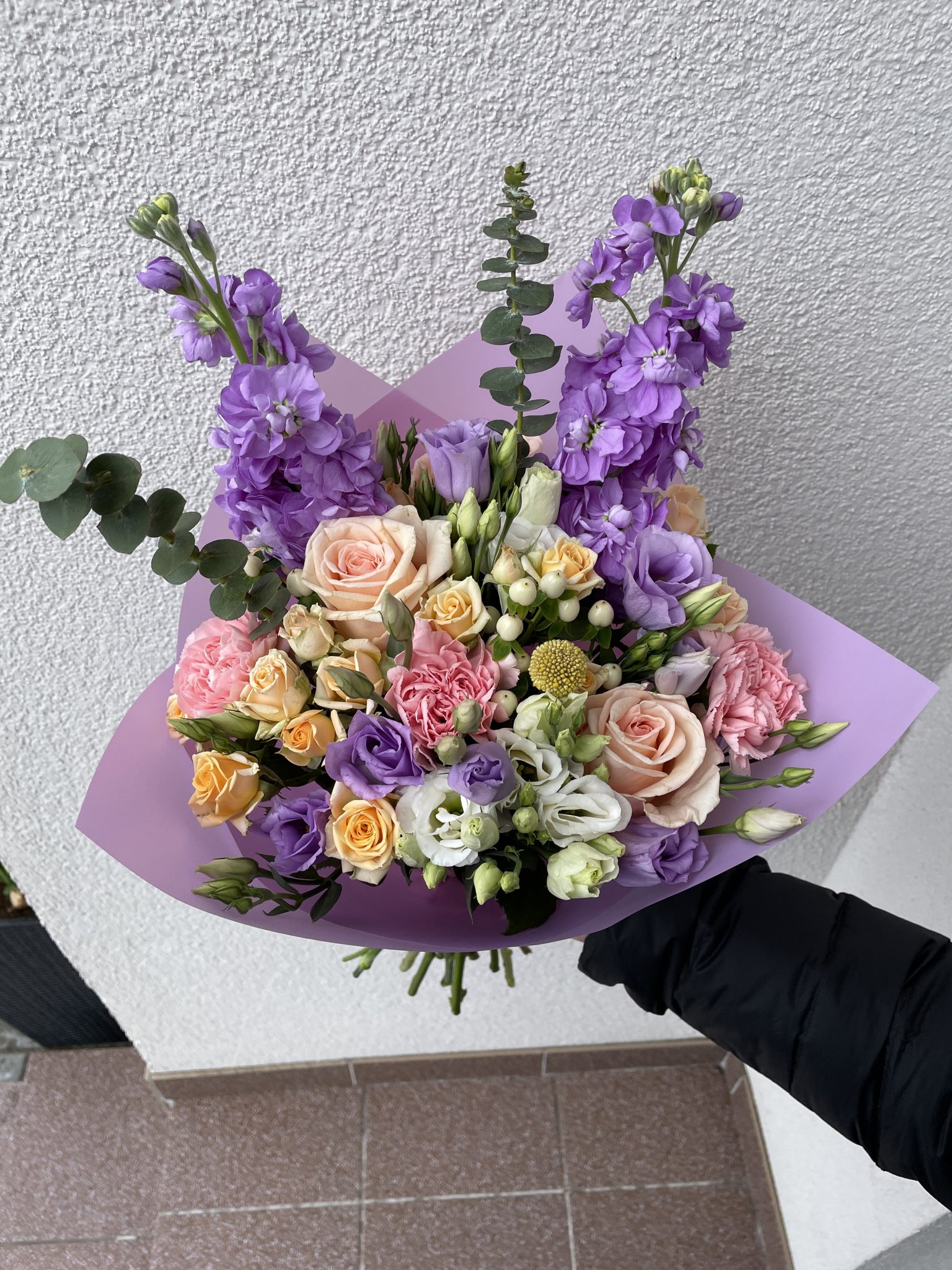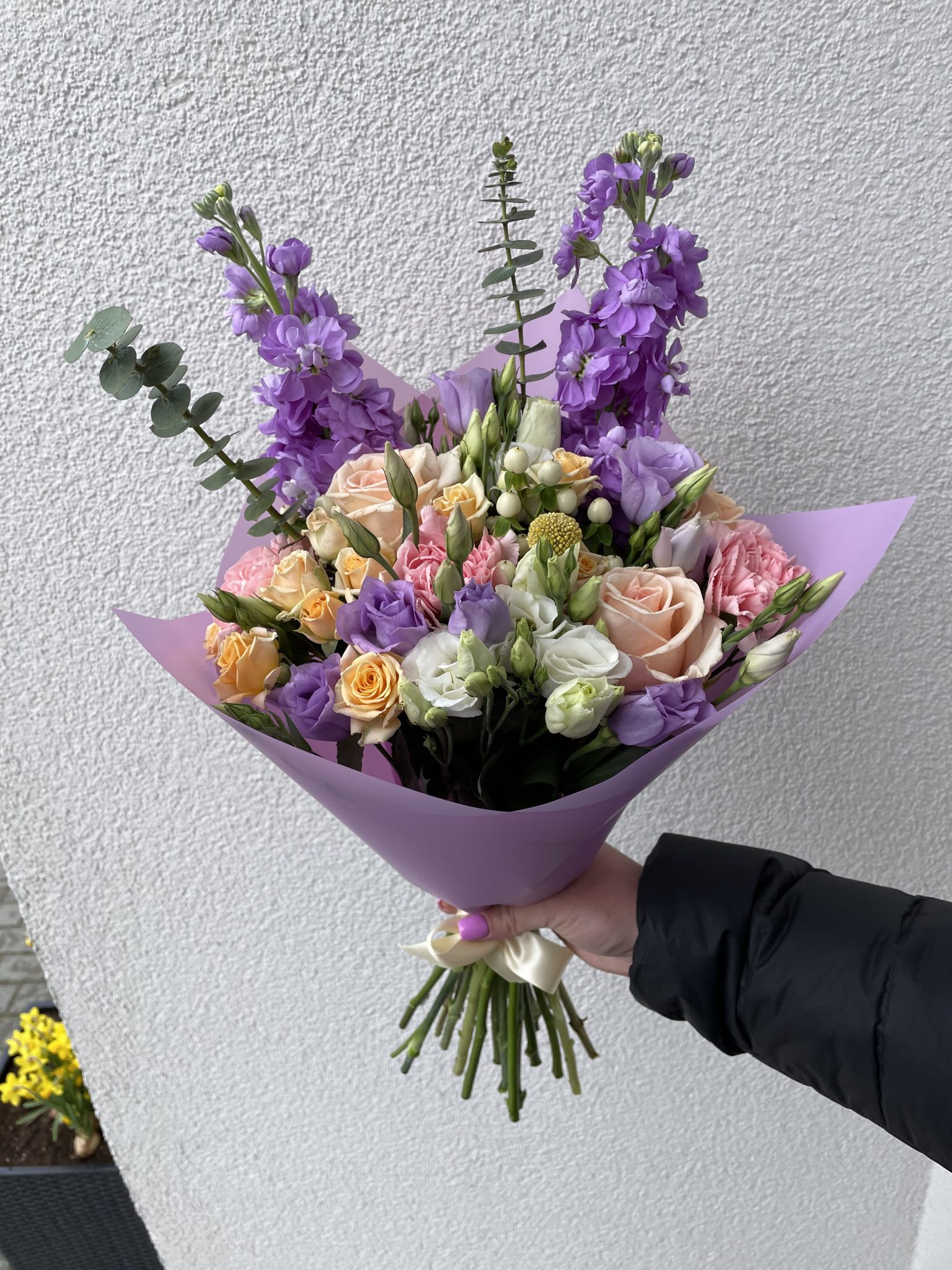 Įvairių gėlių puokštė iš apytiksliai 25 žiedų: lašišinės rožės, rausvi gvazdikai, levandinės ir baltos eustomos, persikinės smulkiažiedės rožytės, levandinės matiolos, balti hiperikumai, geltonos kraspedijos ir žaluma – eukaliptas.