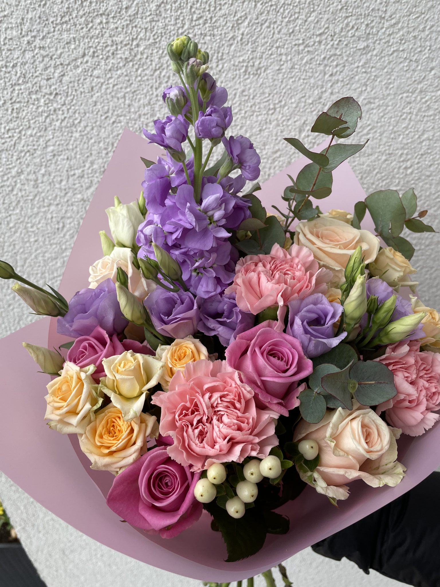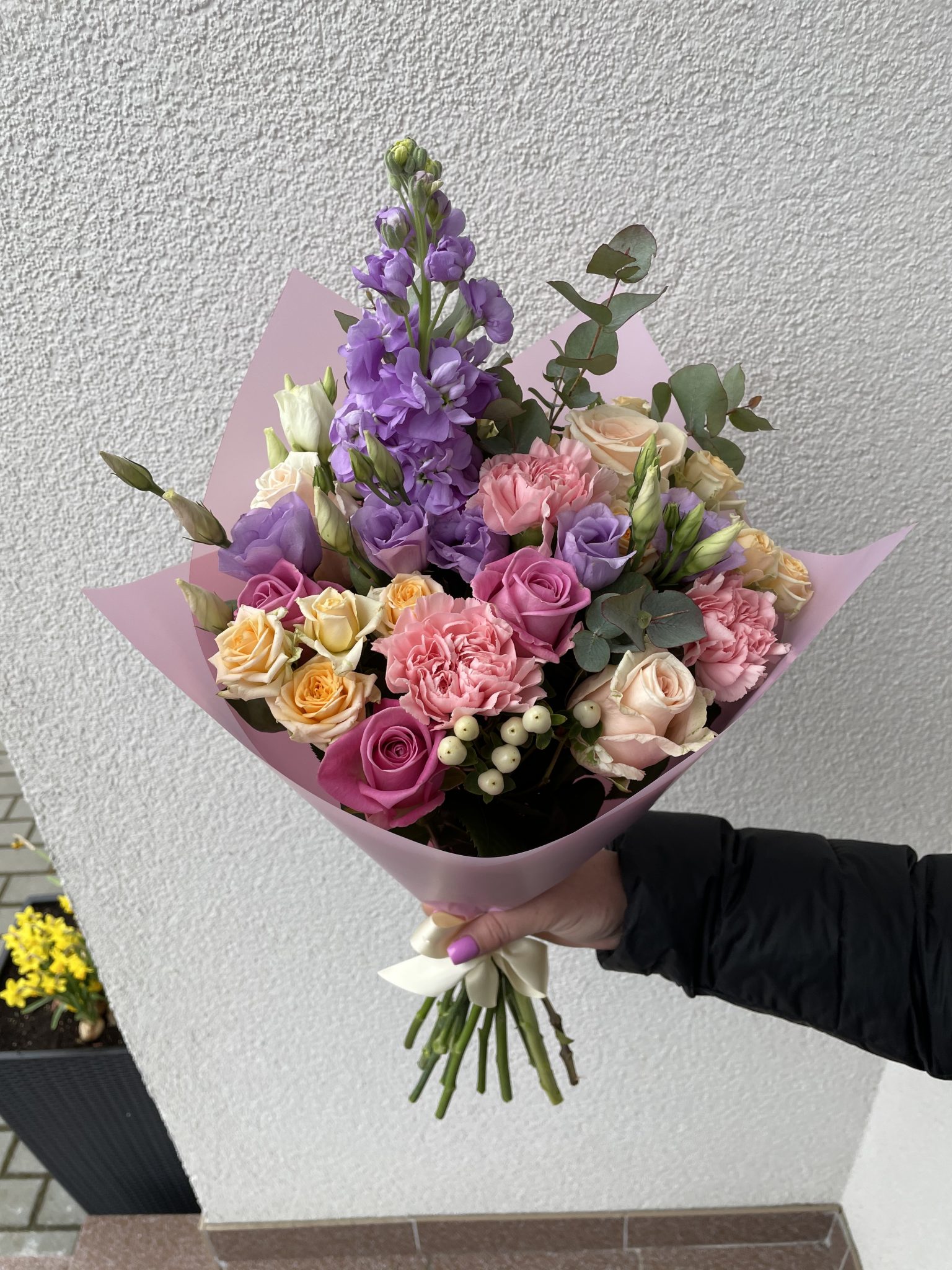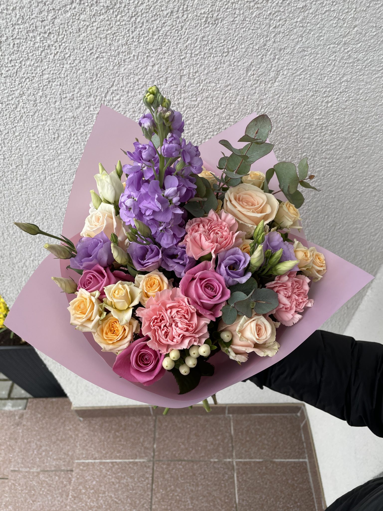 Įvairių gėlių puokštė iš apytiksliai 19 žiedų: lašišinės rožės, rausvi gvazdikai, persikinės smulkiažiedės rožytės, rausvos rožės, levandinės ir baltos eustomos, balti hiperikumai ir žaluma – eukaliptai.