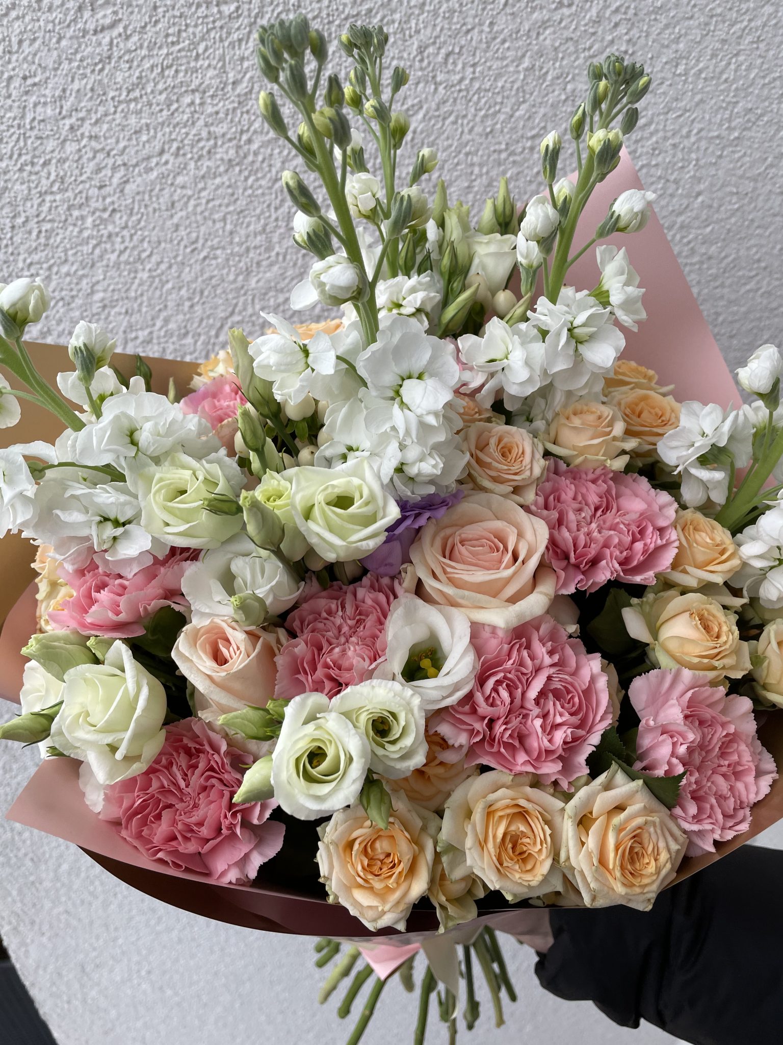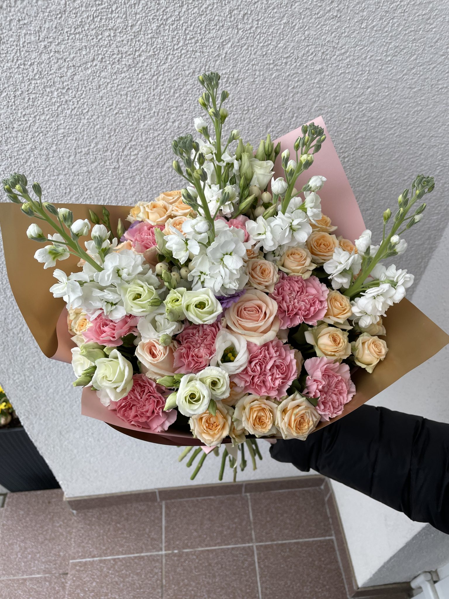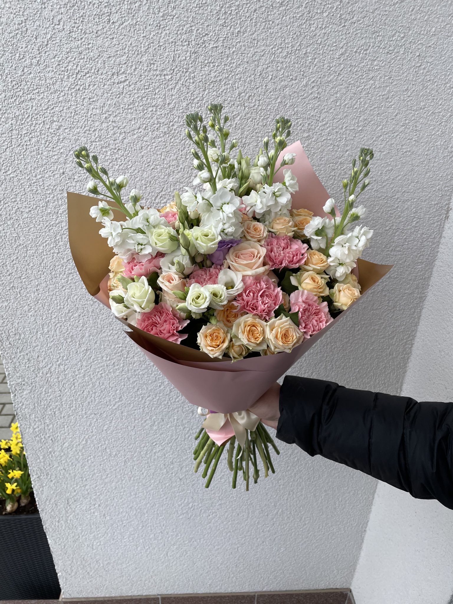 Įvairių gėlių puokštė iš apytiksliai 35 žiedų: lašišinės rožės, rausvi gvazdikai, baltos matiolos, persikinės smulkiažiedės rožytės, levandinės ir baltos eustomos.