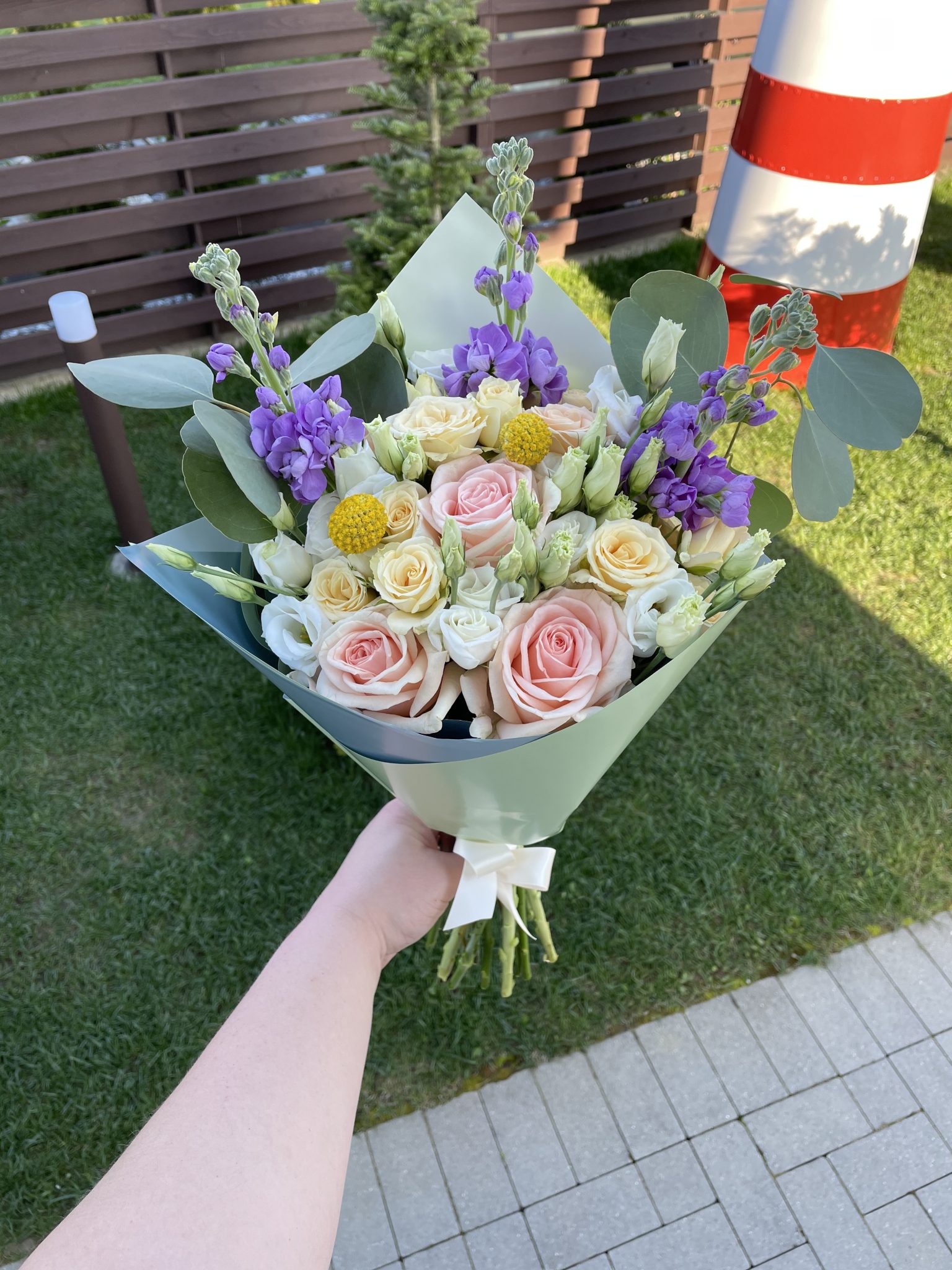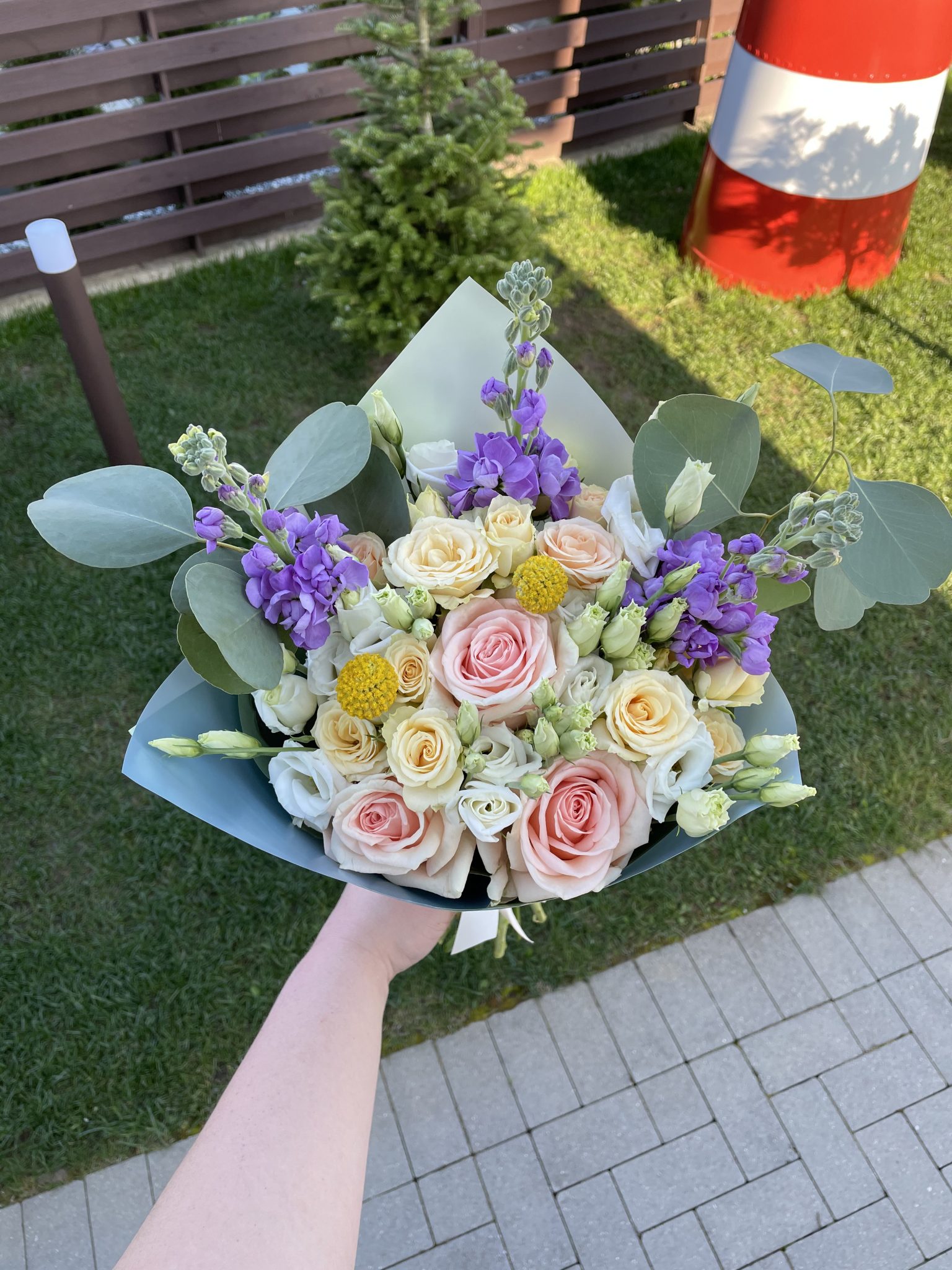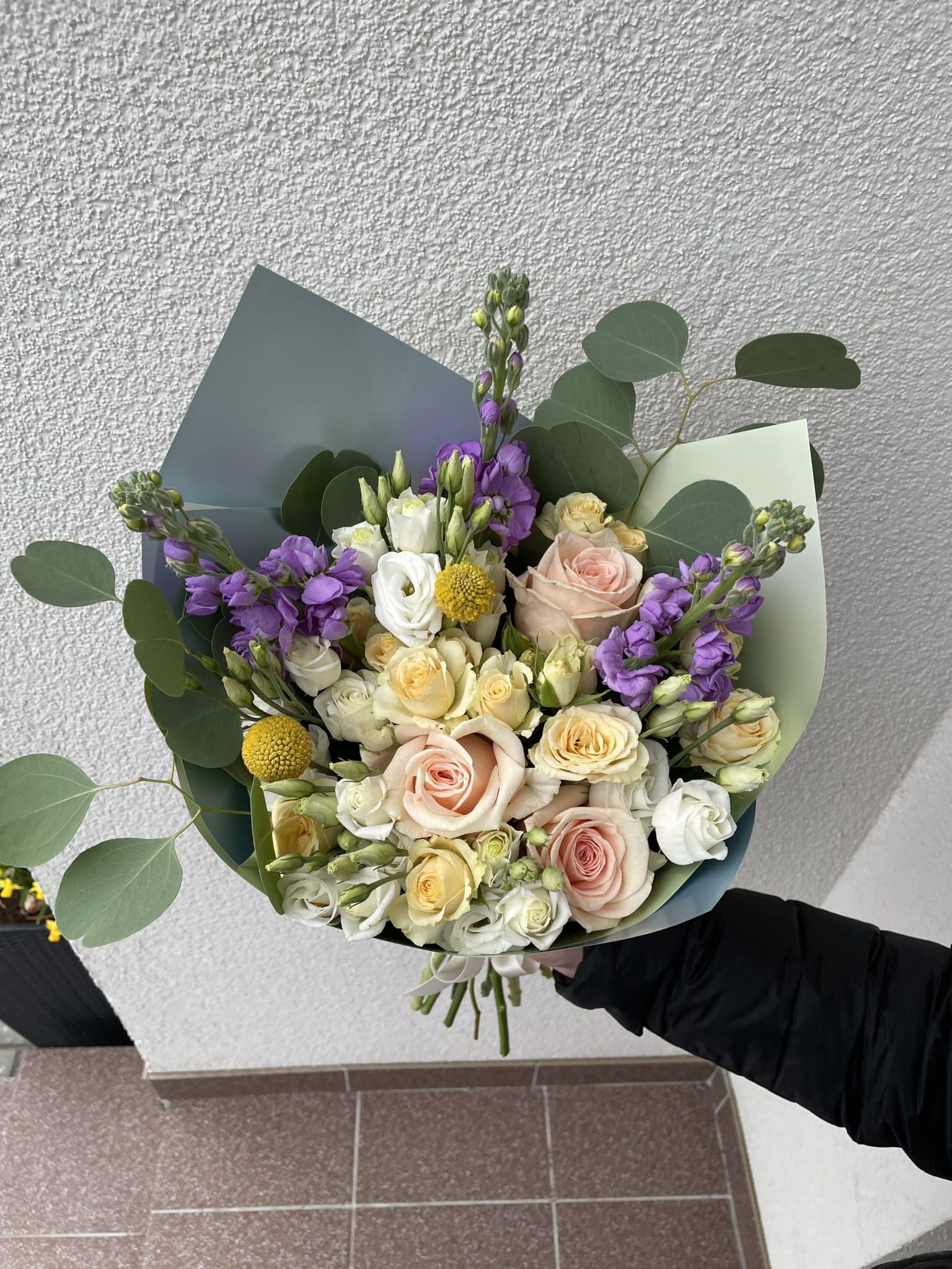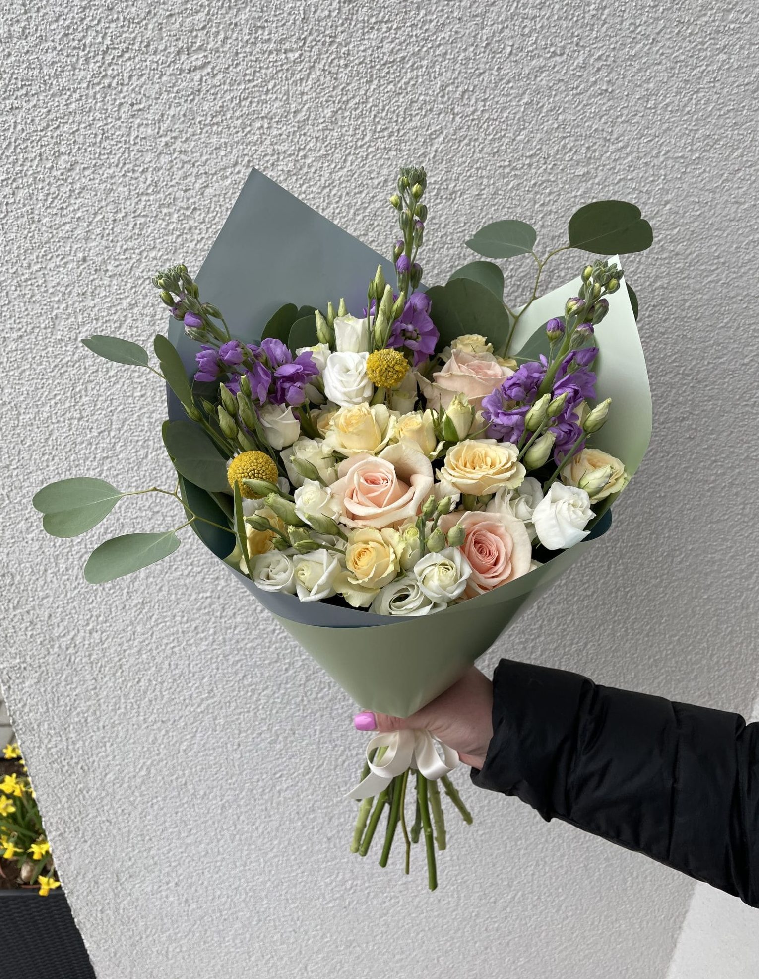 Įvairių gėlių puokštė iš apytiksliai 20 žiedų: lašišinės rožės, persikinės smulkiažiedės rožytės, levandinės matiolos, baltos eustomos, geltonos kraspedijos ir žaluma – eukaliptas.