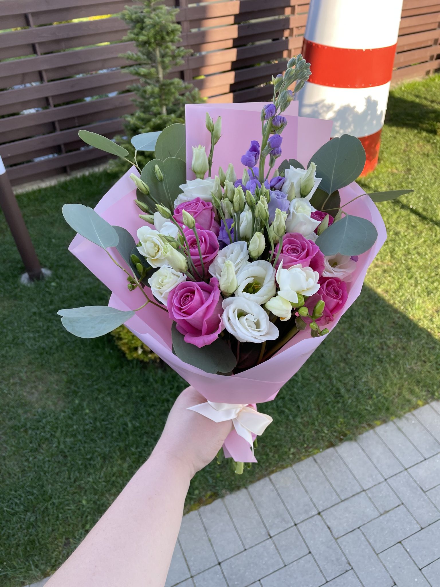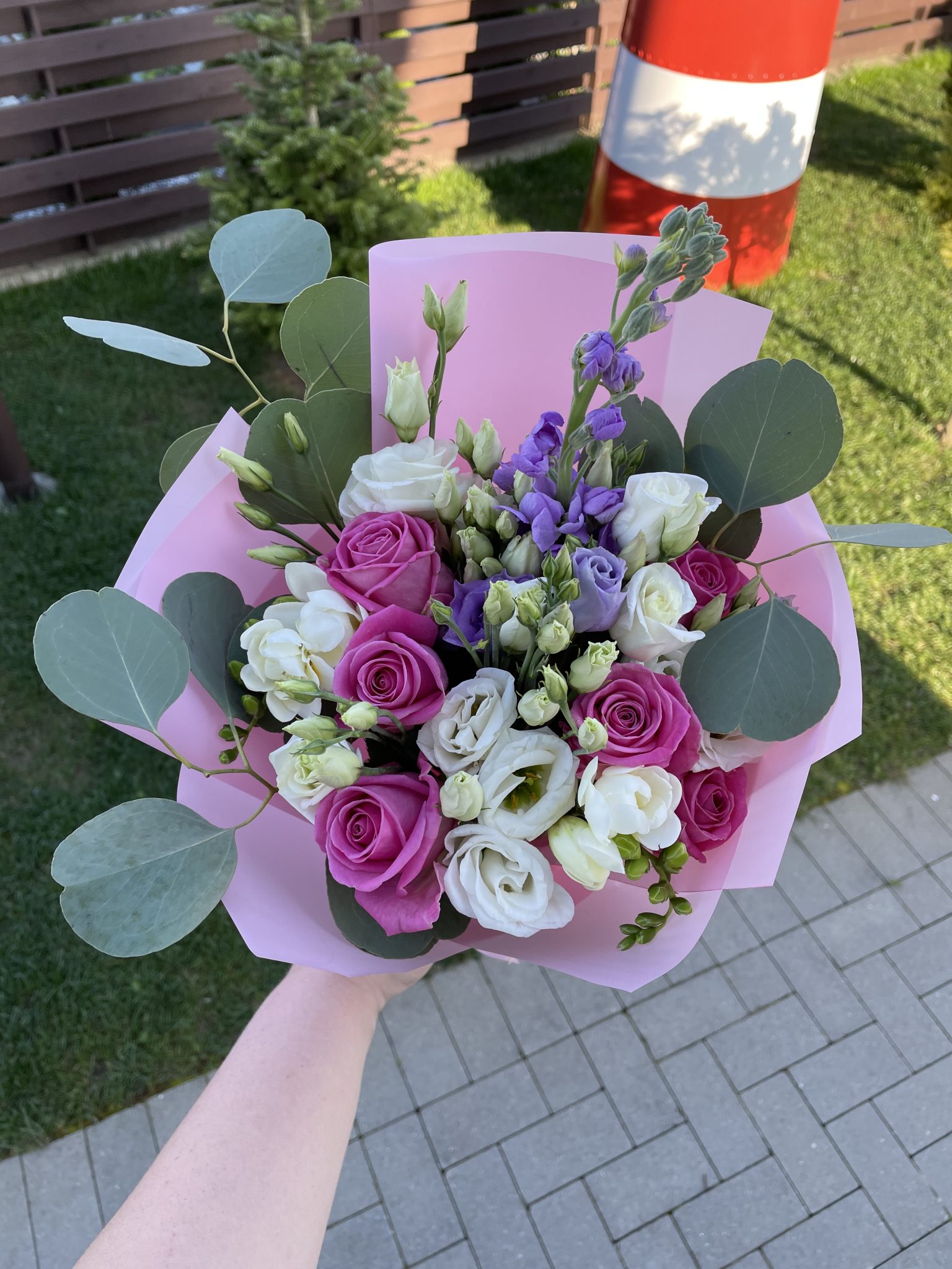 Įvairių gėlių puokštė iš apytiksliai 20 žiedų: rausvos rožės, baltos ir levandinės eustomos, baltos frezijos, levandinė matiola, žaluma – eukaliptai.