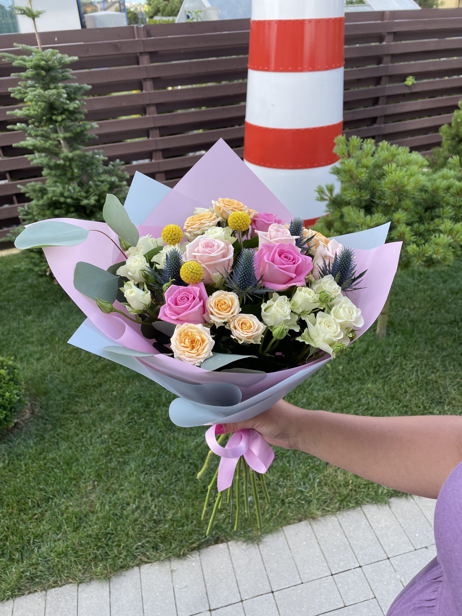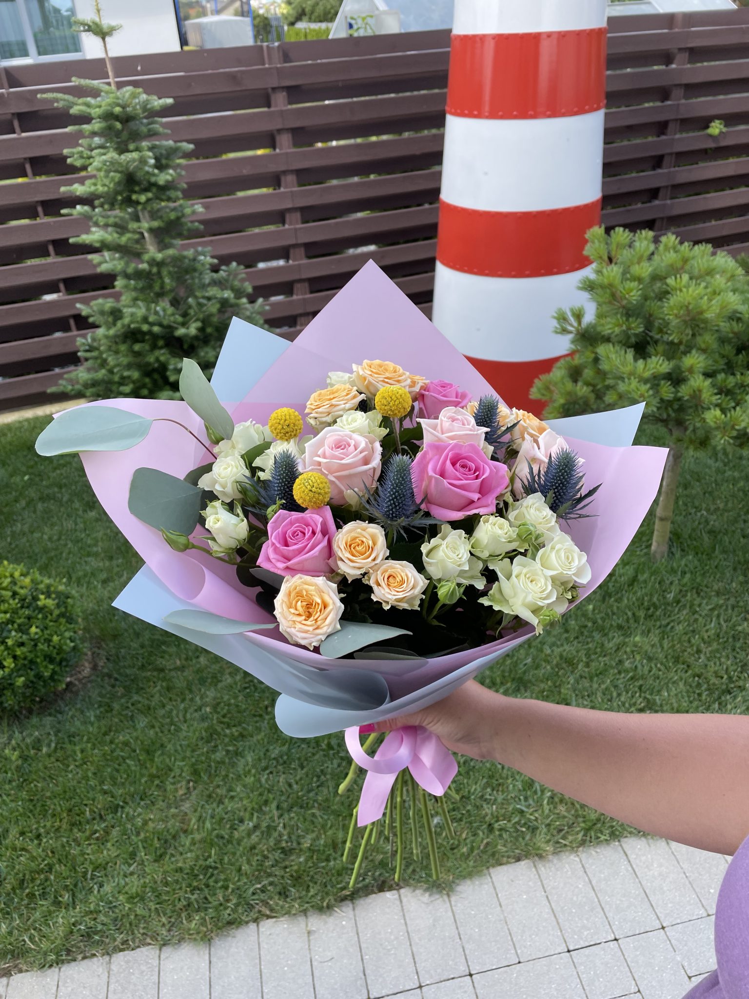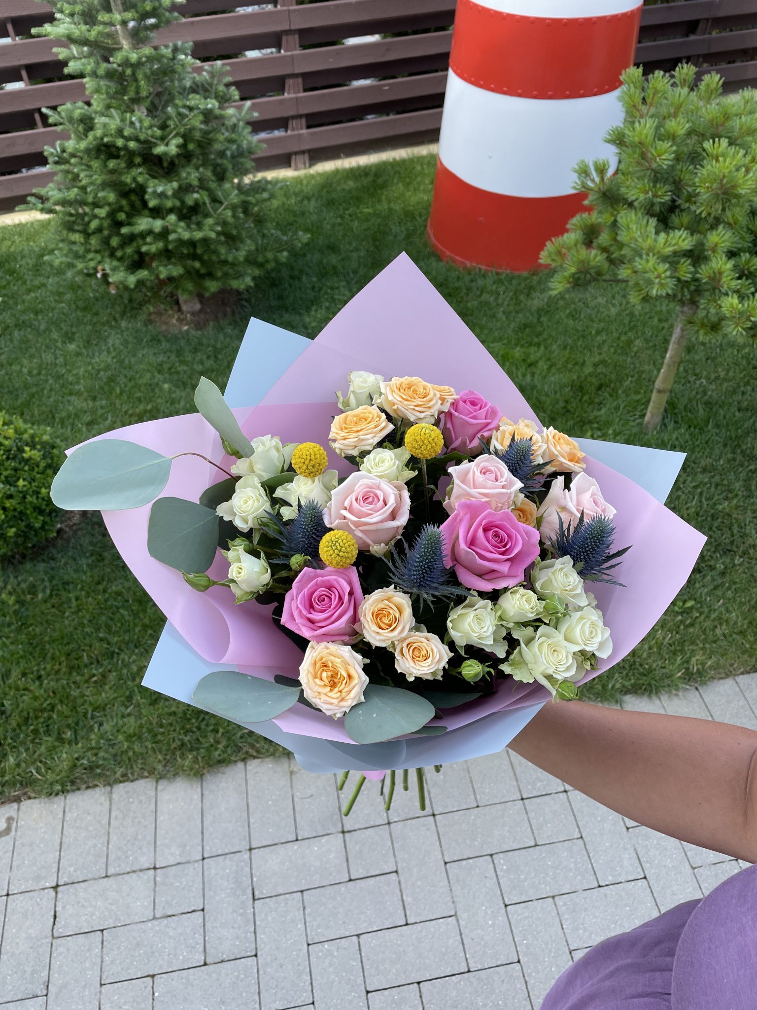 Įvairių gėlių puokštė iš apytiksliai 20 žiedų: rausvos rožės, persikinės smulkiažiedės rožytės, lašišinės rožės, baltos smulkiažiedės rožytės, geltonos kraspedijos, mėlyni ežiukai ir eukalipto žaluma.