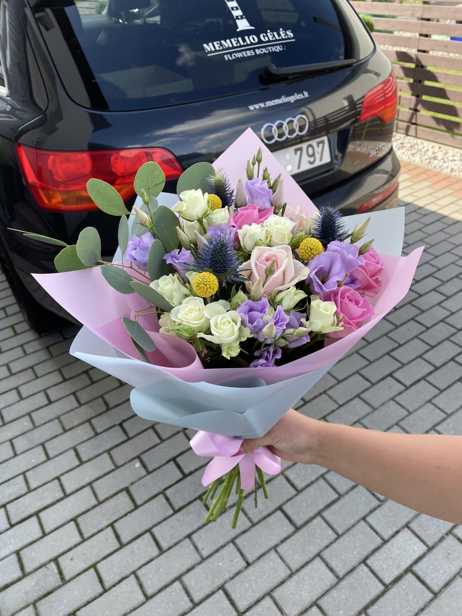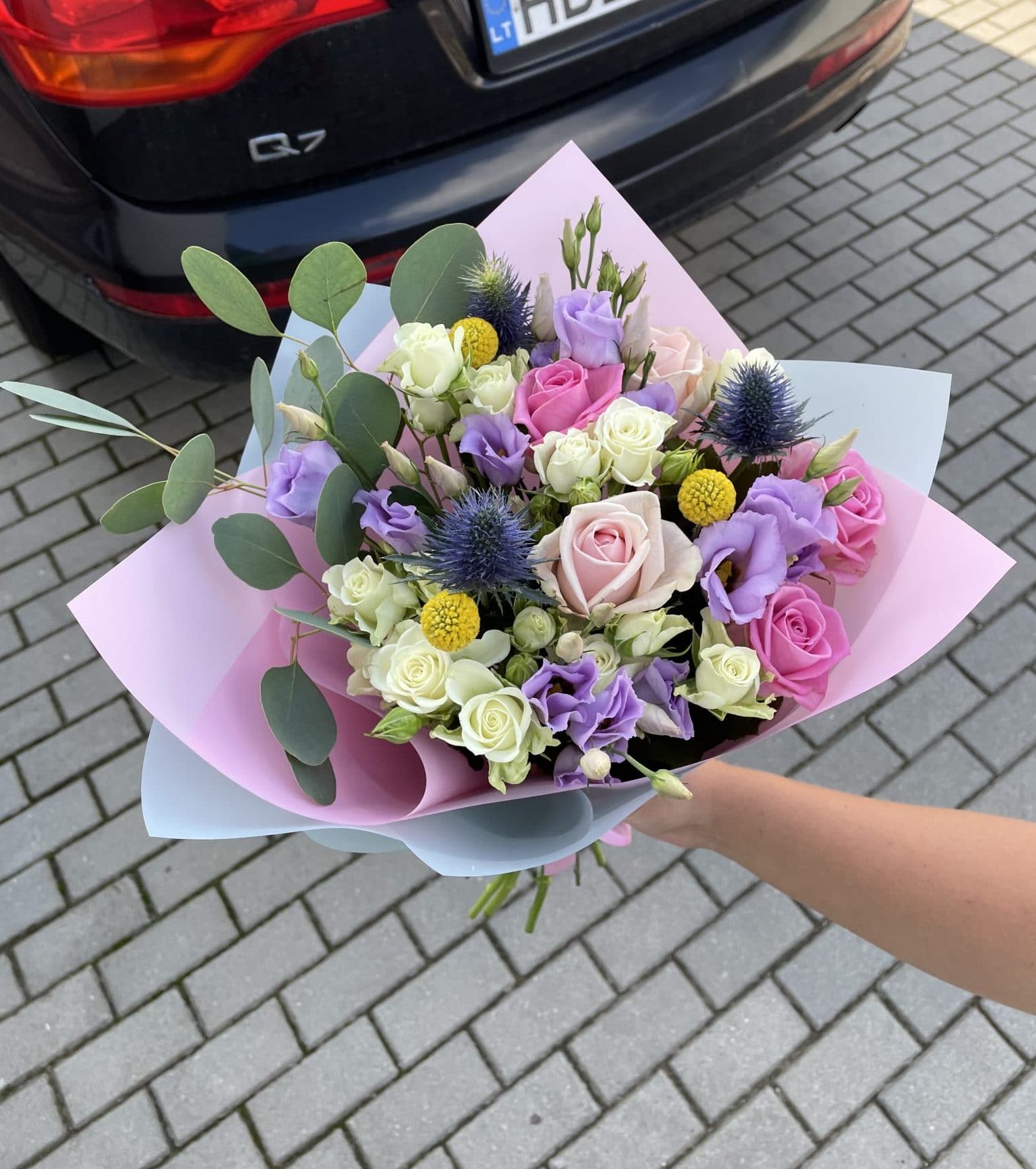 Įvairių gėlių puokštė iš apytiksliai 20 žiedų: rausvos rožės, levandinės eustomos, lašišinės rožės, baltos smulkiažiedės rožytės, geltonos kraspedijos ir eukalipto žaluma.