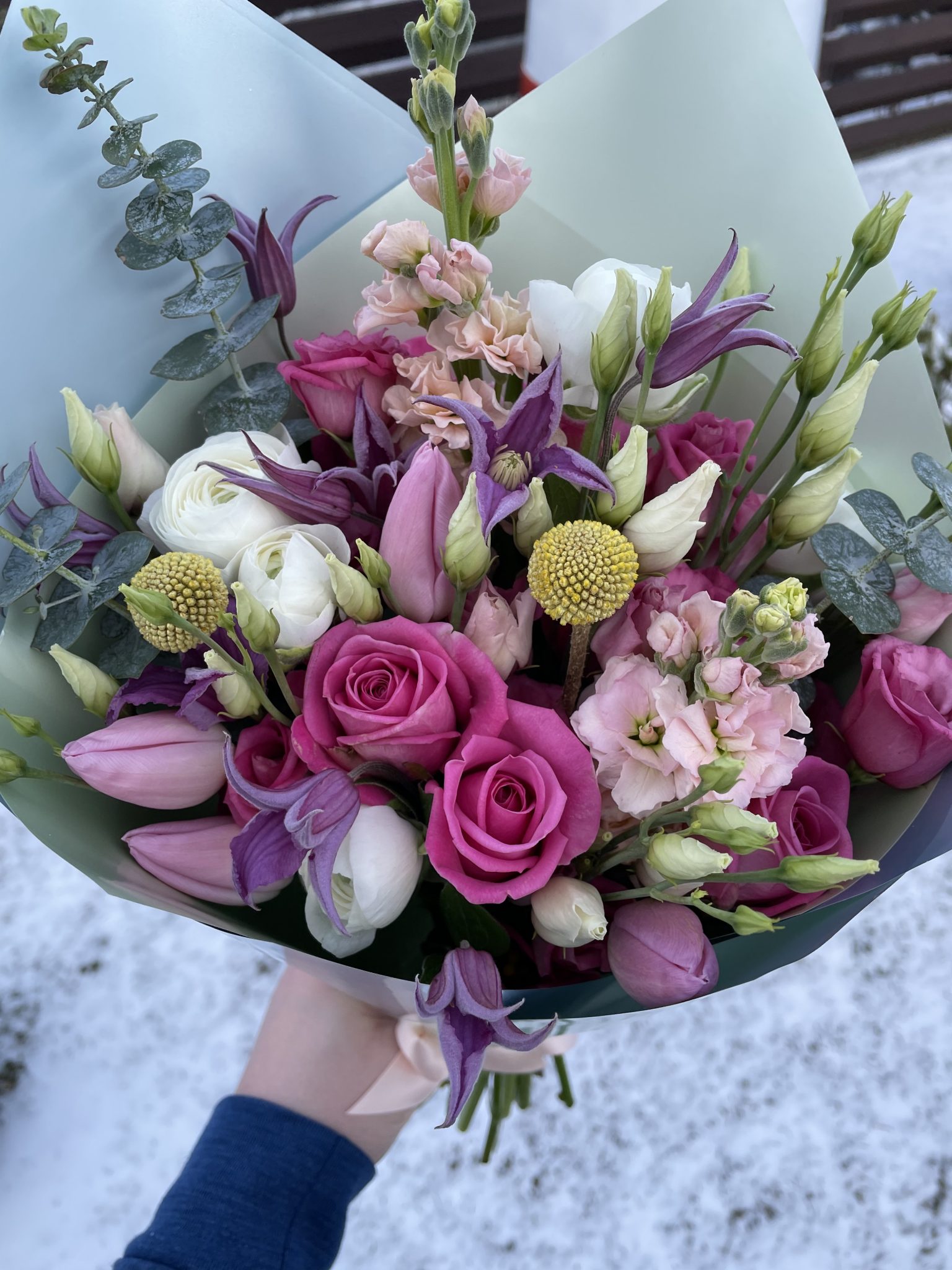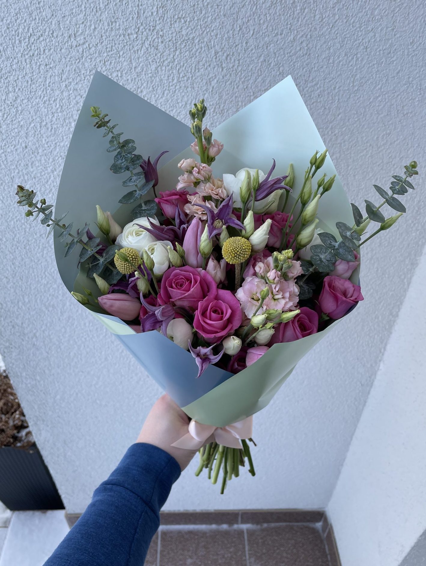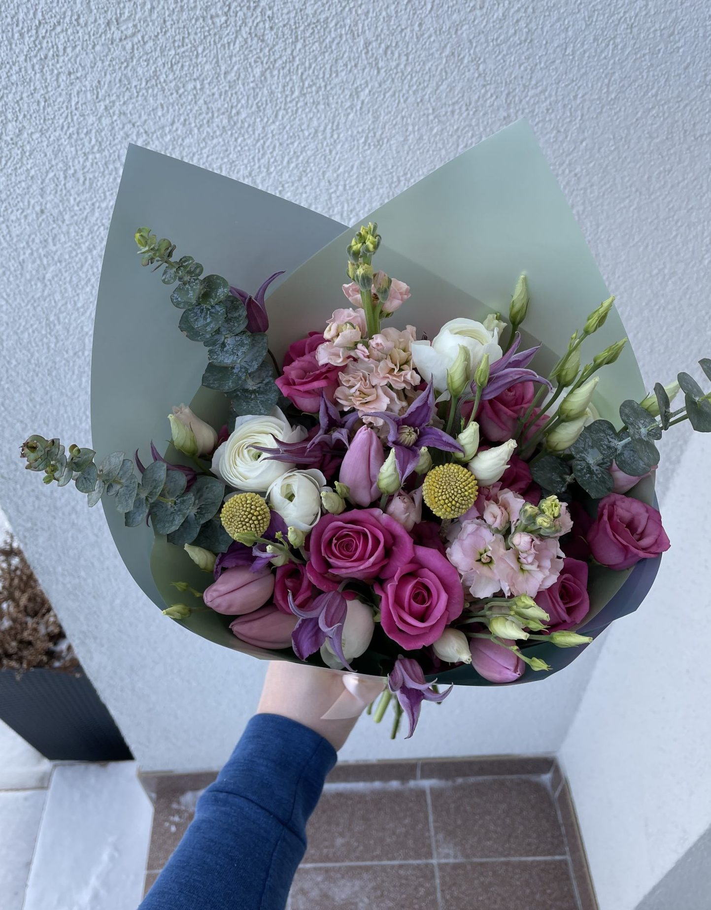 Įvairių gėlių puokštė: rausvos rožės, šviesiai persikinės matiolos, rausvos tulpės, balti ranonai, levandiniai varpeliai, rausvos eustomos, geltonos kraspedijos ir žaluma eukaliptai.
