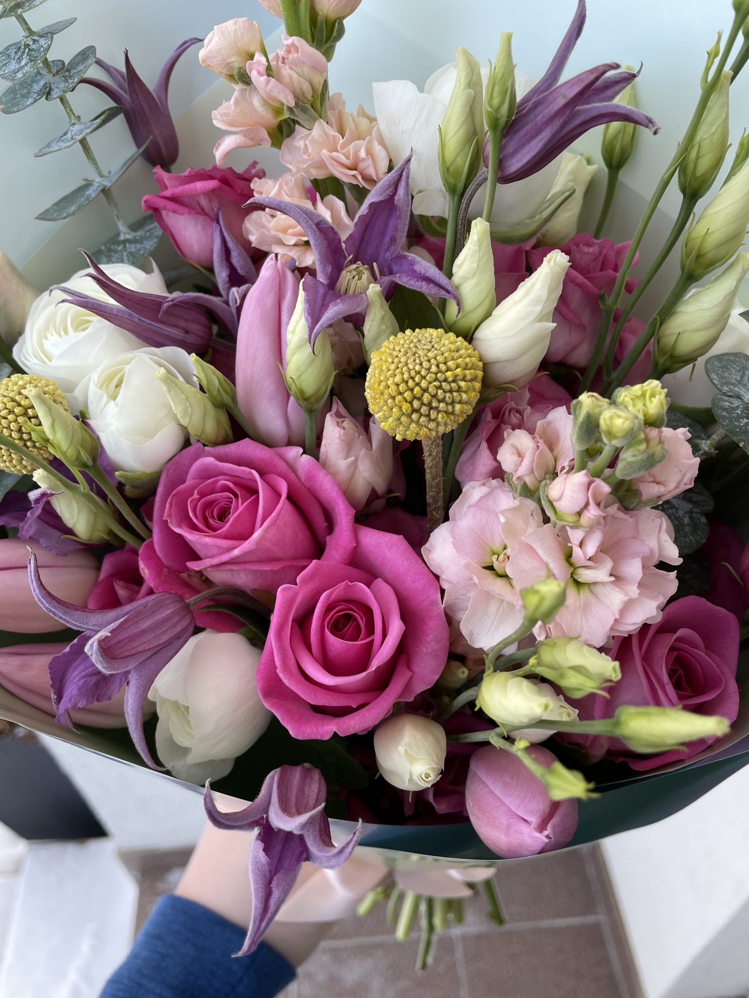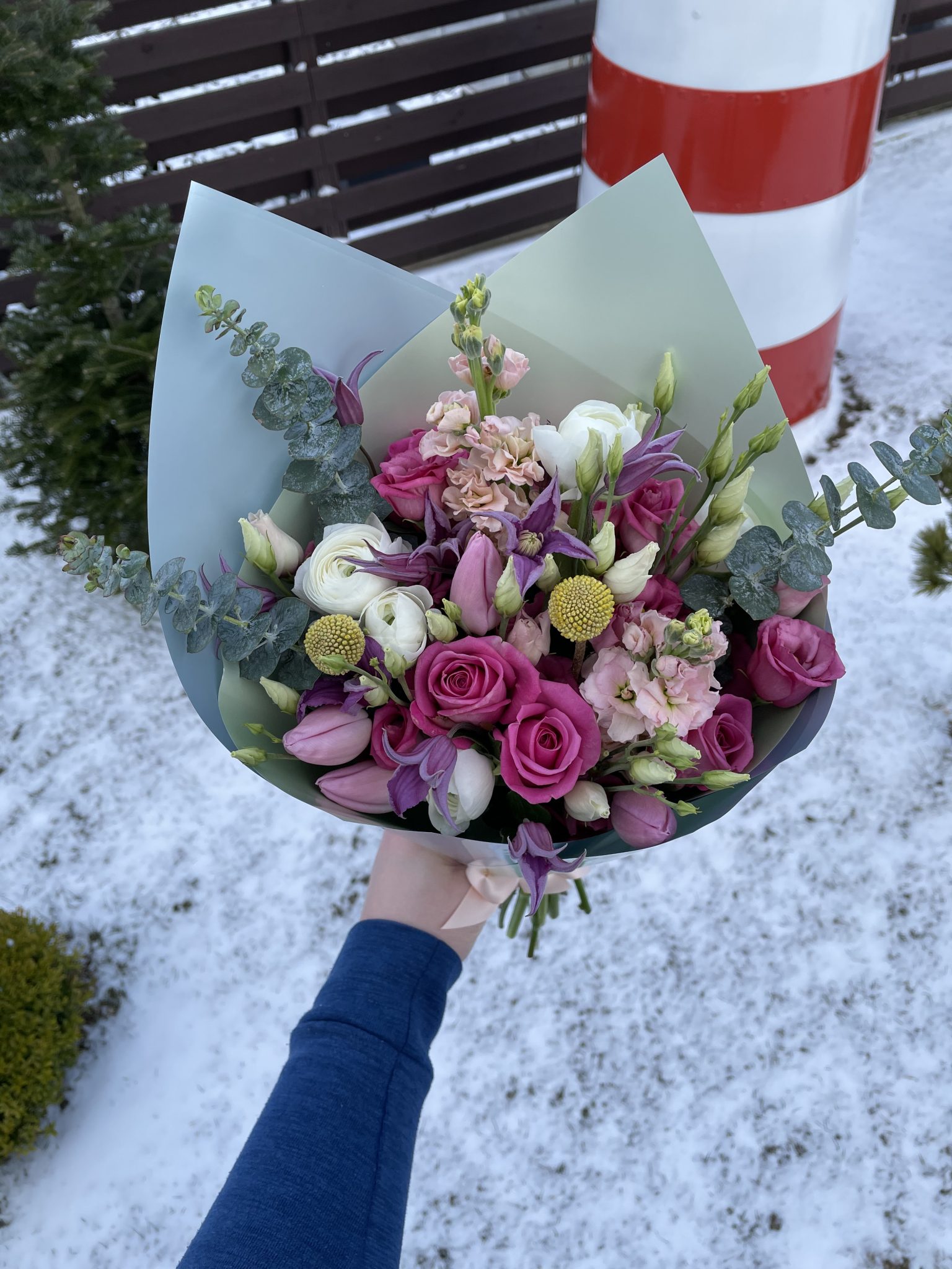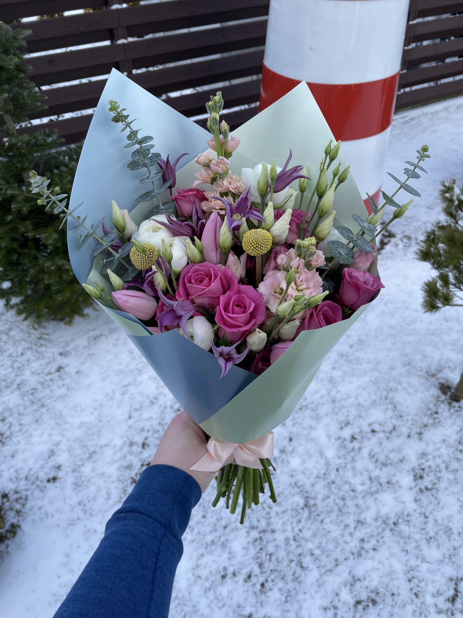 Įvairių gėlių puokštė: rausvos rožės, šviesiai persikinės matiolos, rausvos tulpės, balti ranonai, levandiniai varpeliai, rausvos eustomos, geltonos kraspedijos ir žaluma eukaliptai.