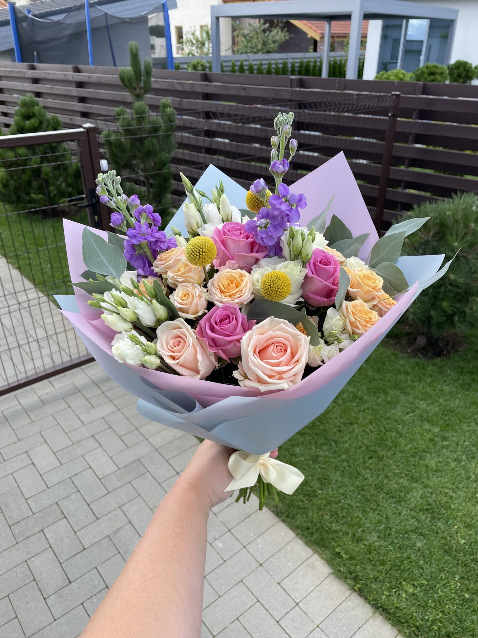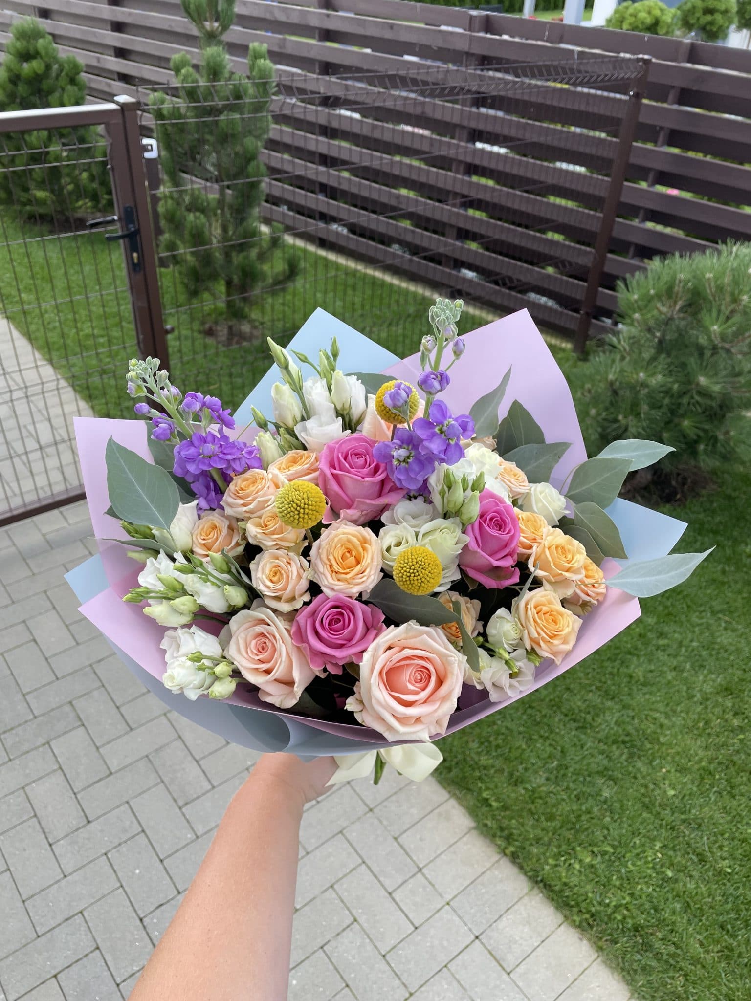 Įvairių gėlių puokštė iš apytiksliai 20 žiedų: rausvos rožės, persikinės smulkiažiedės rožytės, lašišinės rožės, levandinės matiolos, baltos eustomos, geltonos kraspedijos ir eukalipto žaluma.