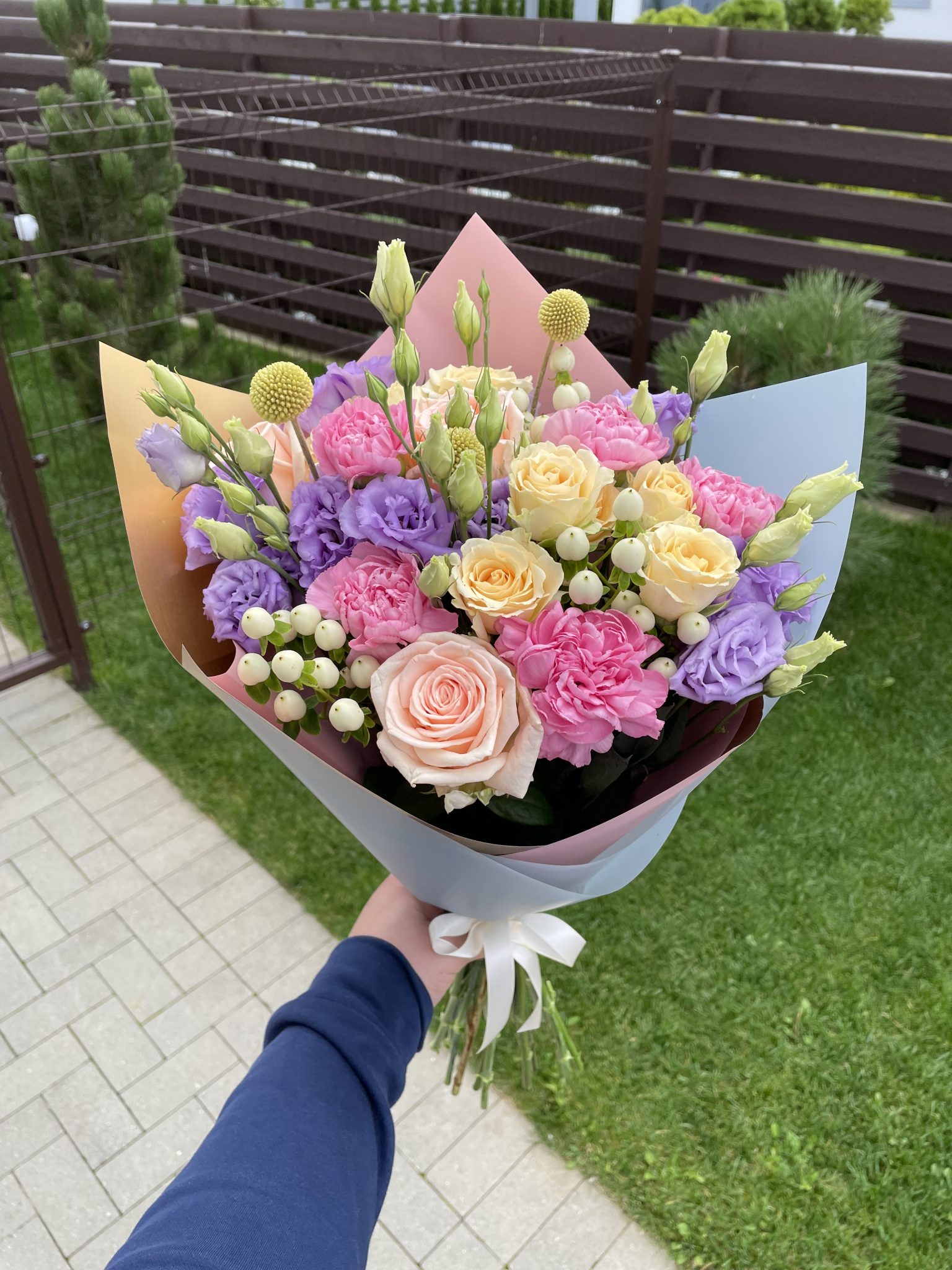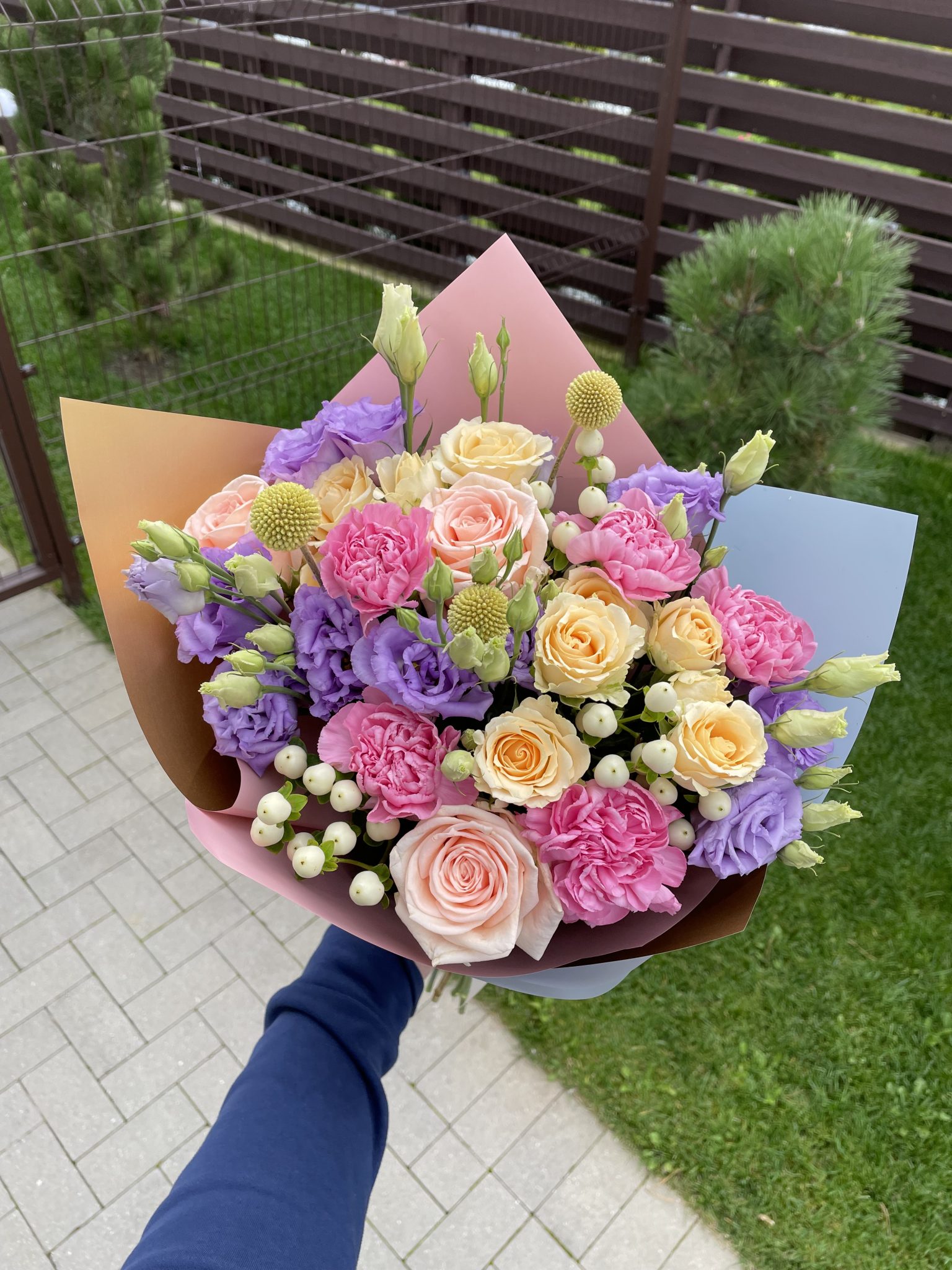 Įvairių gėlių puokštė iš 21 žiedo: lašišinės rožės, levandinės eustomos, rausvi gvazdikai, šviesiai persikinės smulkiažiedės rožytės, balti hiperikumai ir geltonos kraspedijos.