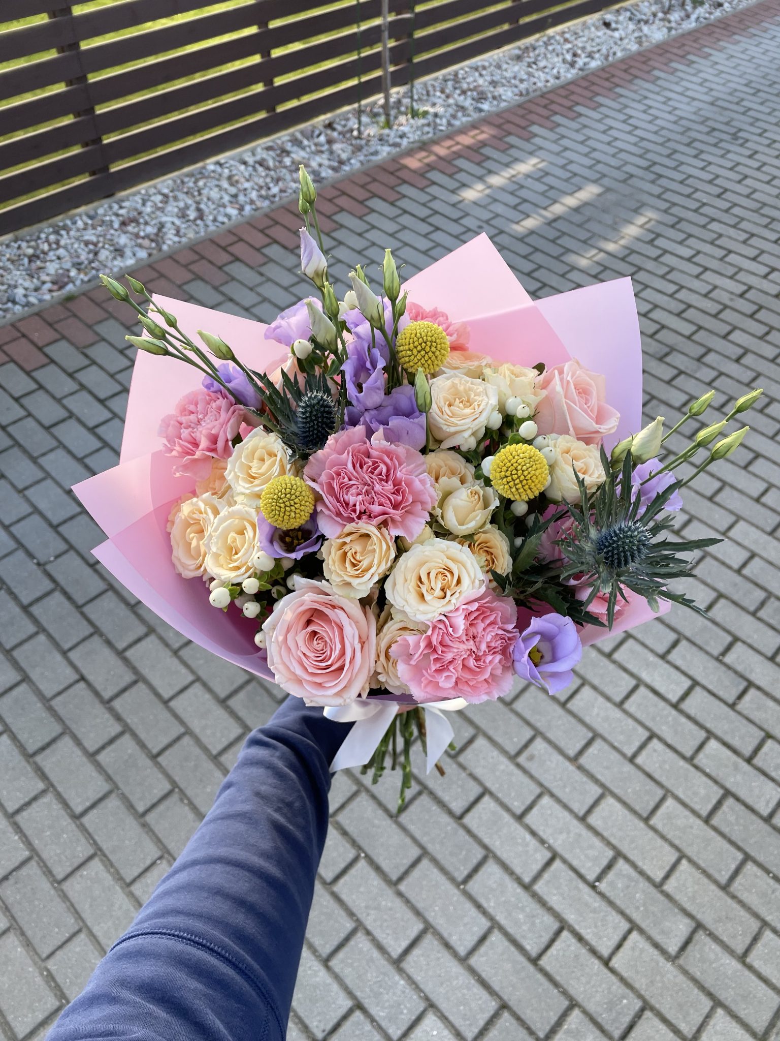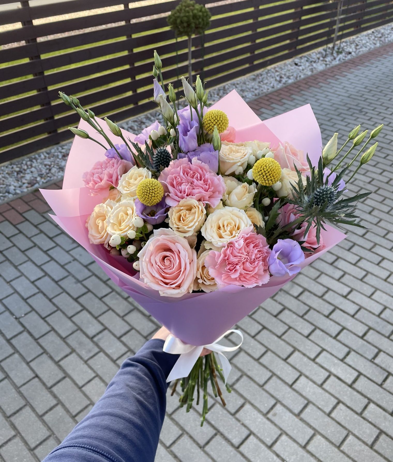 Įvairių gėlių puokštė iš 21 žiedo: rausvi gvazdikai, lašišinės rožės, šviesiai perskinės smulkiažiedės rožytės, levandinės eustomos, balti hiperikumai, geltonos kraspedijos ir mėlyni ežiukai.
