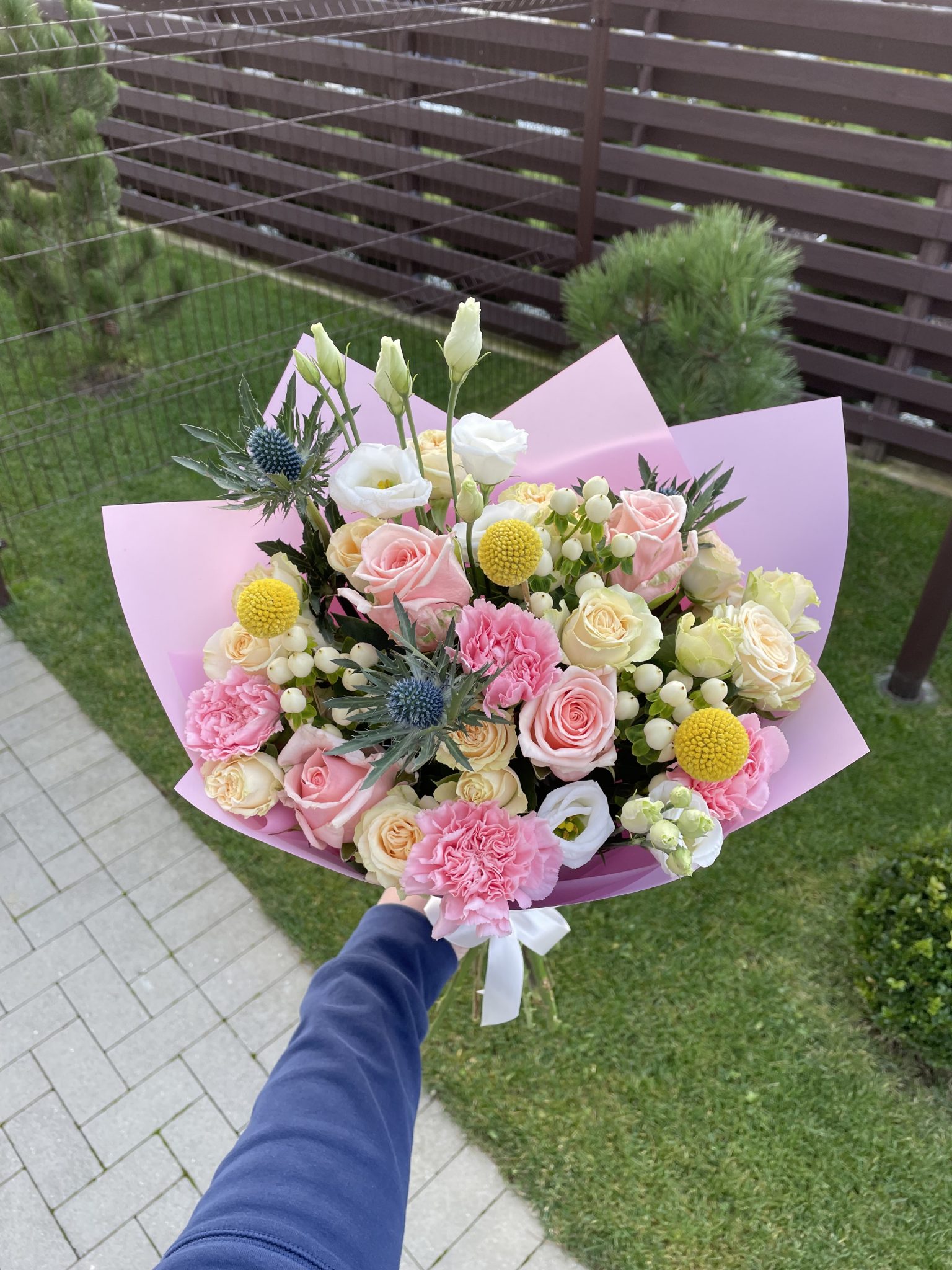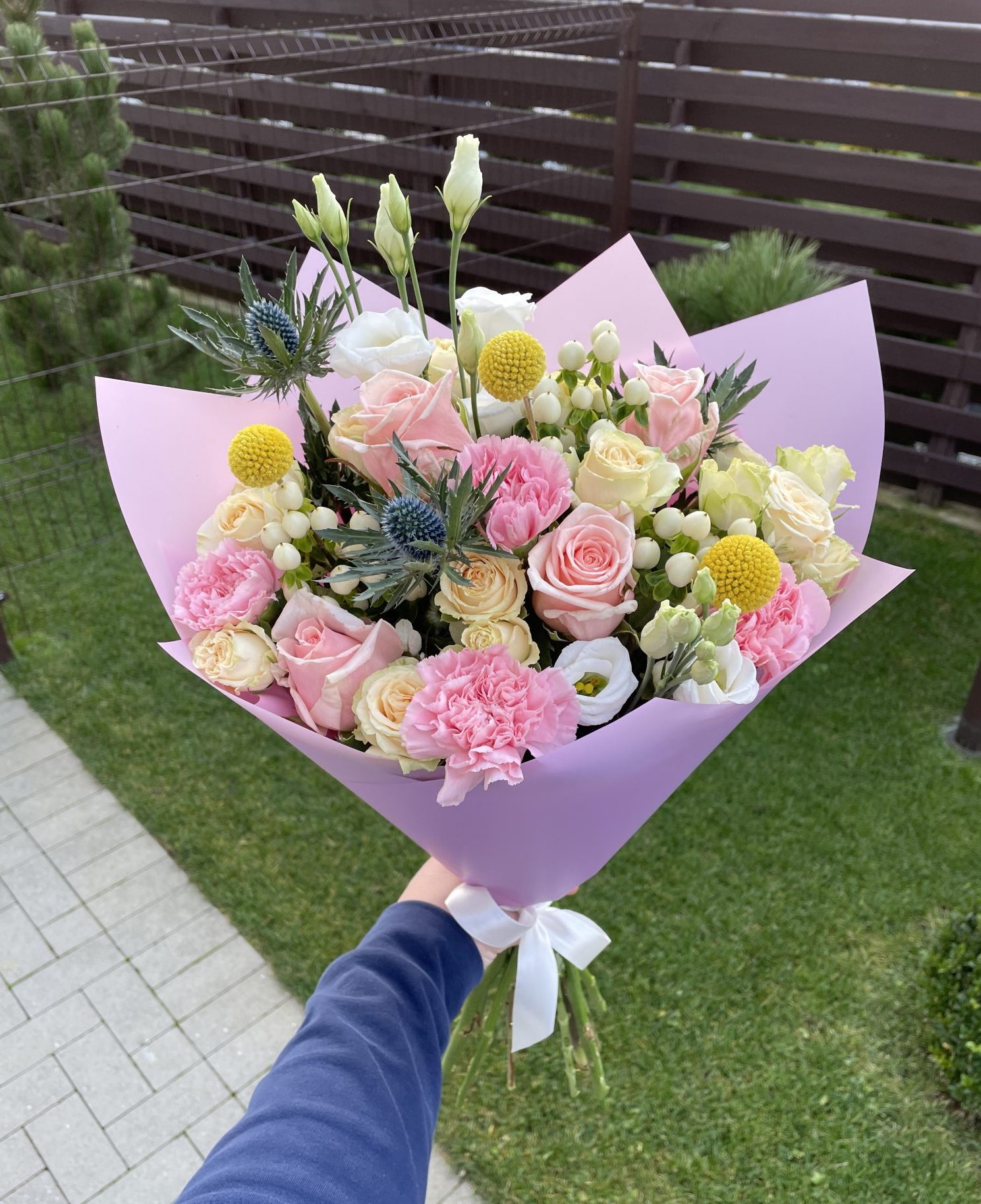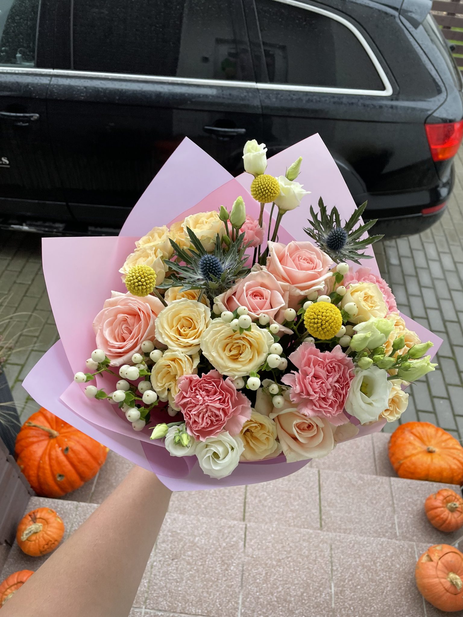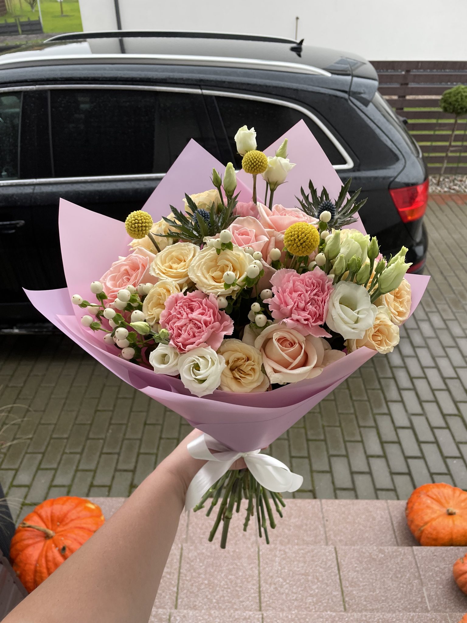 Įvairių gėlių puokštė iš apytiksliai 21 žiedo: lašišinės rožės, rausvi gvazdikai, šviesiai persikinės smulkiažiedės rožytės, baltos eustomos, mėlyni ežiukai, balti hiperikumai ir geltonos kraspedijos.