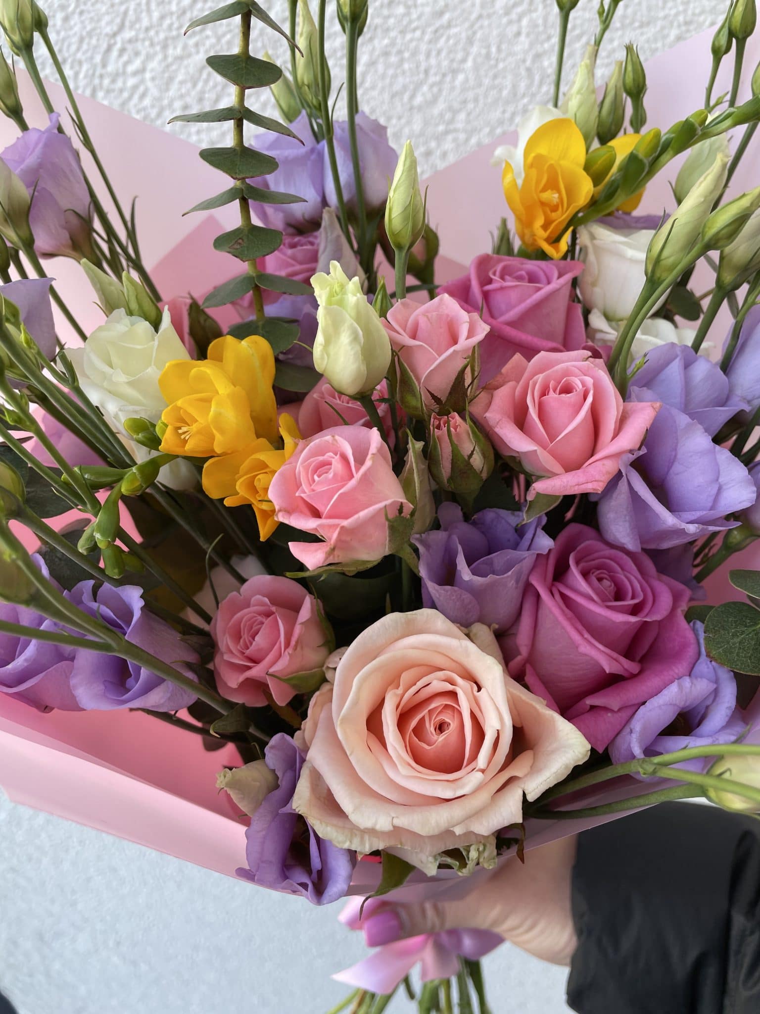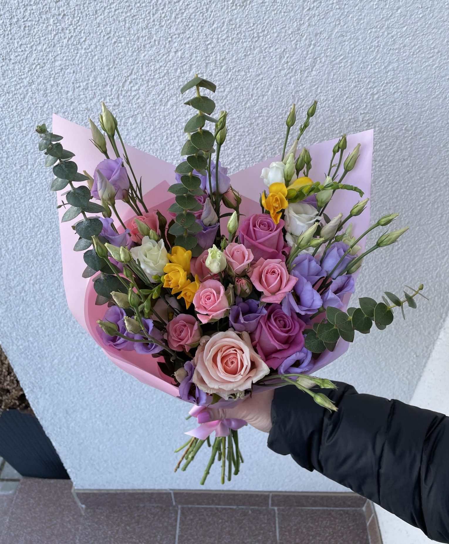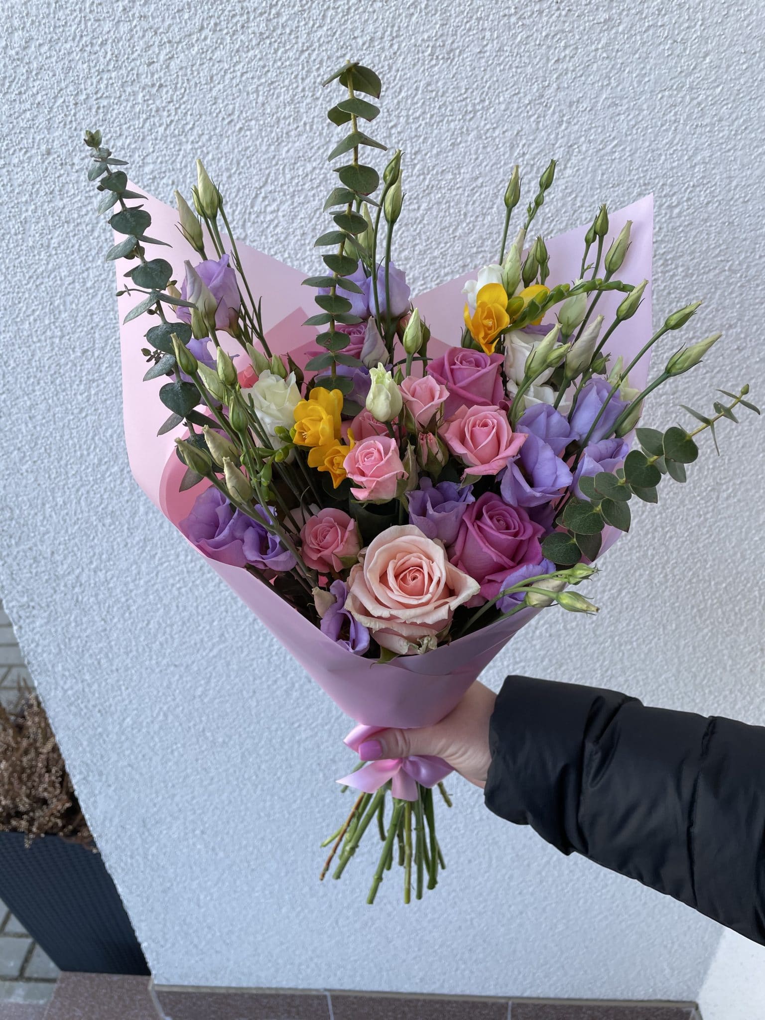 Įvairių gėlių puokštė: rausvos rožės, levandinės ir baltos eustomos, rausvos smulkiažiedės rožytės, geltonos frezijos ir eukaliptų žaluma.