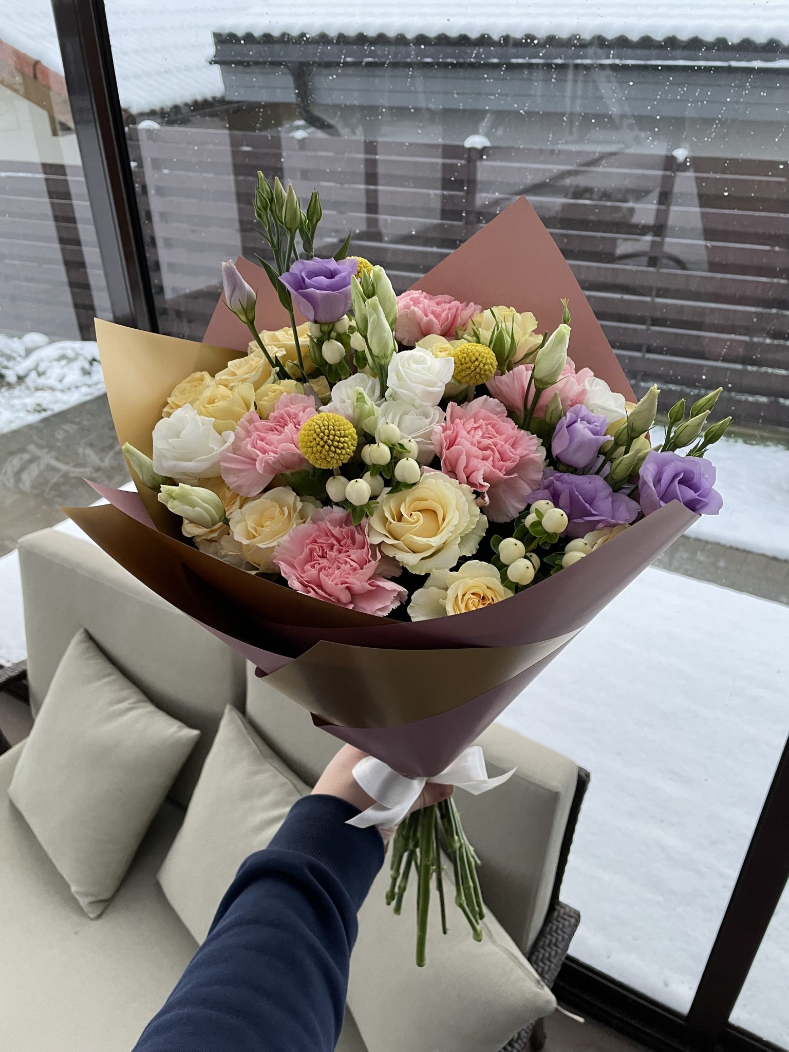Įvairių gėlių puokštė iš 19 žiedų: rausvi gvazdikai, šviesiai persikinės smulkiažiedės rožytės, baltos ir levandinės eustomos, balti hiperikumai ir geltonos kraspedijos.