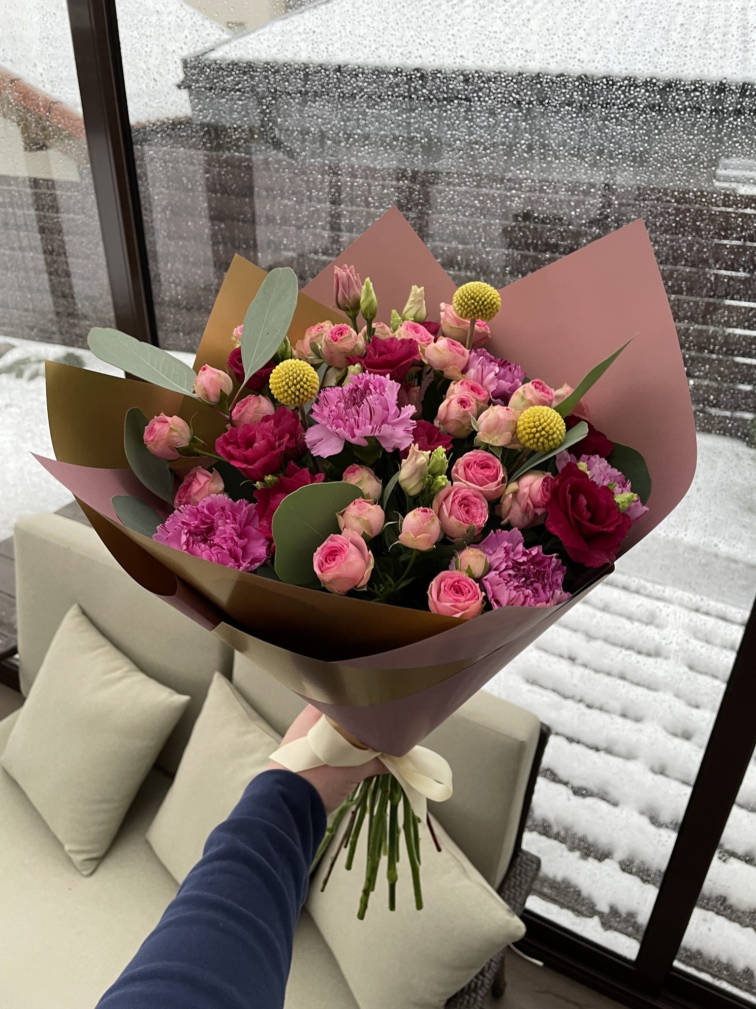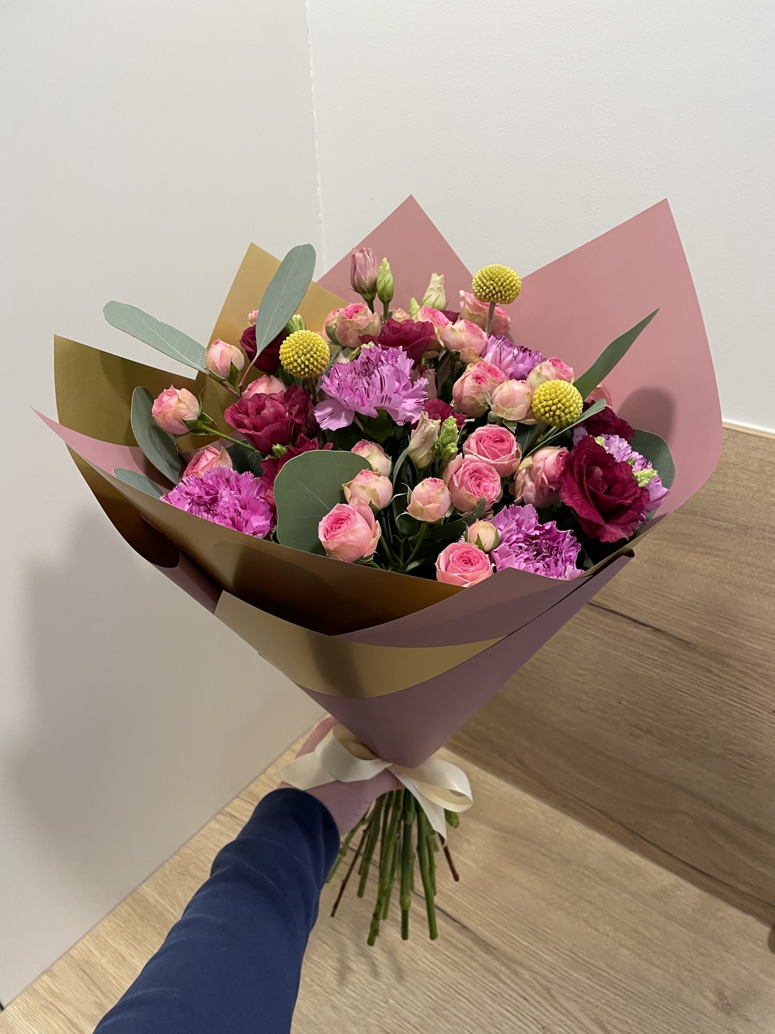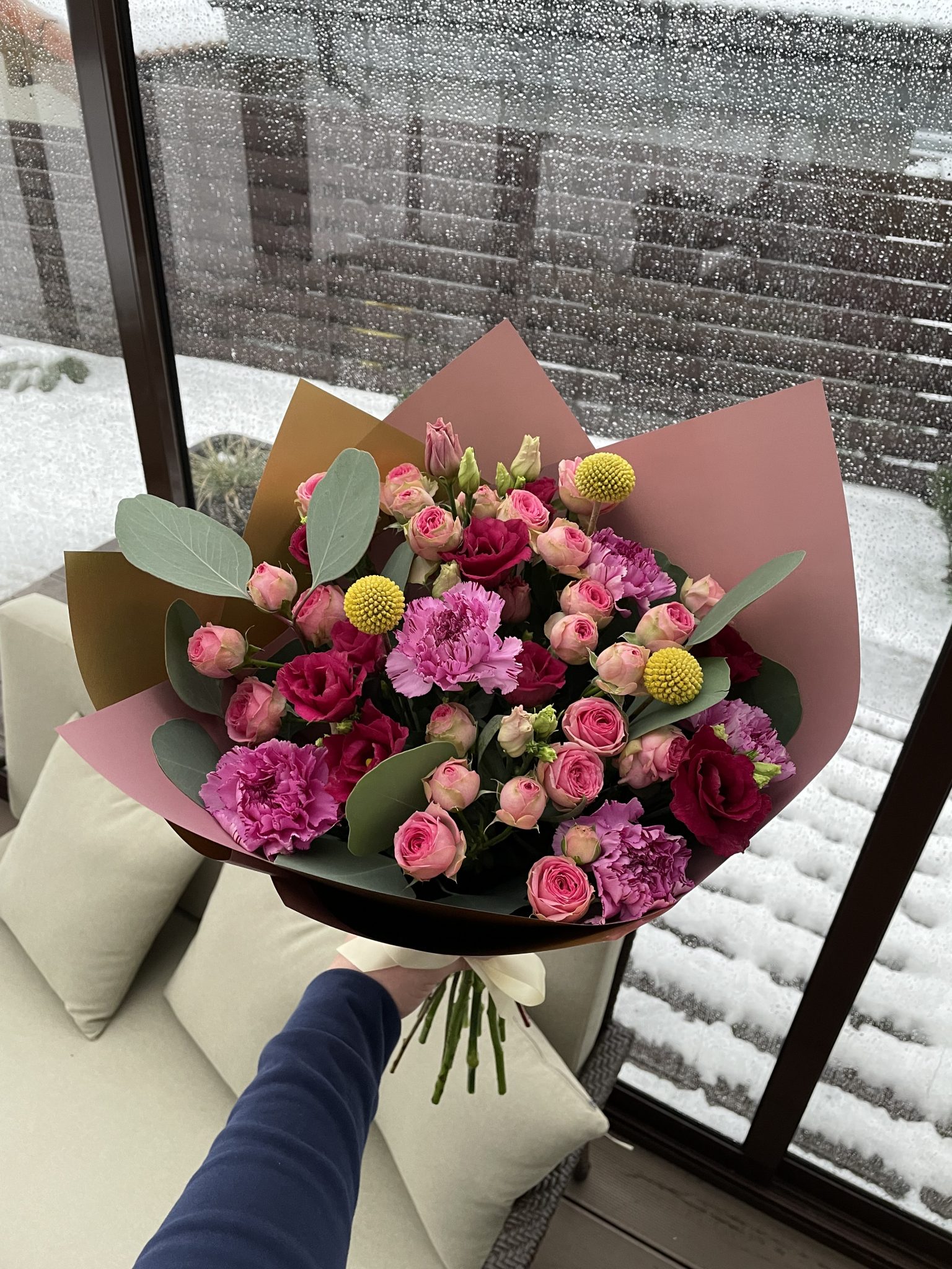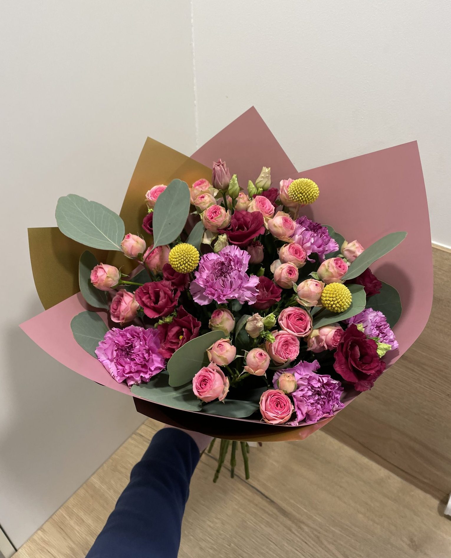 Įvairių gėlių puokštė iš apytiksliai 19 žiedų: violetiniai gvazdikai, bordo eustomos, rausvos smulkiažiedės rožytės, geltonos kraspedijos ir eukaliptas.