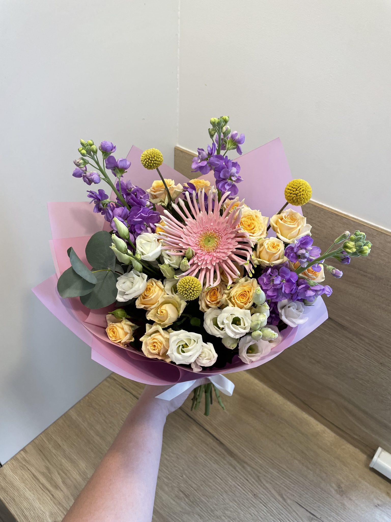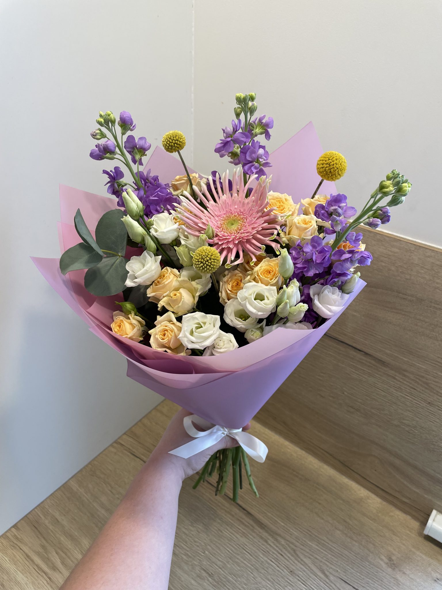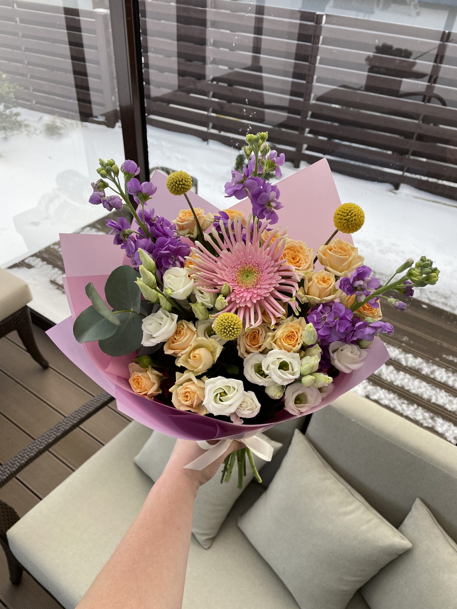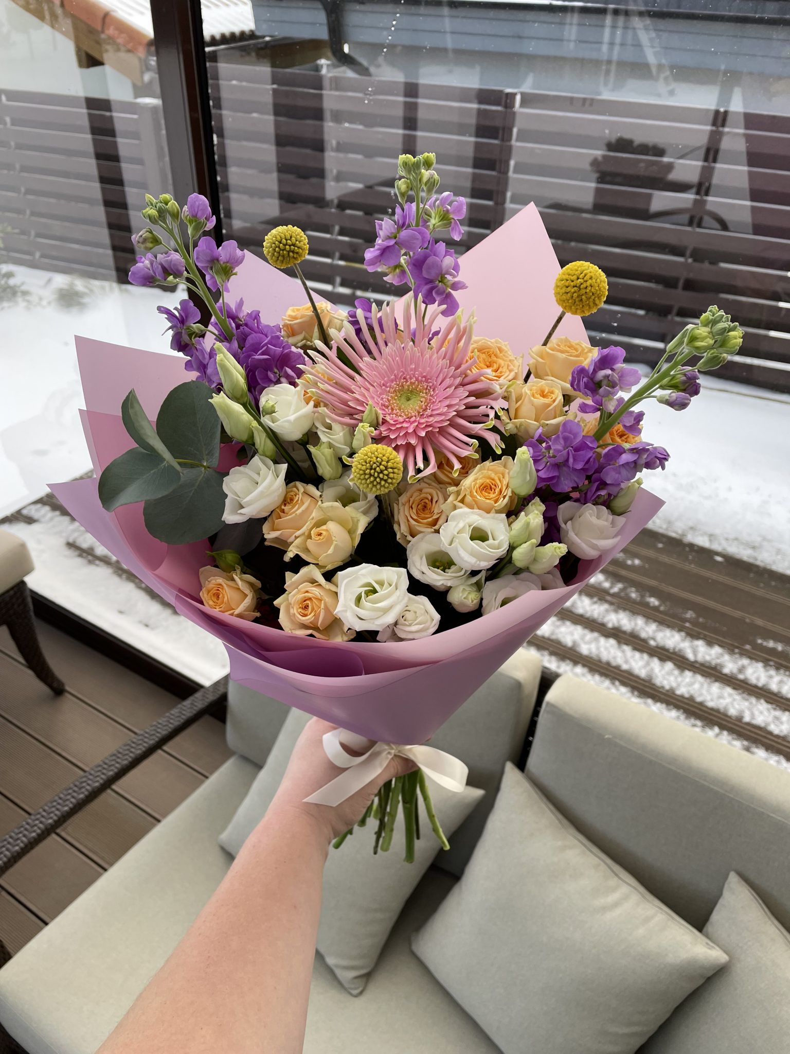 Įvairių gėlių puokštė iš 15 žiedų: išskirtinio grožio banguotoji rausva gerbera, persikinės smulkiažiedės rožytės, baltos eustomos, levandinės matiolos, geltonos kraspedijos ir žaluma eukaliptas.