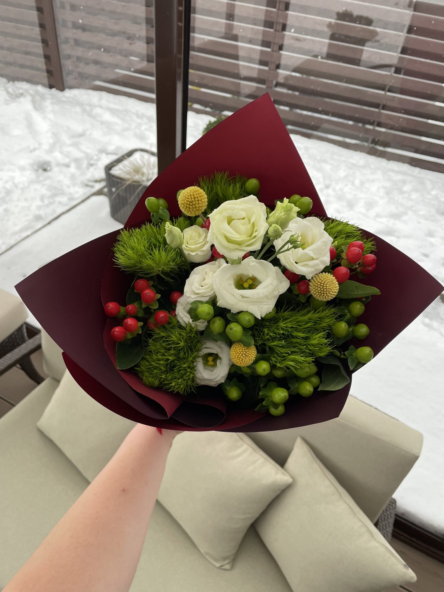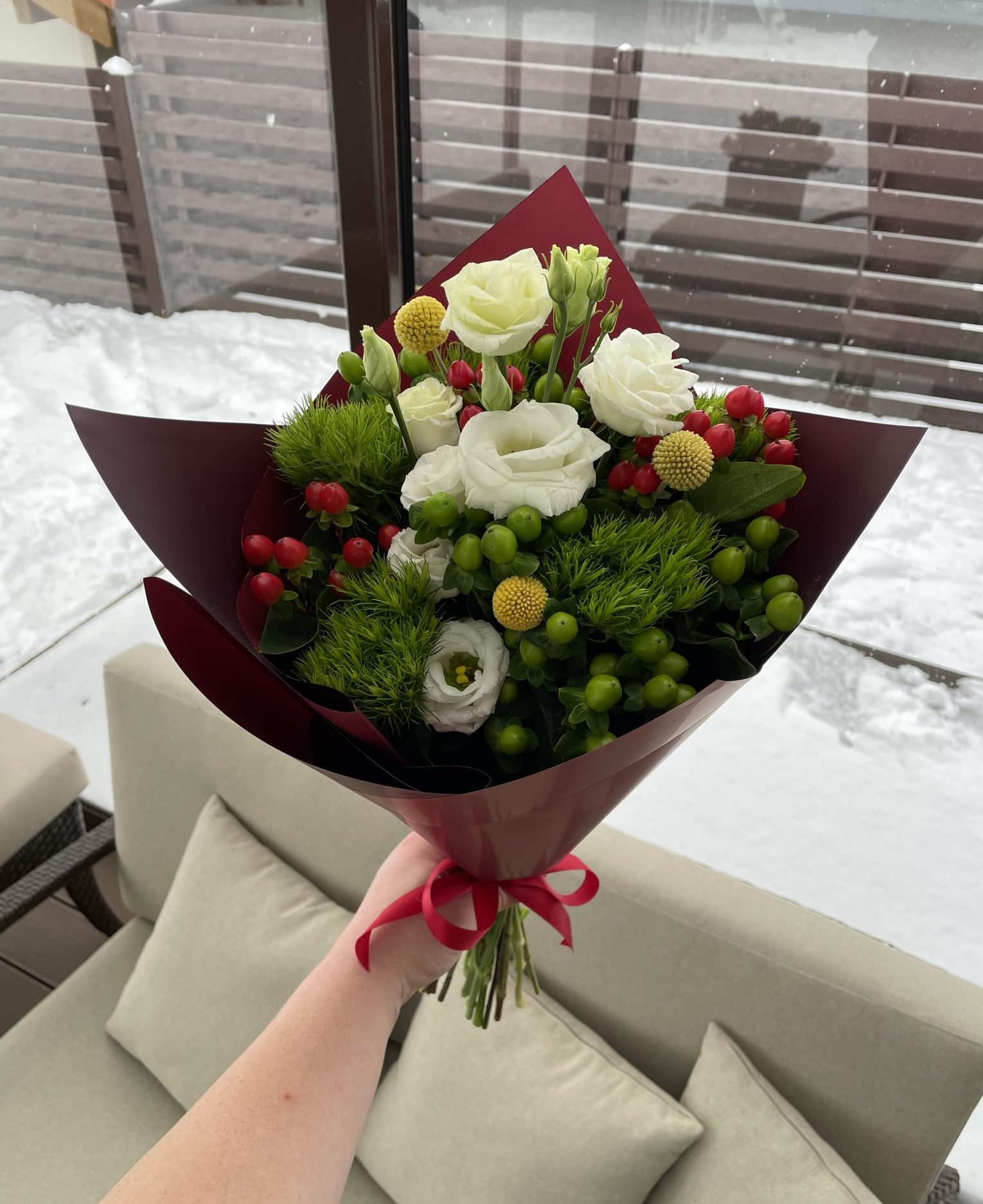 Įvairių gėlių puokštė iš apytiksliai 19 žiedų: žali kamuoliniai gvazdikai, baltos eustomos, žali ir raudoni hiperikumai ir geltonos kraspedijos.