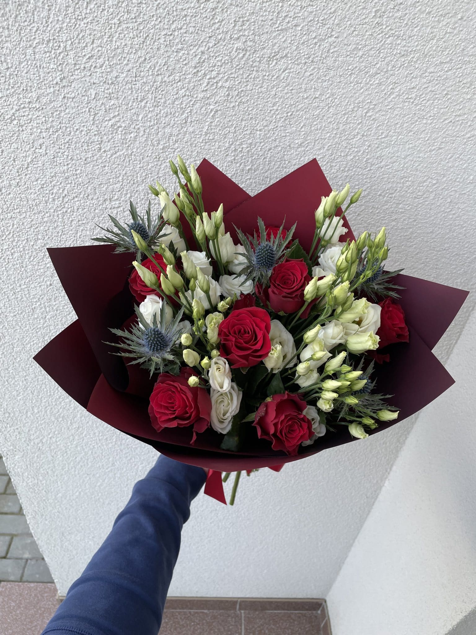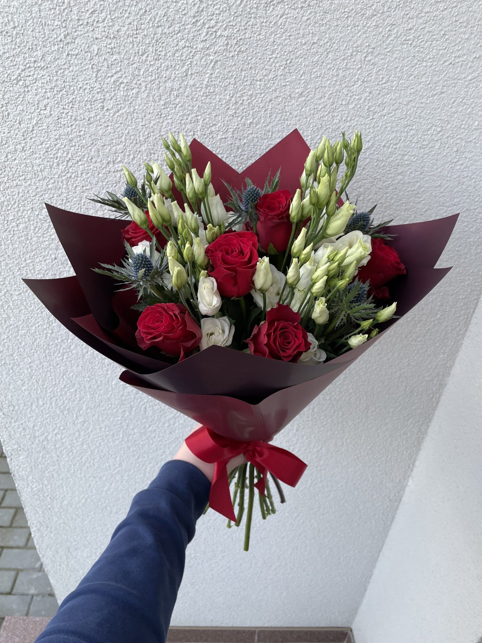 Įvairių gėlių puokštė iš 15 žiedų: Rhodos rožės (7vnt), baltos eustomos (6 šakelės) ir mėlyni ežiukai (2 šakelės).