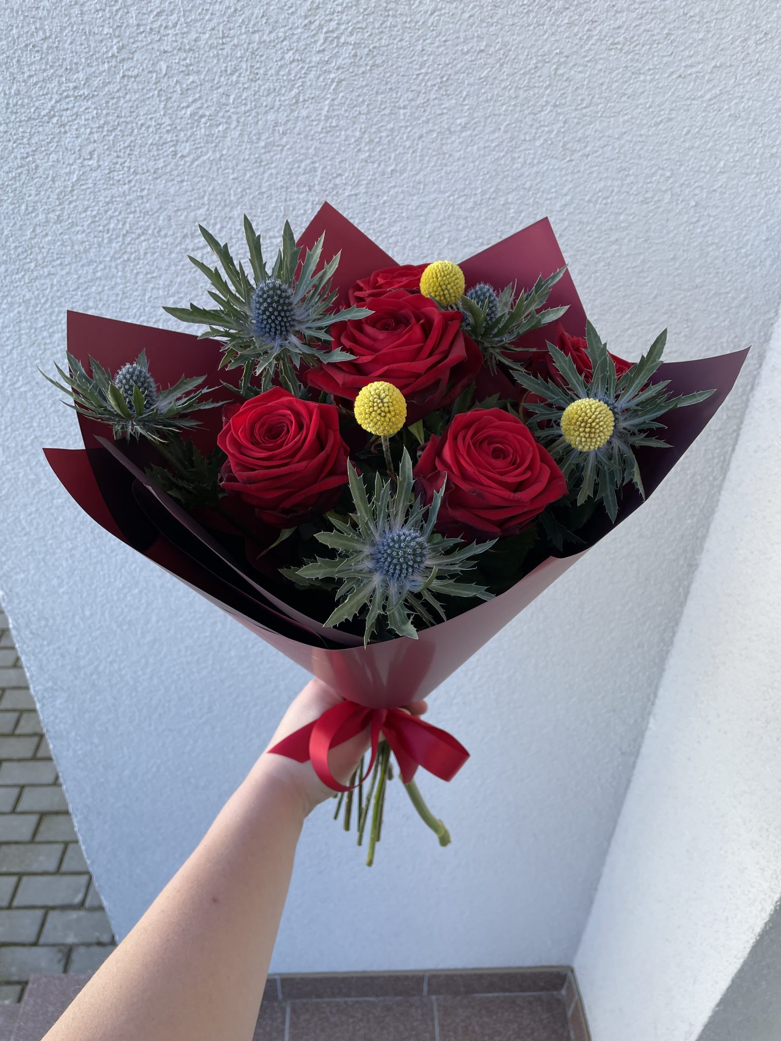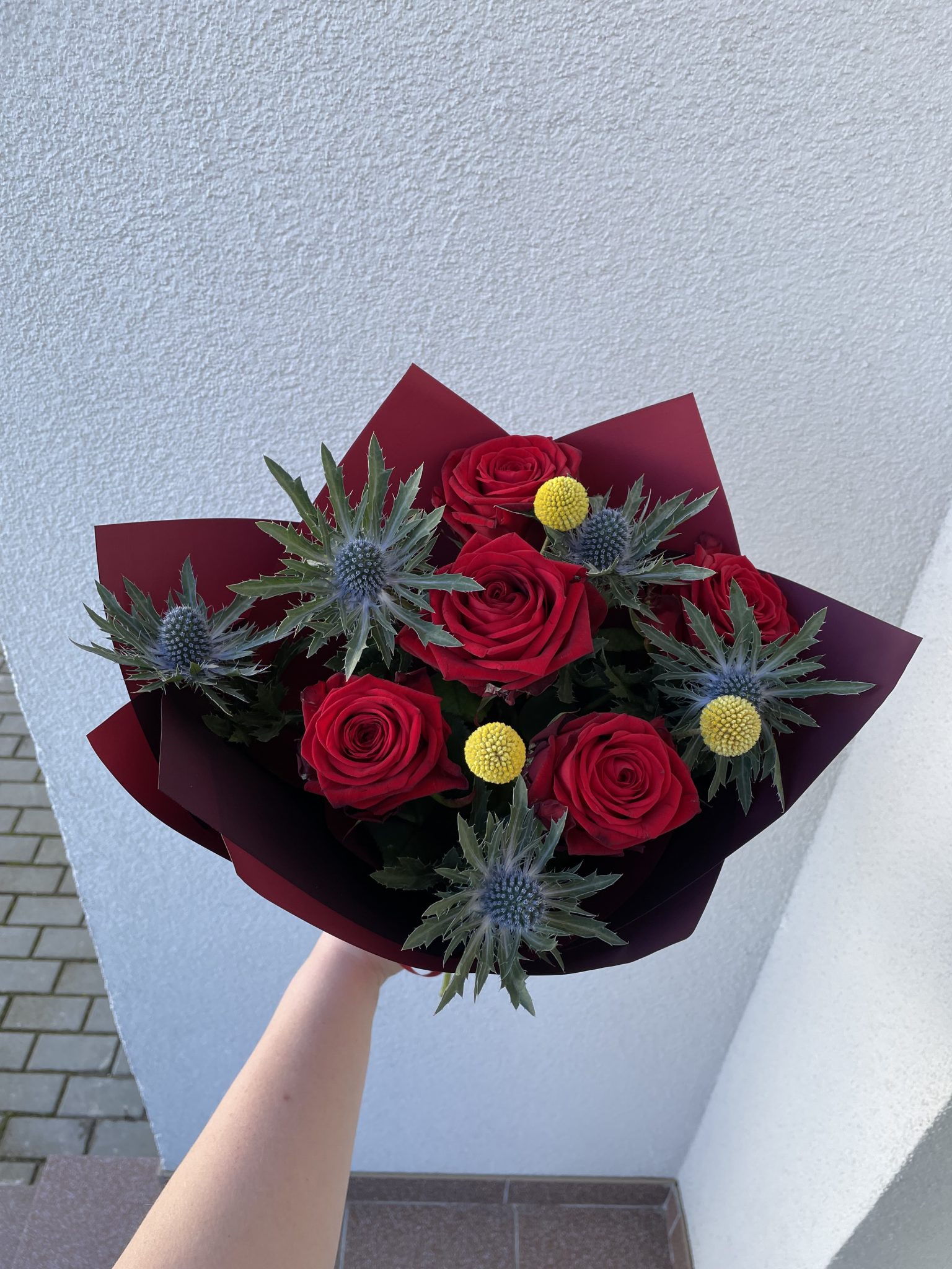 Įvairių gėlių puokštė iš 11 žiedų: Red Naomi karališkos rožės, geltonos kraspedijos ir mėlynos ežiukų šakelės.