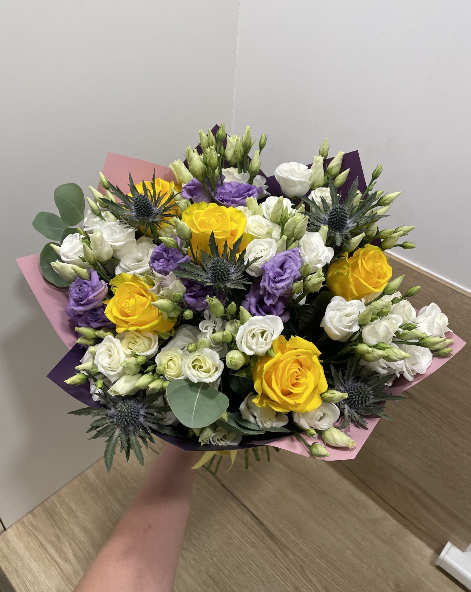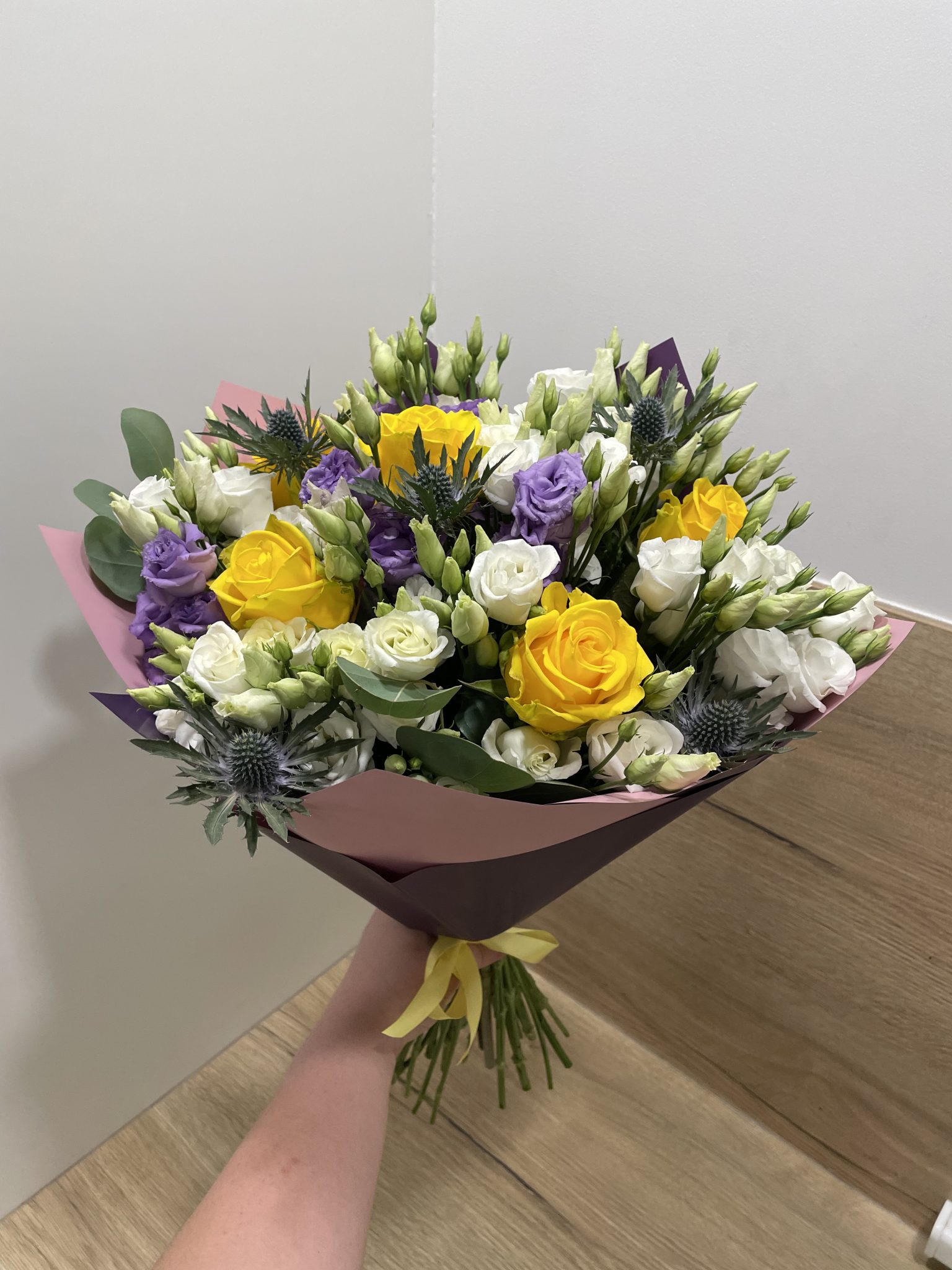 Įvairių gėlių puokštė iš 29 žiedų: geltonos rožės, baltos ir levandinės eustomos bei mėlyni ežiukai ir žaluma eukaliptas.