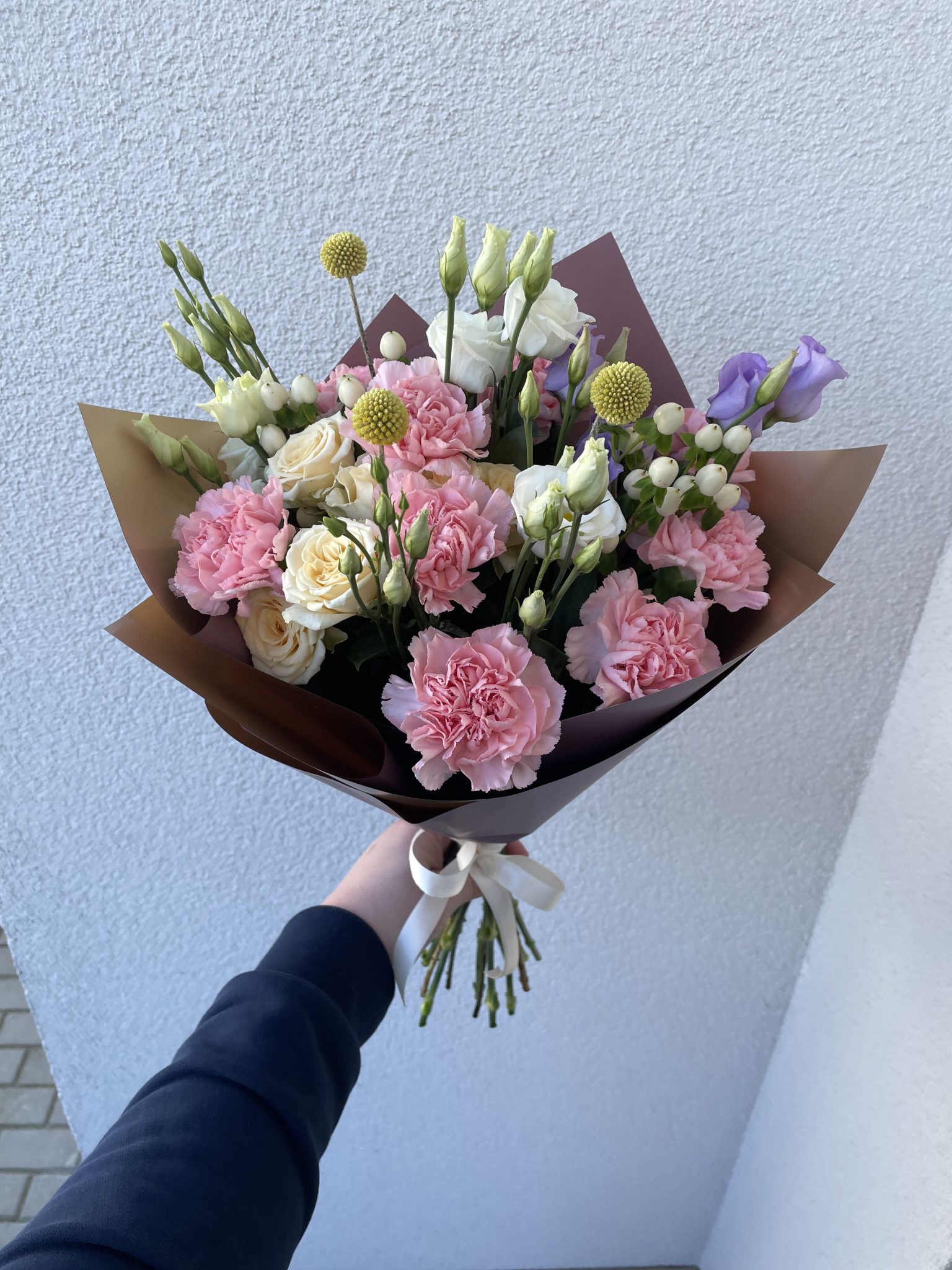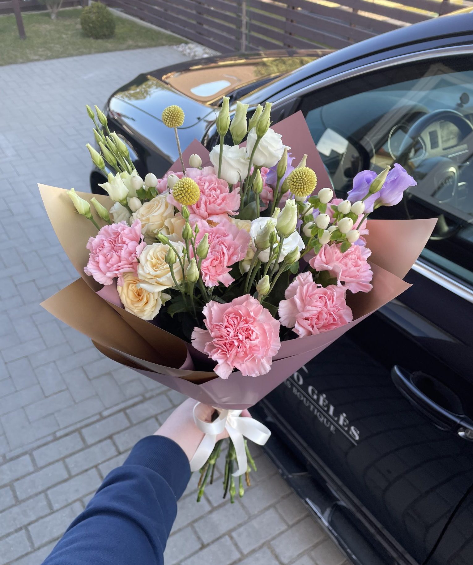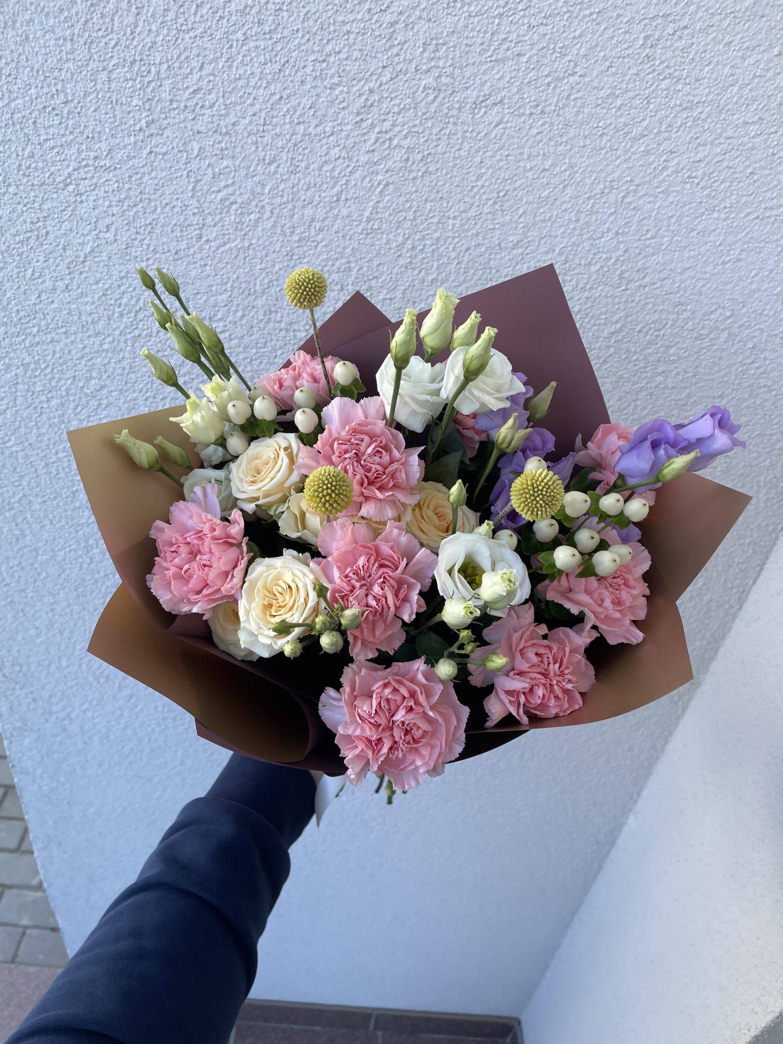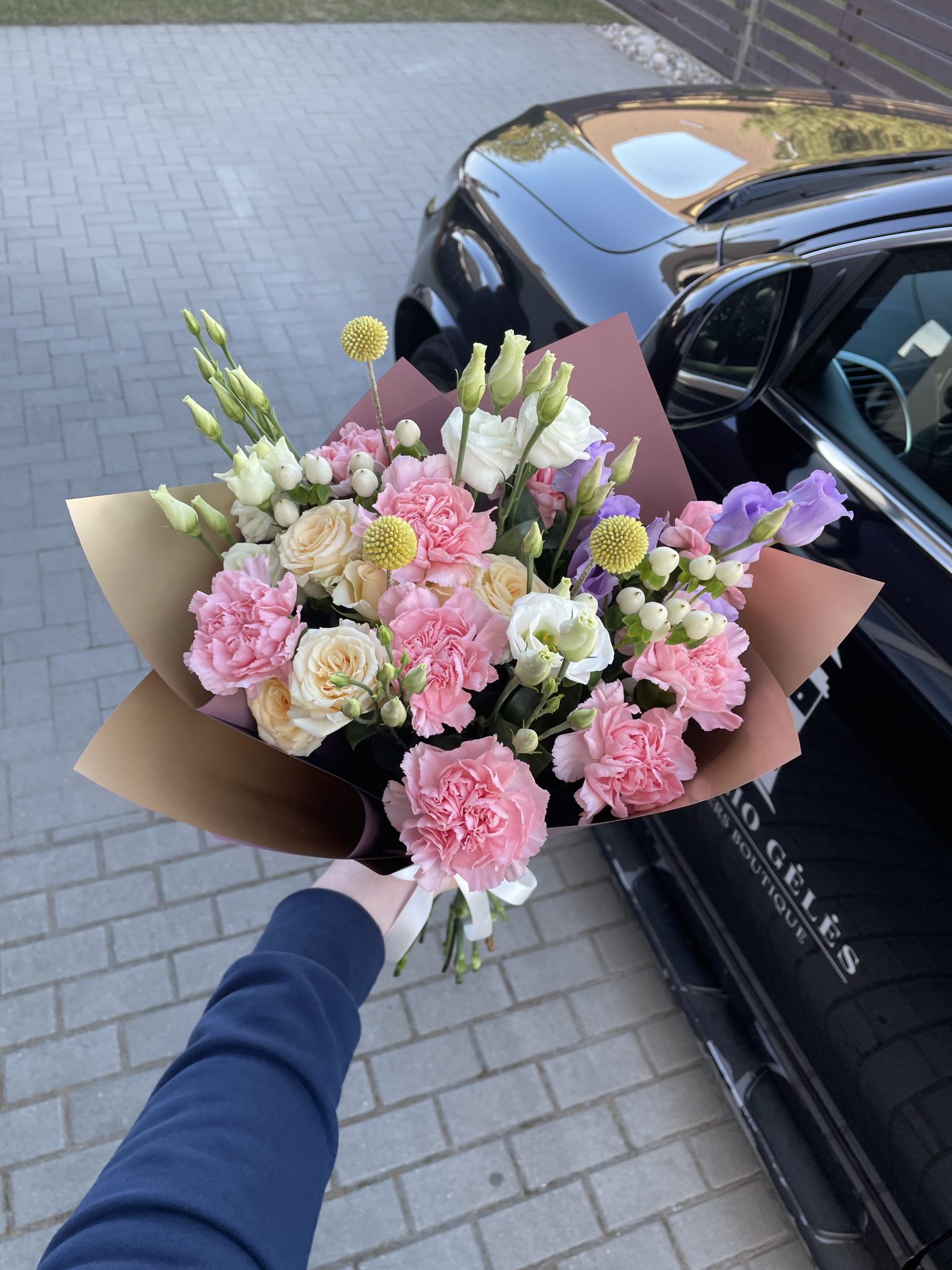 Įvairių gėlių puokštė iš 19 žiedų: rausvi gvazdikai, persikinės smulkiažiedės rožytės, levandinės ir baltos eustomos, balti hiperikumai ir geltonos kraspedijos.