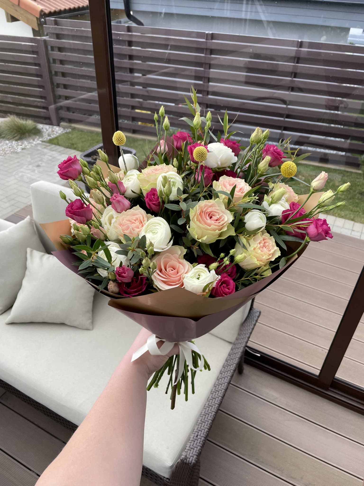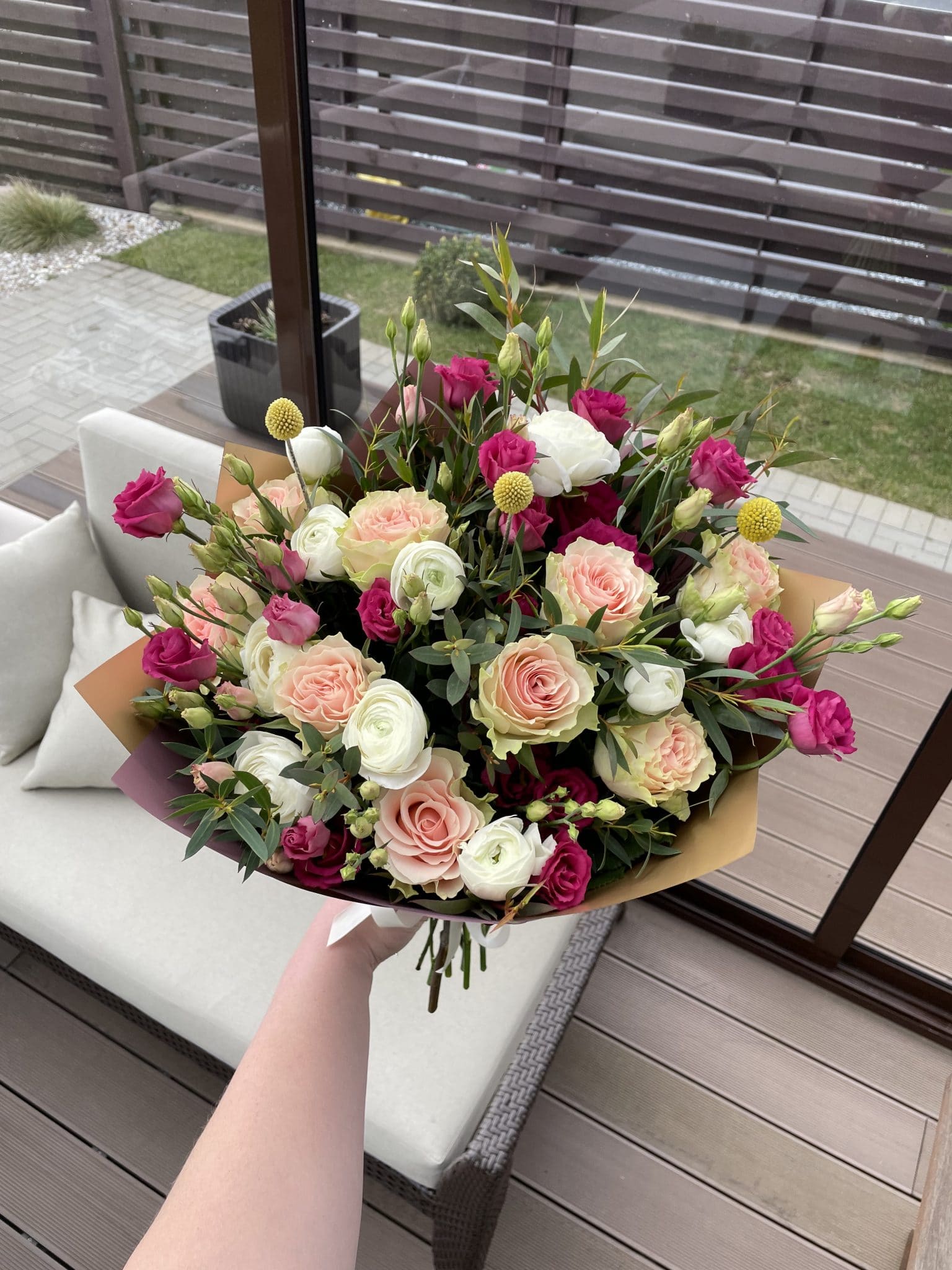 Įvairių gėlių puokštė iš 37 žiedų: pastelinės rausvos rožės, bordo eustomos, balti ranonai, geltonos kraspedijos ir žaluma eukaliptas.