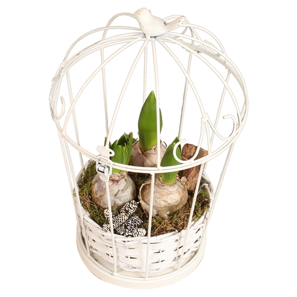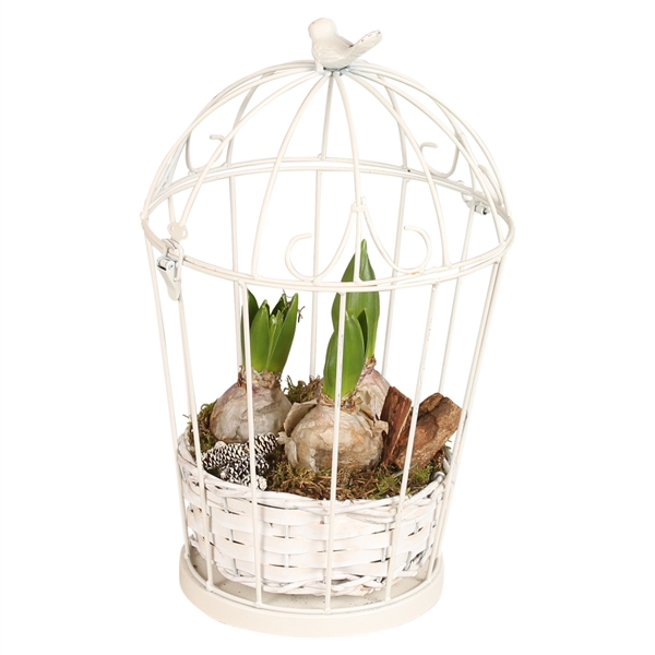 Jacintų kompozicija uždarame narvelyje, puiki dovana Velykų ar pavasario proga.