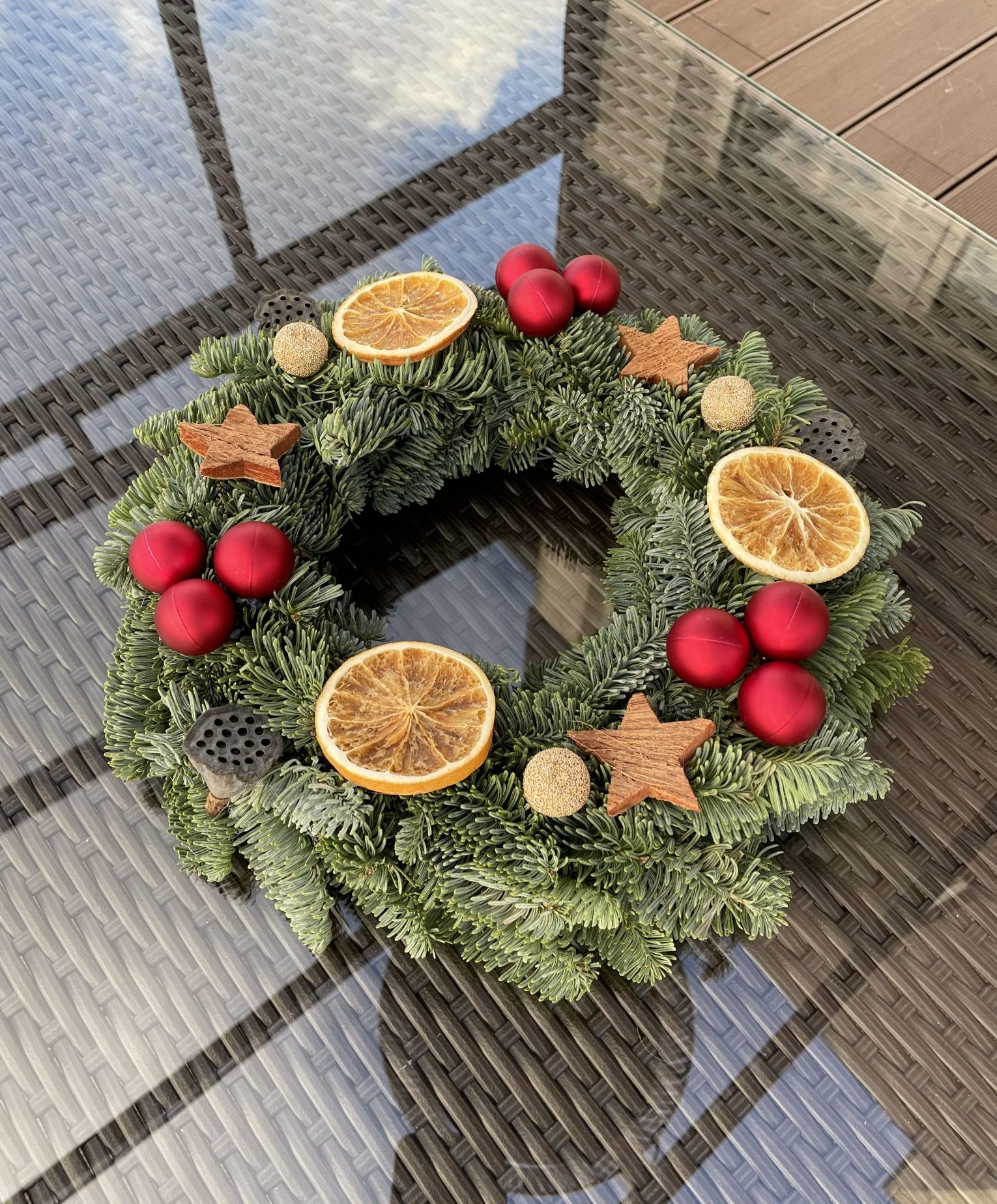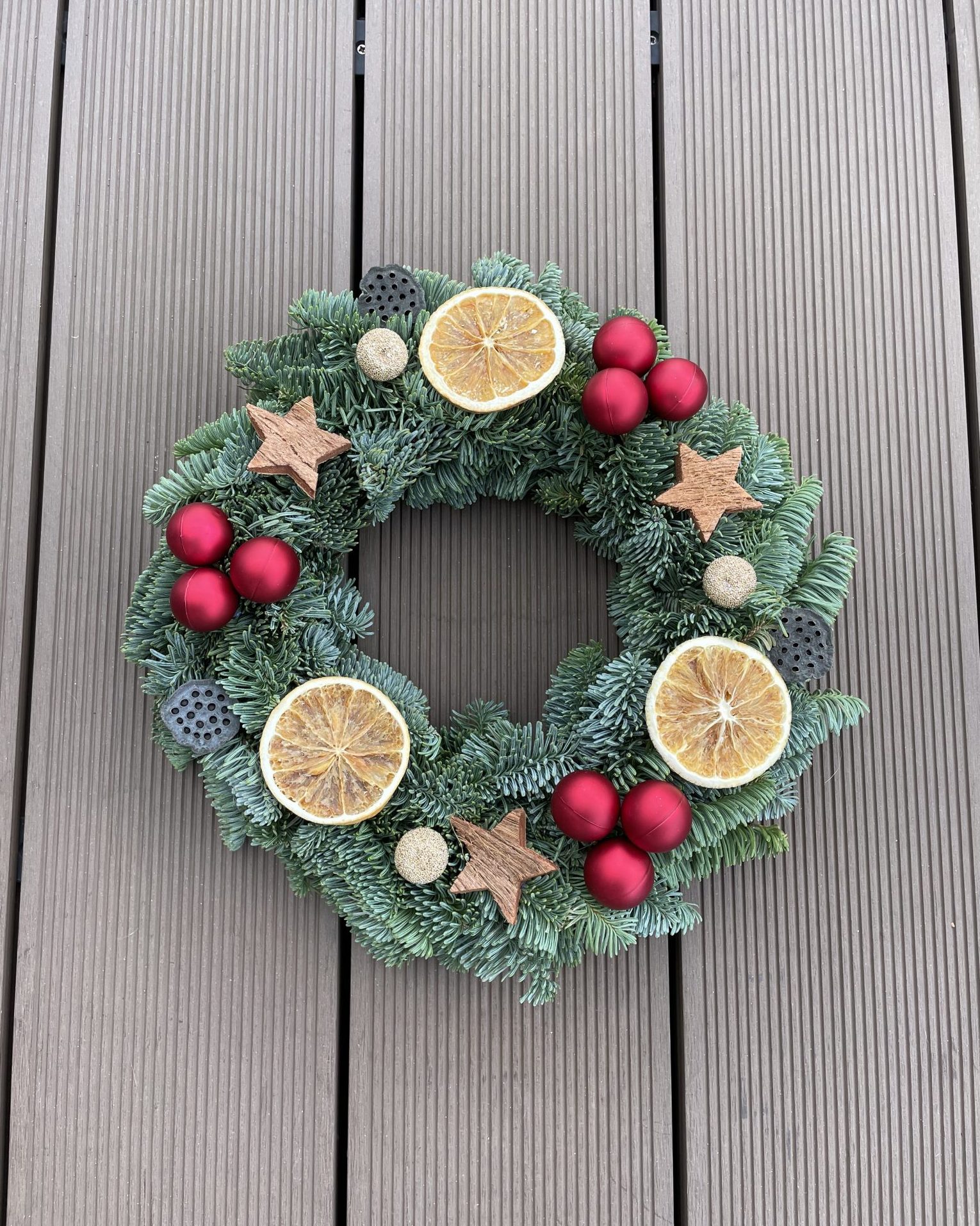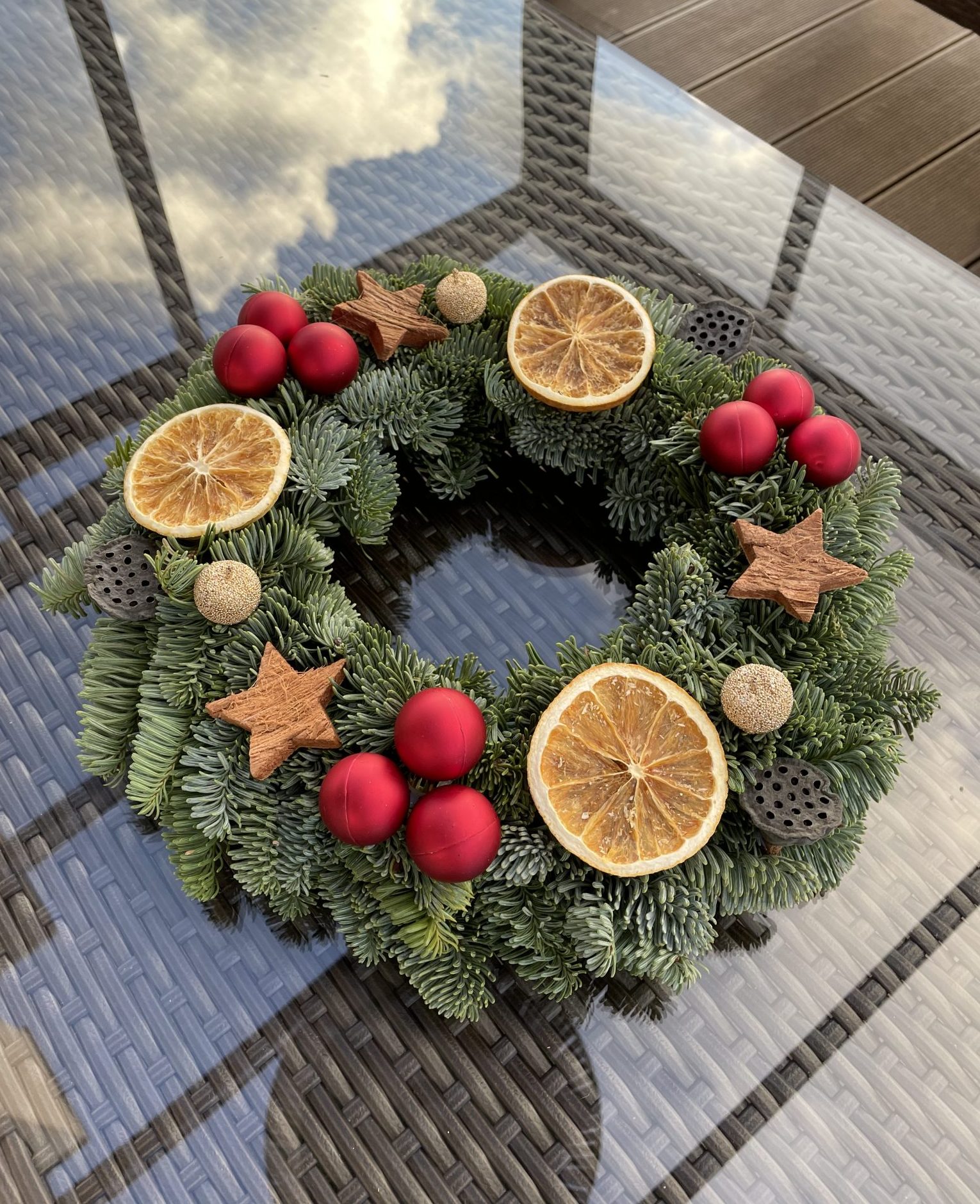 Kalėdinis vainikas iš mėlynojo kenio šakų, kurio skersmuo apie 30cm.