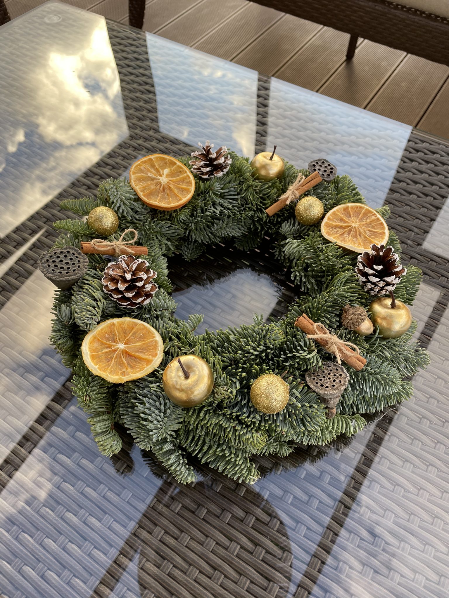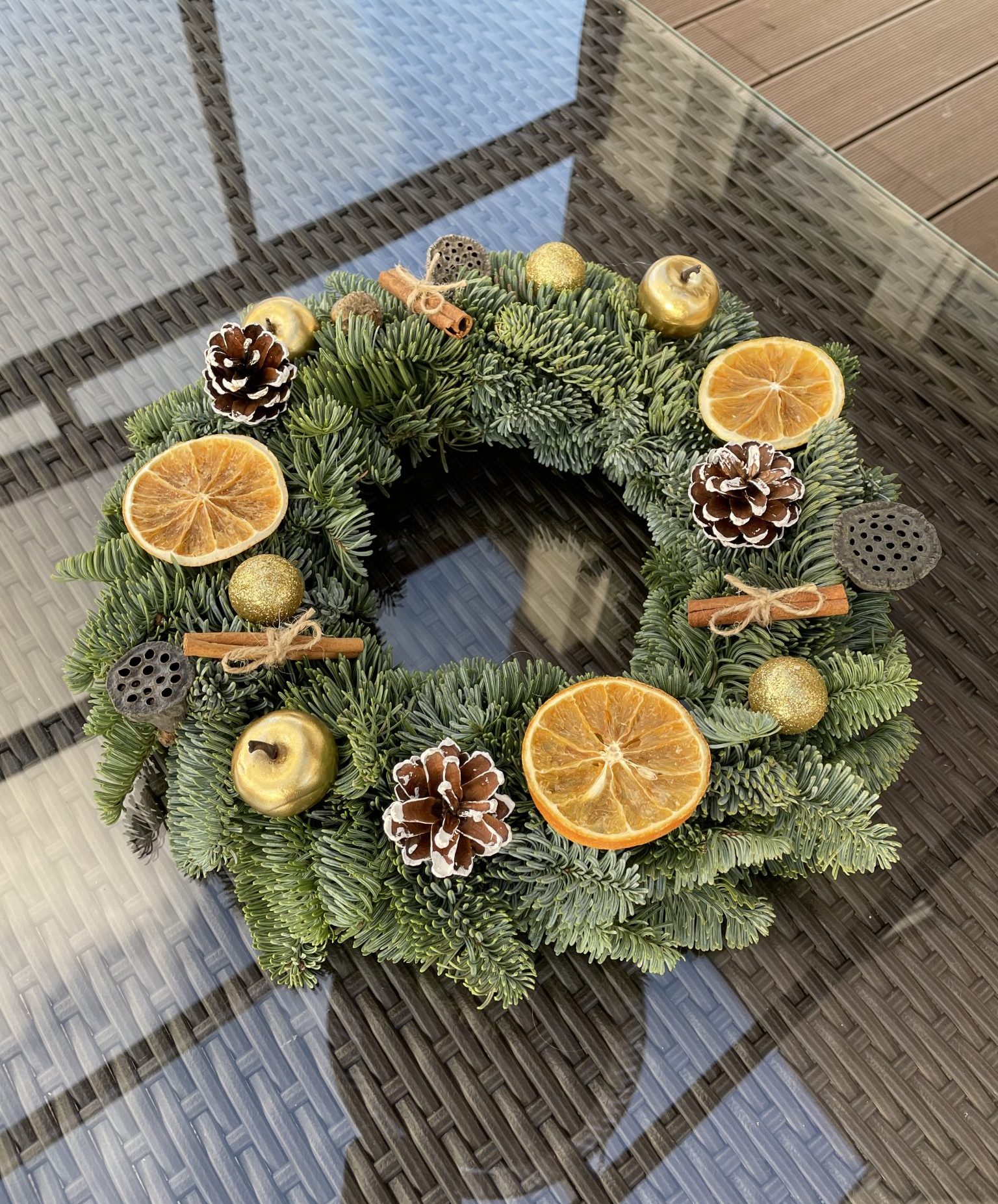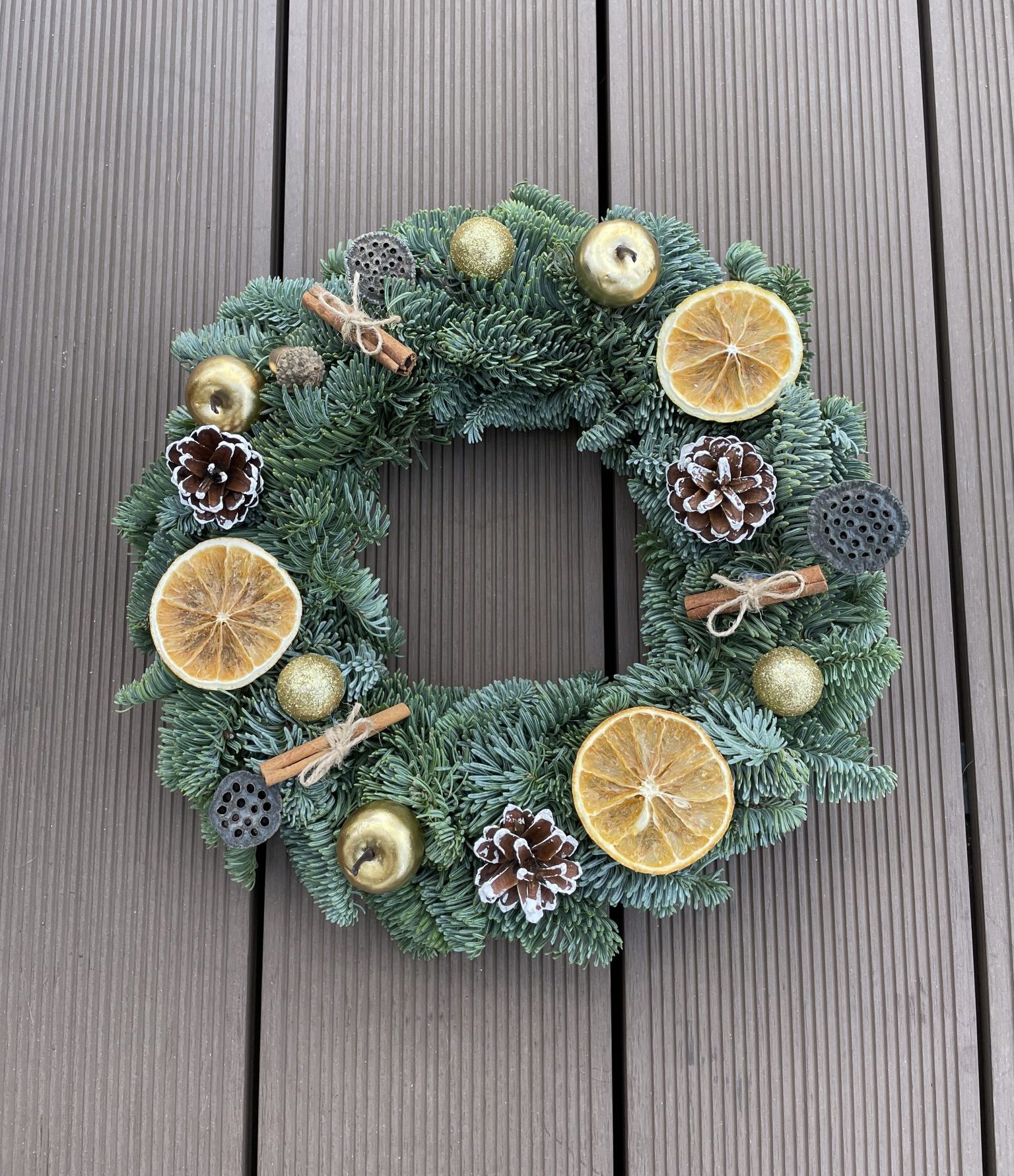 Kalėdinis vainikas iš mėlynojo kenio šakų, kurio skersmuo apie 30cm.