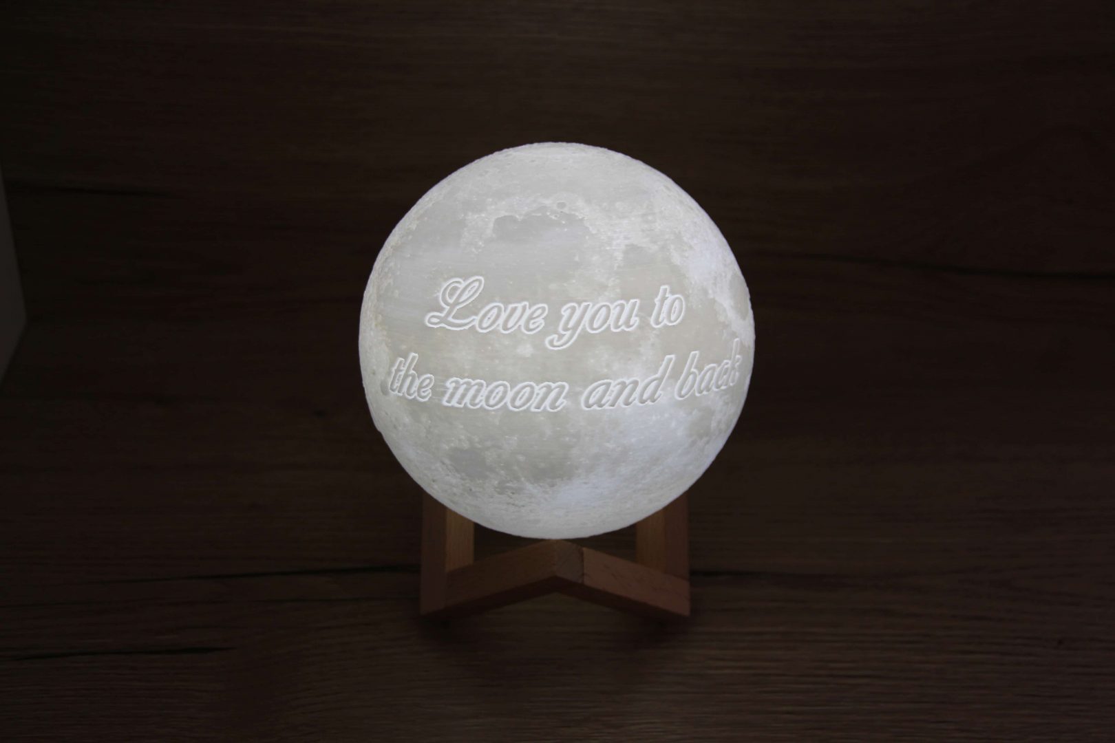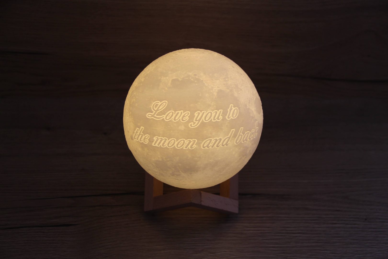Švienčiantis mėnulis su užrašu “Love you to the moon and back”.