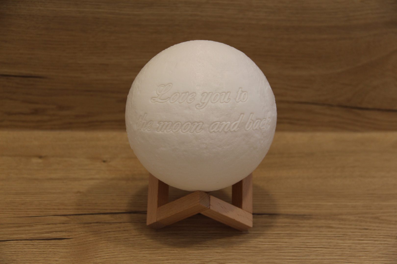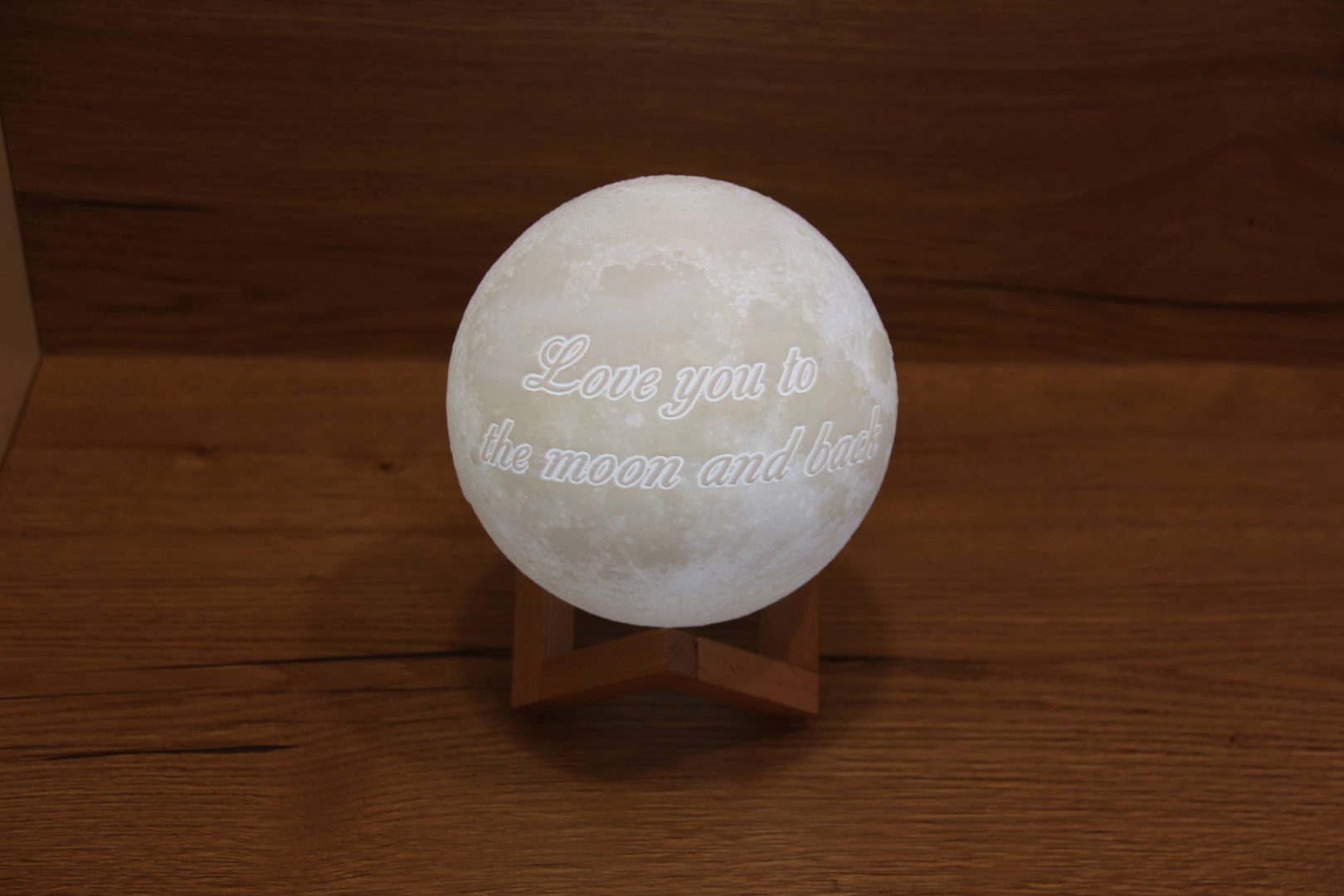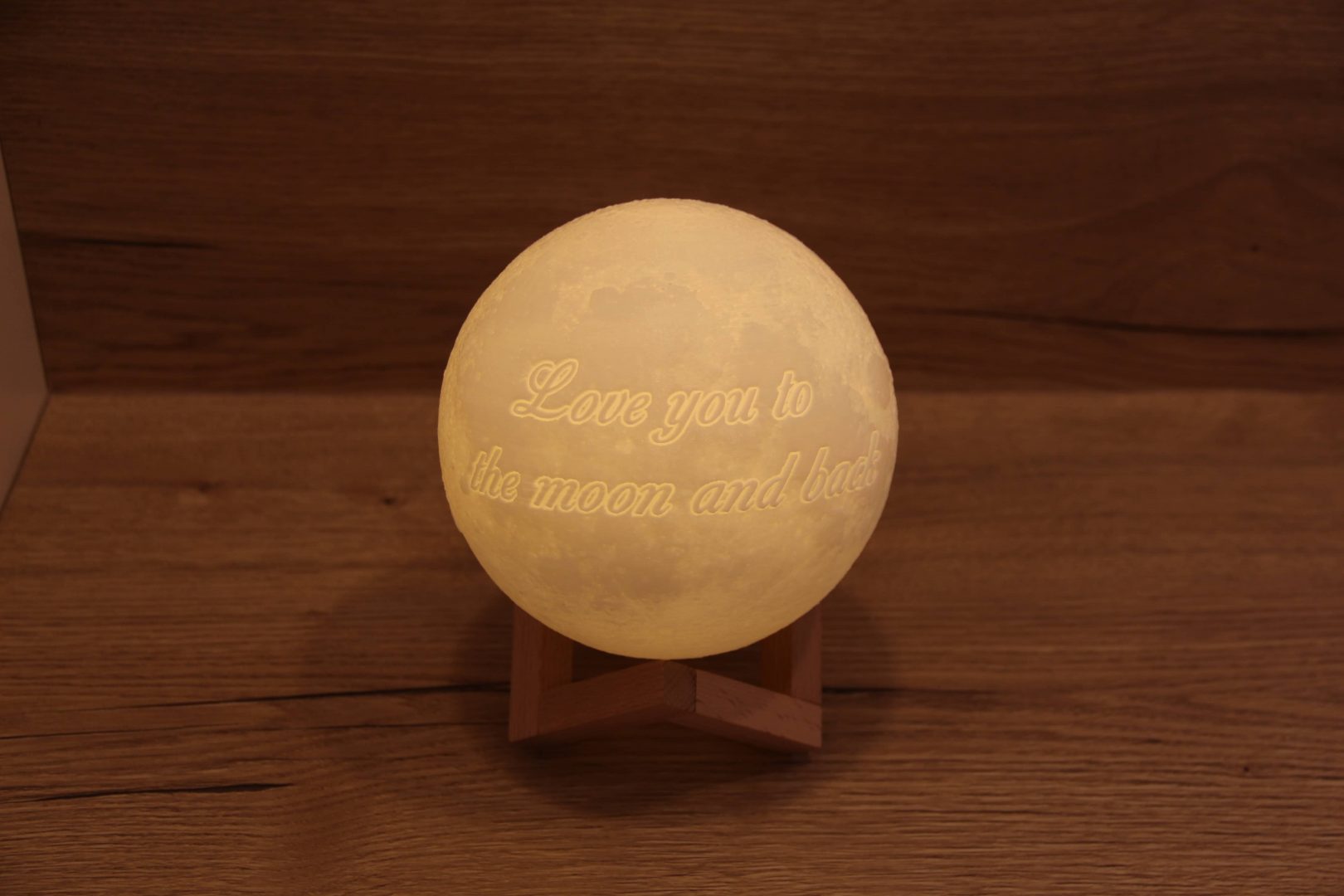 Mėnulio skersmuo – 18cm, dviejų spalvų: šiltai ir šaltai baltos, spalvą pakeičia palietus, bazė – medinė, pakraunamas USB laidu.