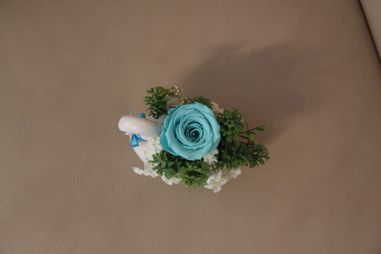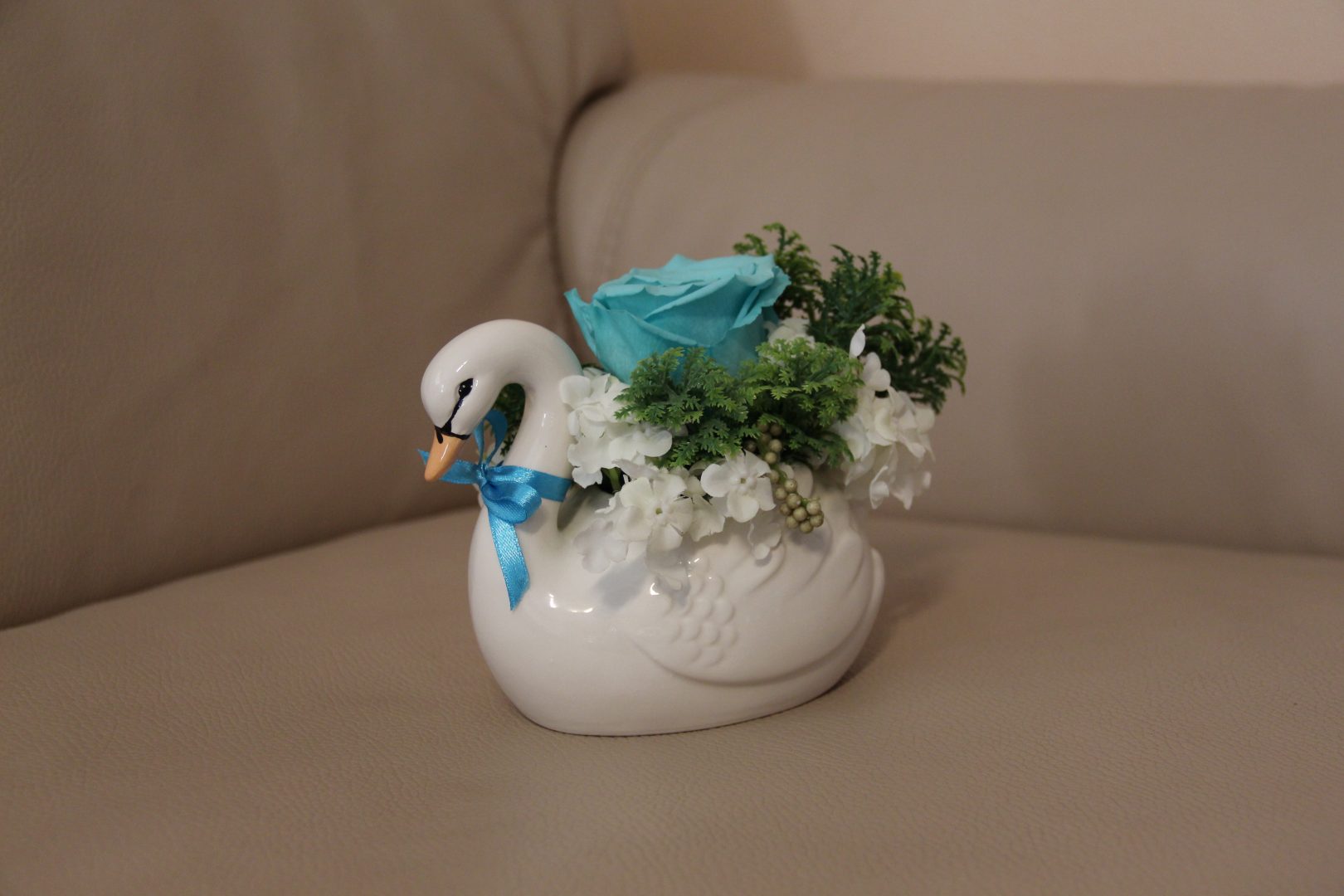 Balta, grakšti gulbė ir mieganti mėtinė rožė su dirbtine žaluma puikiai tiks krikštynų, vaikelio gimimo ar gimtadienio proga.