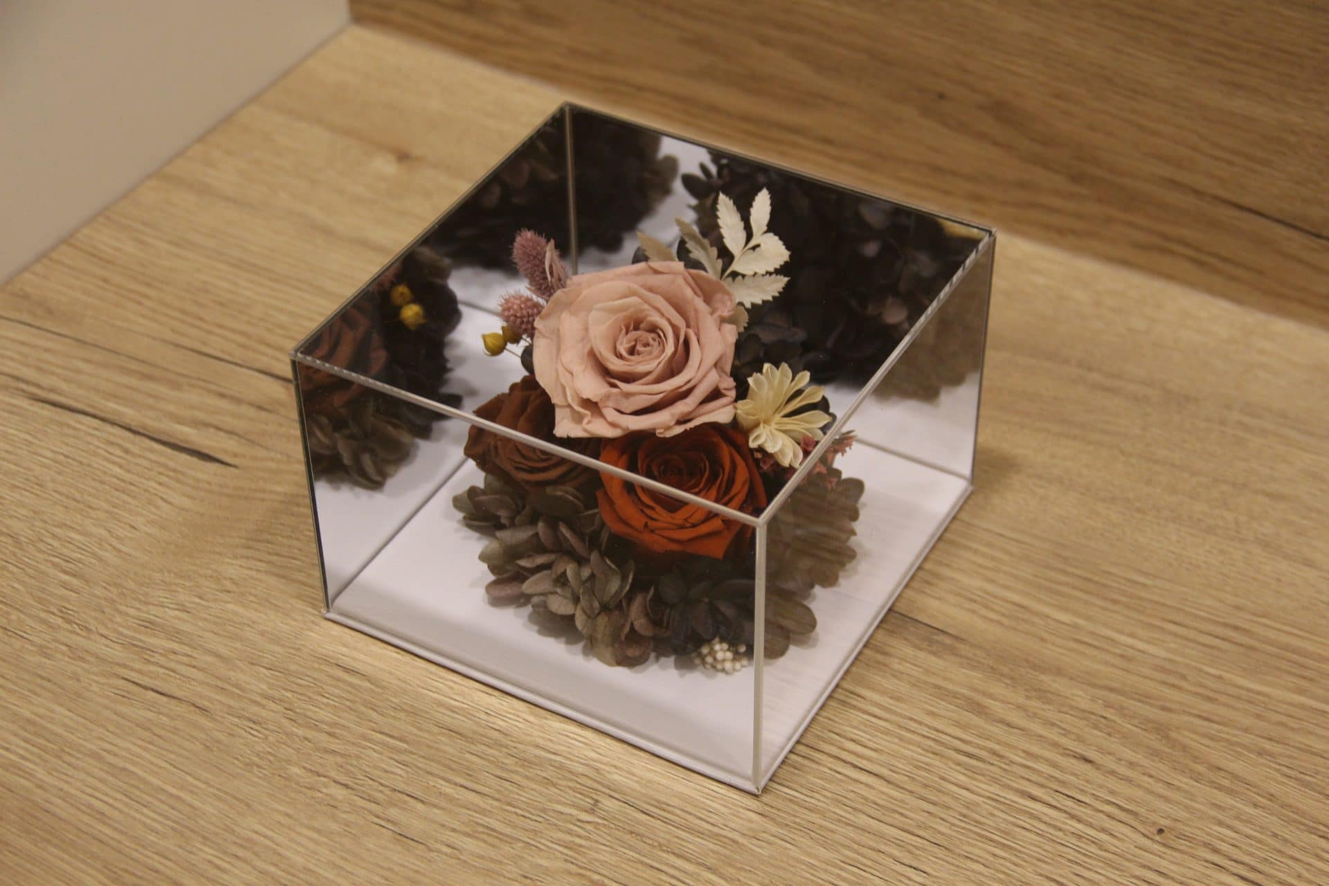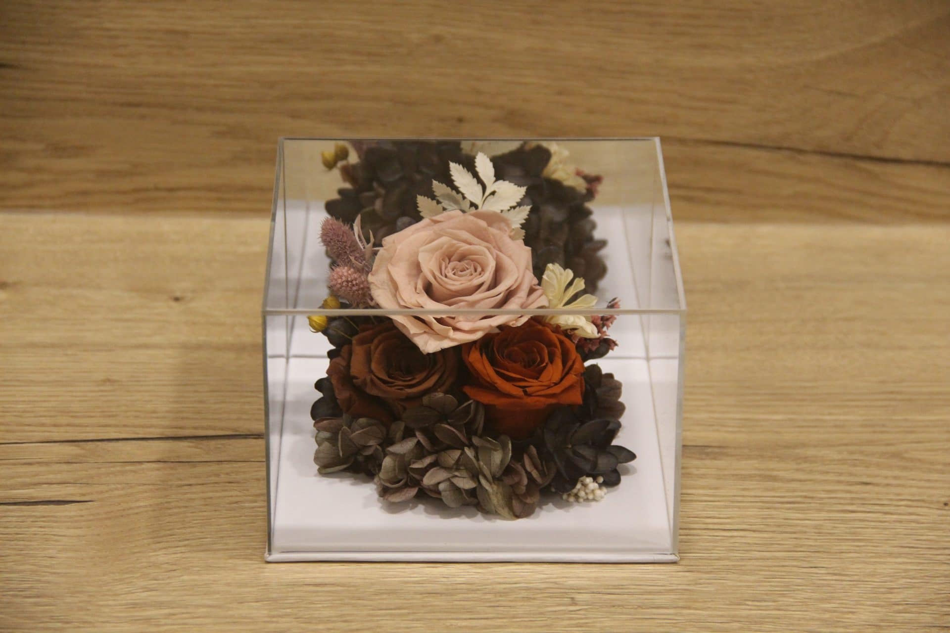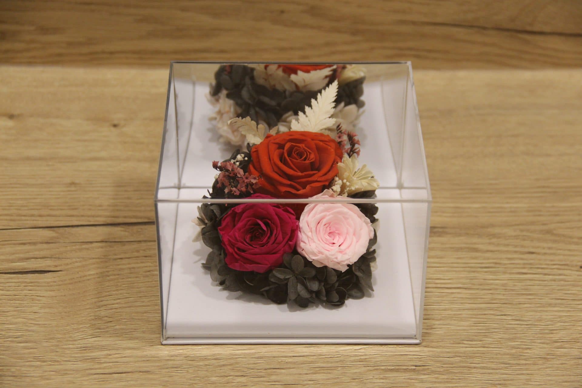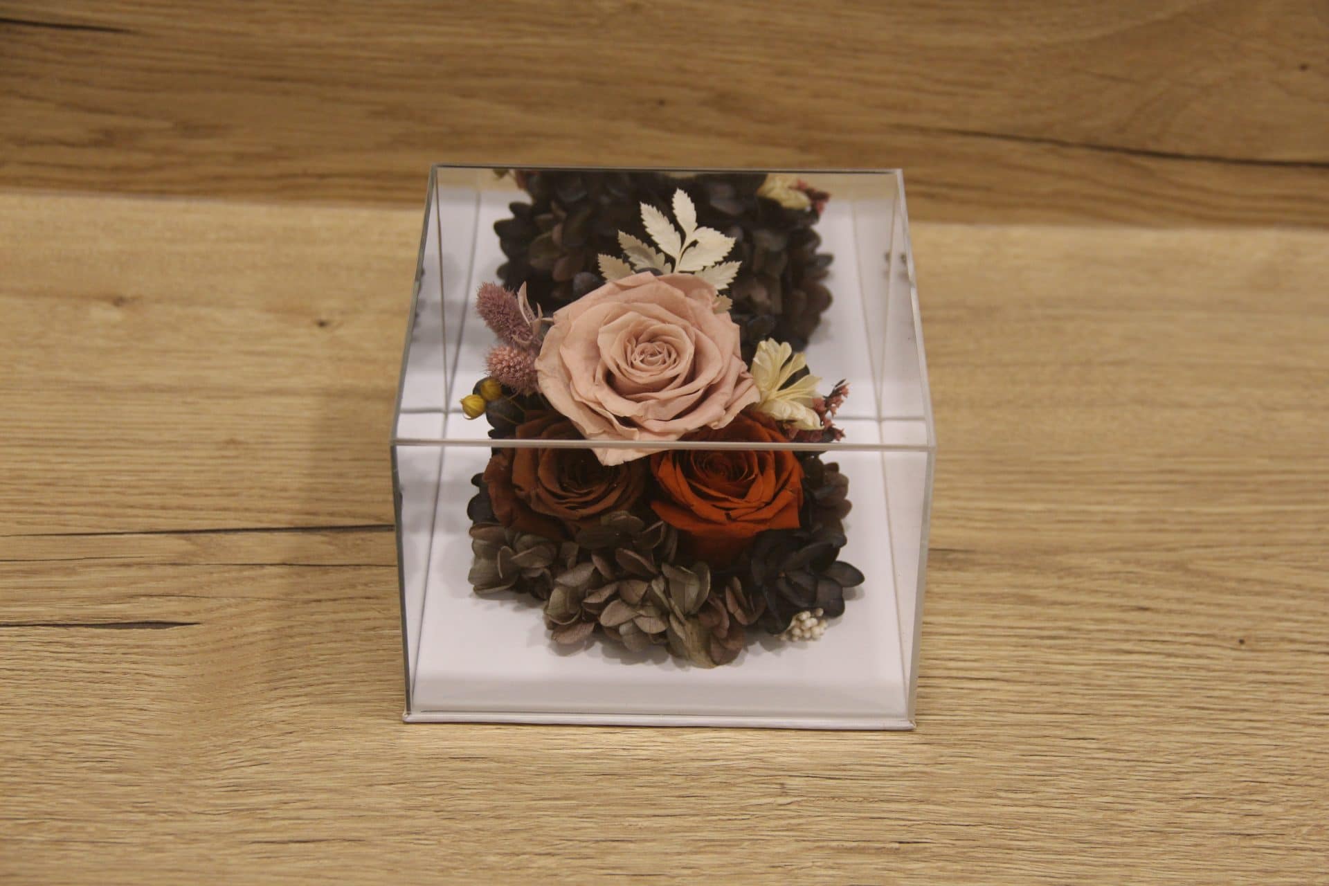 Mieganti puokštė akrilinėje dėžutėje, kurioje rasite tris miegančias rožes, hortenzijų šakeles ir kitą stabilizuotą žalumą.