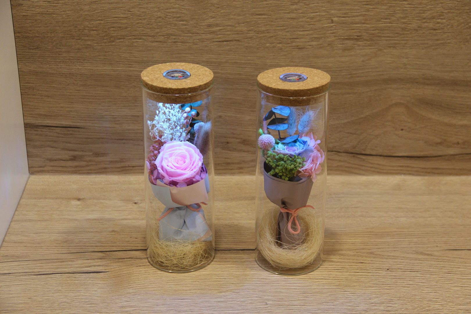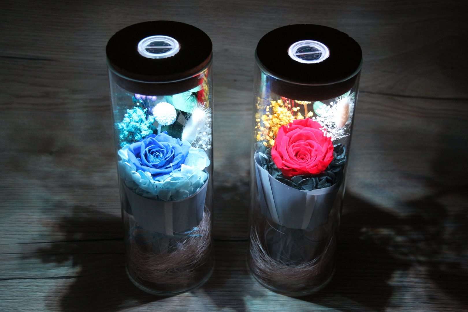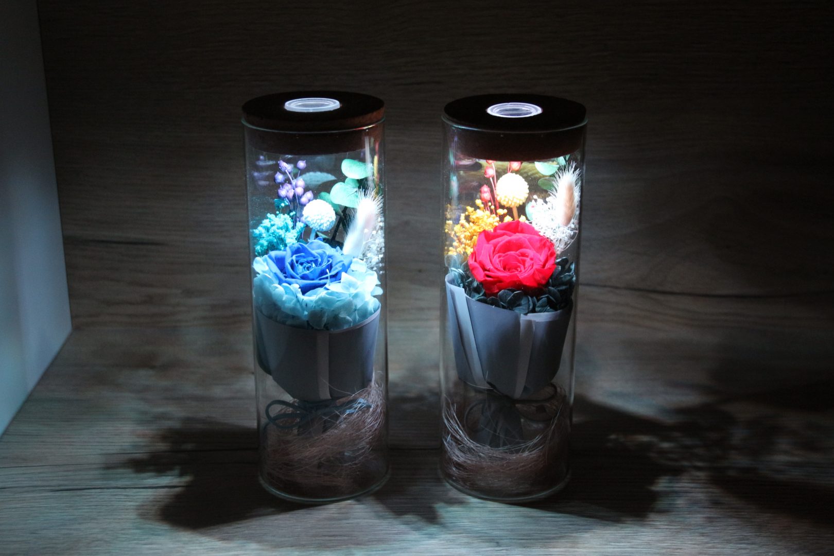 Puokštė patalpinta į stiklinę vazą, kuri apšviečiama LED lemputėmis, kurių spalvos ir švietimo funkcijos valdomos su pulteliu.