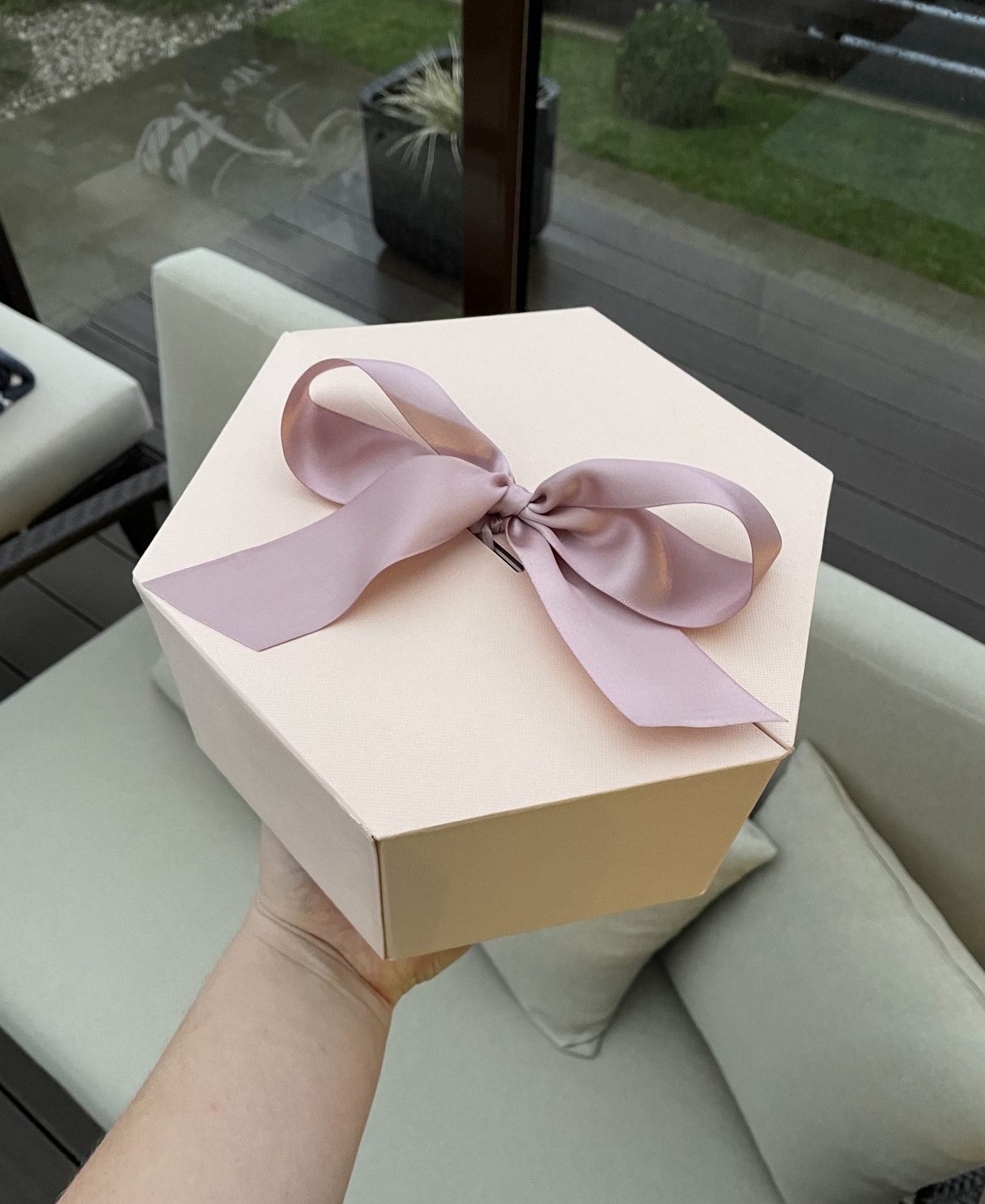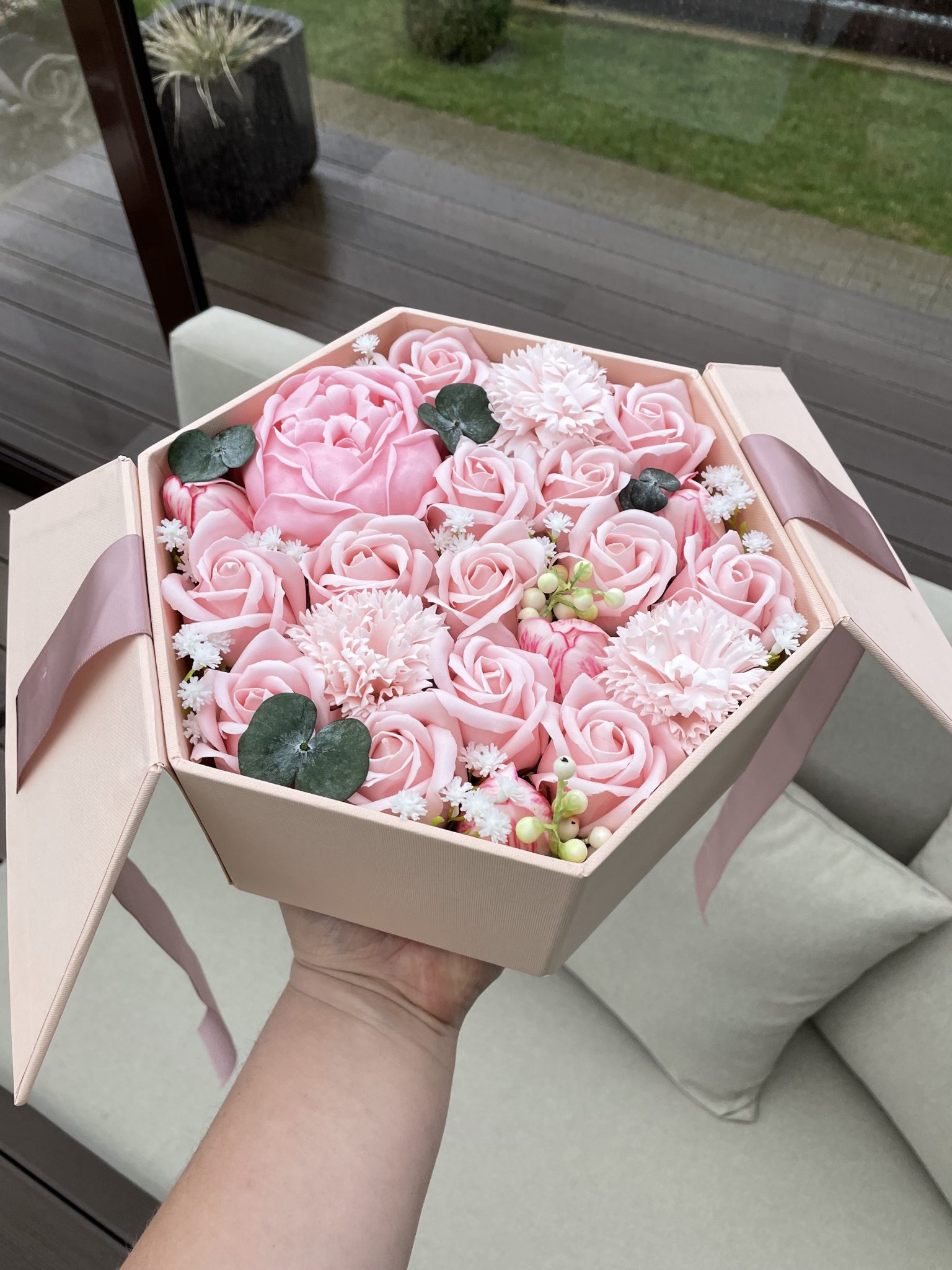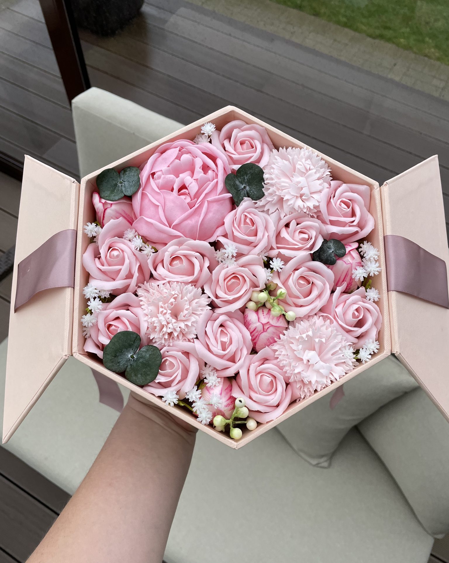 Muilo gėlių kompozicija rausvoje dėžutėje, kurioje: bijūnas, rožės, tulpės, gvazdikai ir žaluma.