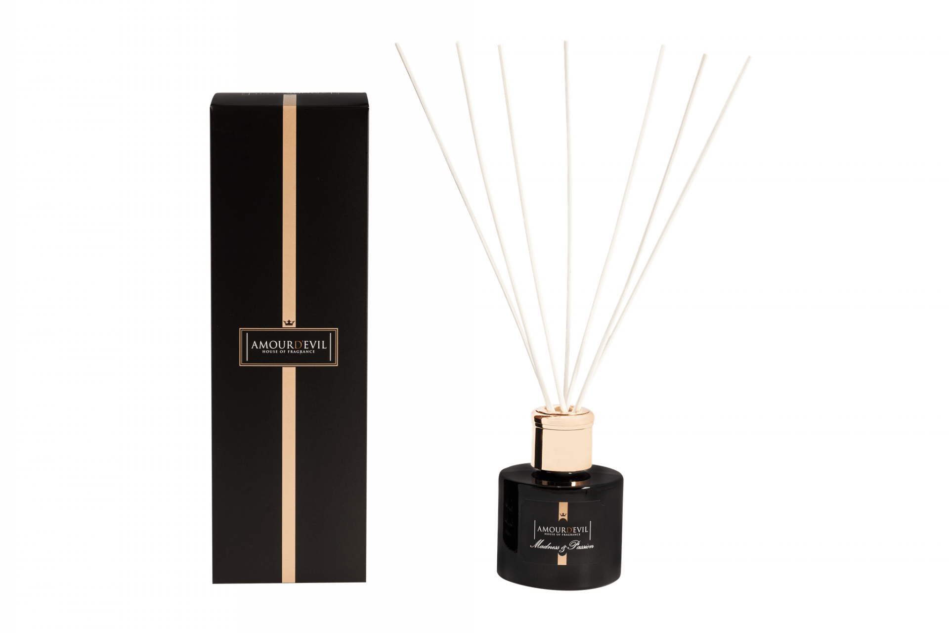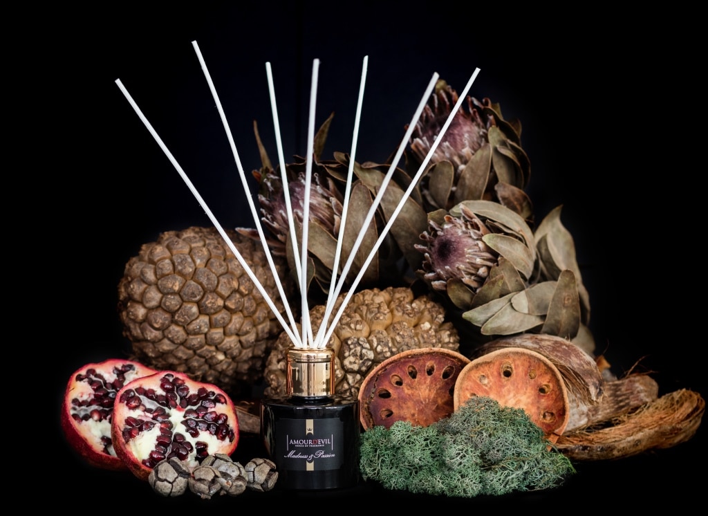 Svaigus vaisių ir medžio derinys kerintis savo saldumu. Intensyvus granatų ir raudonosios vynuogės junginys persmelktas pačiulių natomis. Prabangos dvelksmas lydimas muskuso ir medienos dar labiau sustiprina vaisių paletę. Švelniai juntamos gintaro natos įneša intriguojančio sodrumo. Tai kontrastinga kompozicija lydima salstelėjusių vaisių gaivos. Prabangus AmourD’evil namų kvapas patiks parfumerijos herojams nebijantiems rizikuoti.