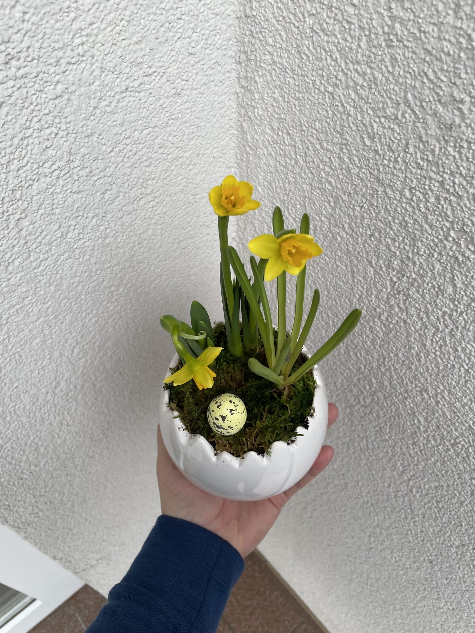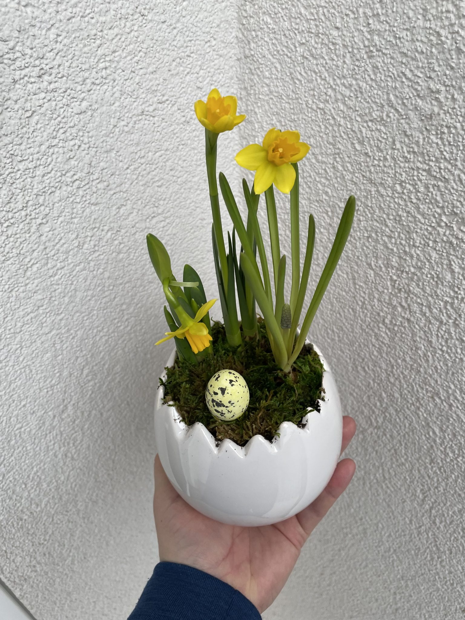 Narcizų kompozicija kiaušinio formos vazonėlyje. Puiki dovana Velykų ir pavasario proga.