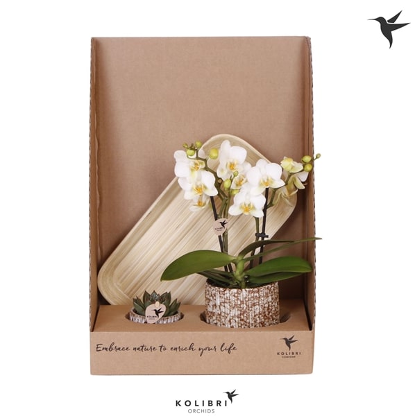Baltos orchidėjos ir sukulento kompozicija.